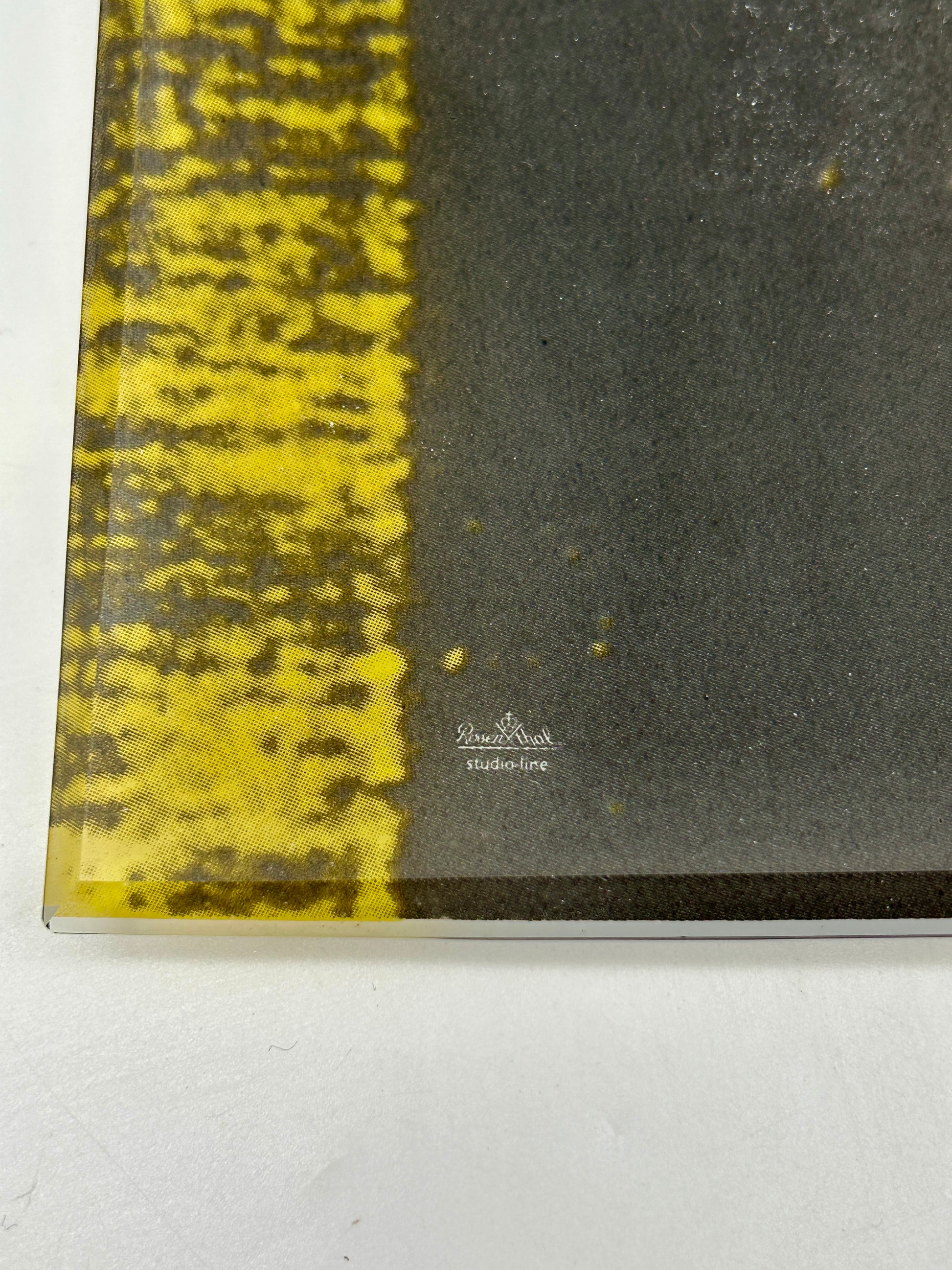 Made of glass, it features a stylized yellow head of Andy Warhol, an iconic motif of pop art aesthetics. It can also be used as a large catchall.