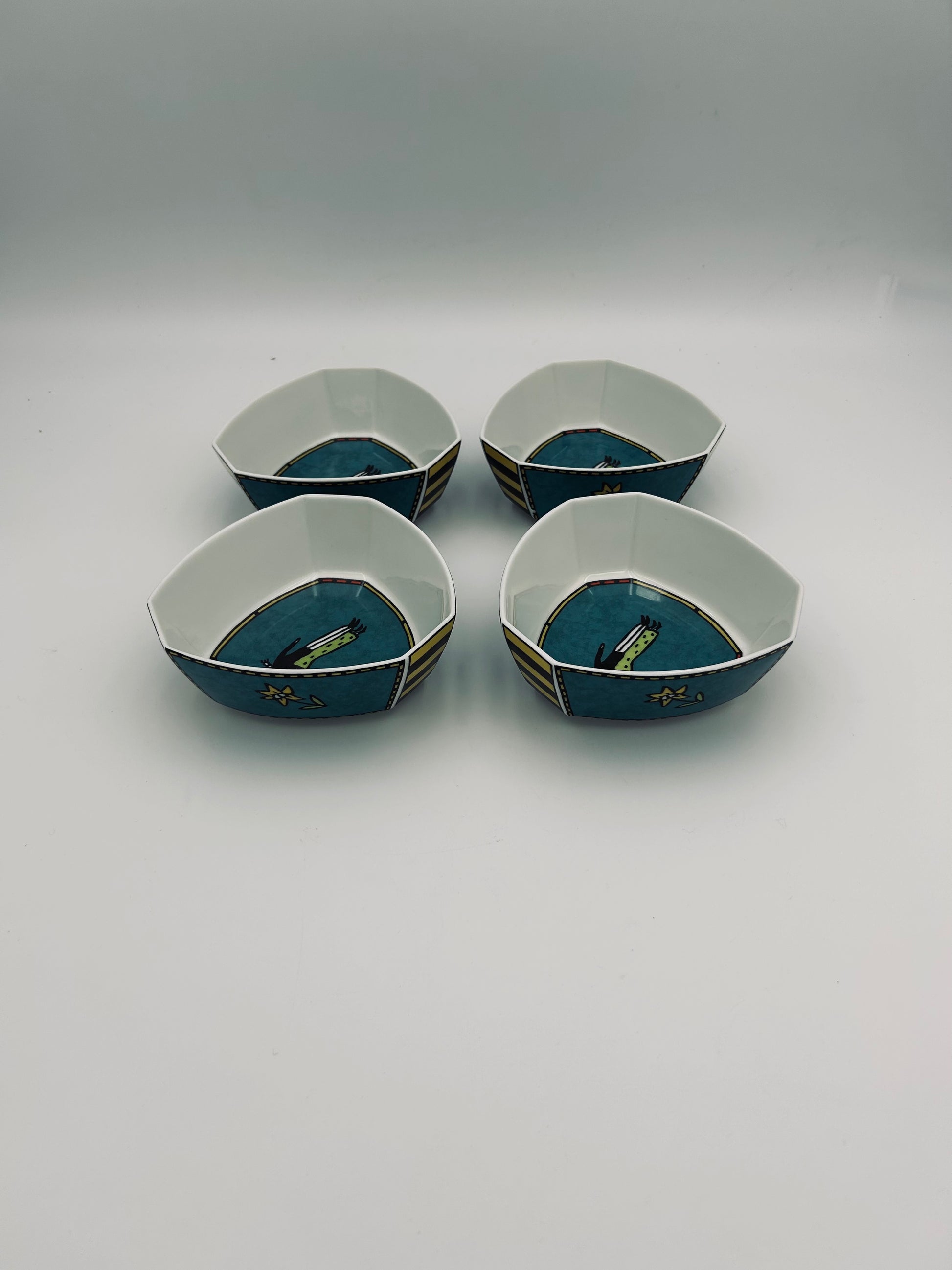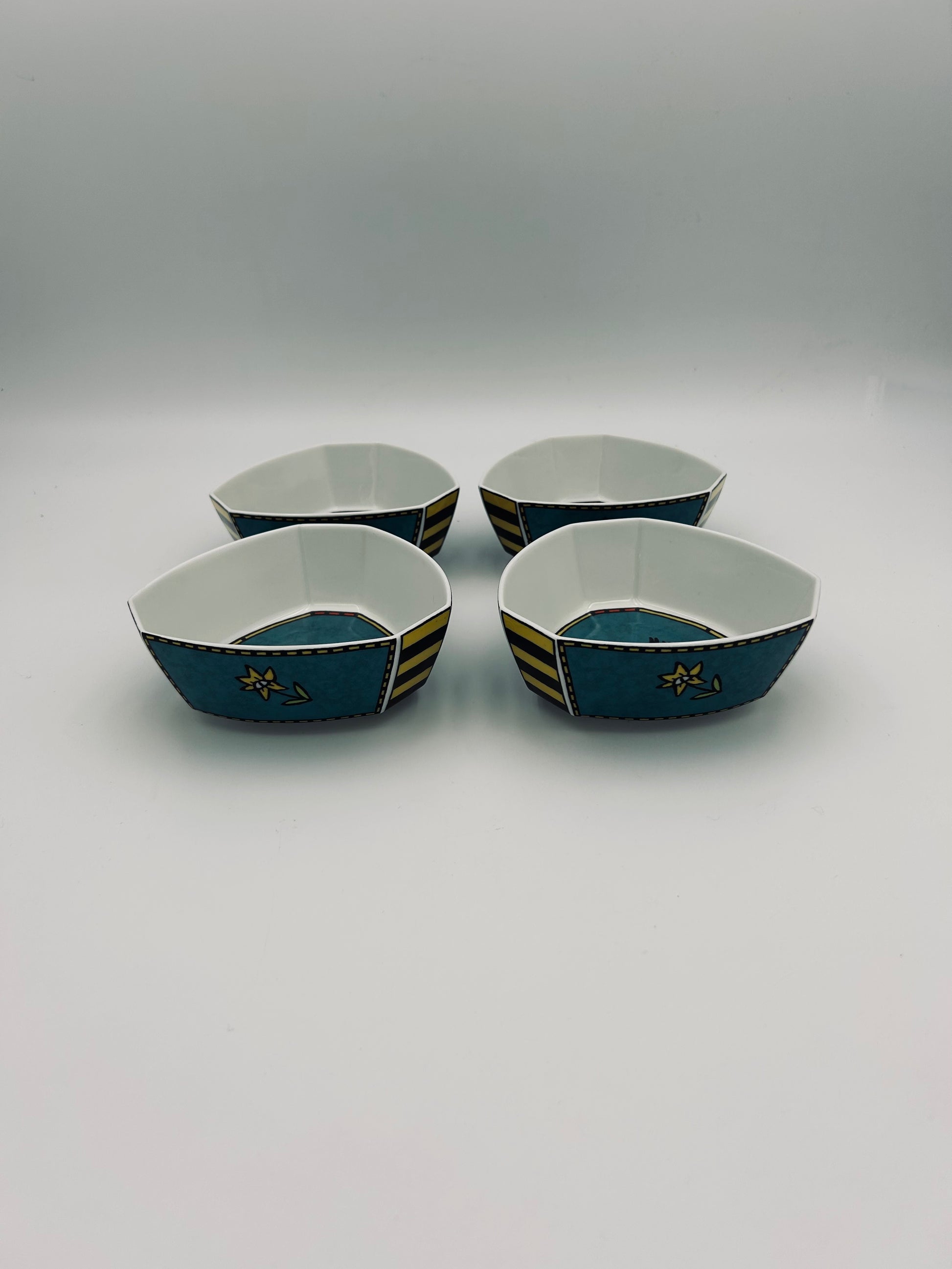 These ramekins are distinguished by their original shapes and vibrant patterns, characteristic of the style of Dorothy Hafner and the Memphis movement.