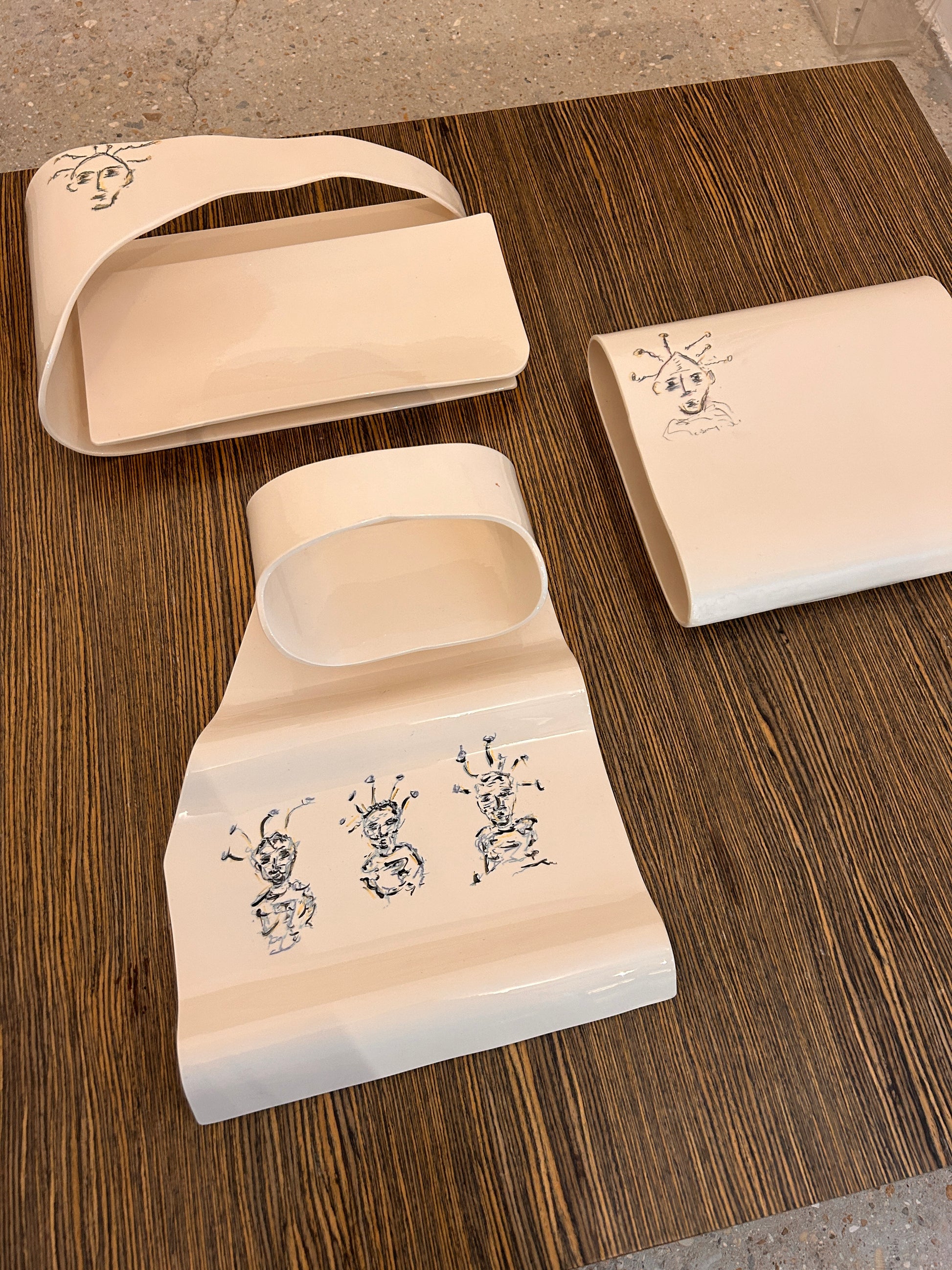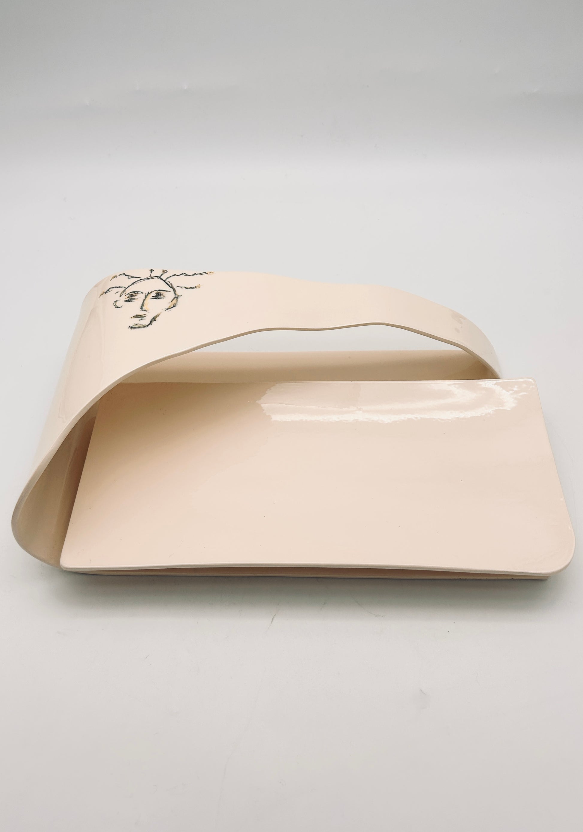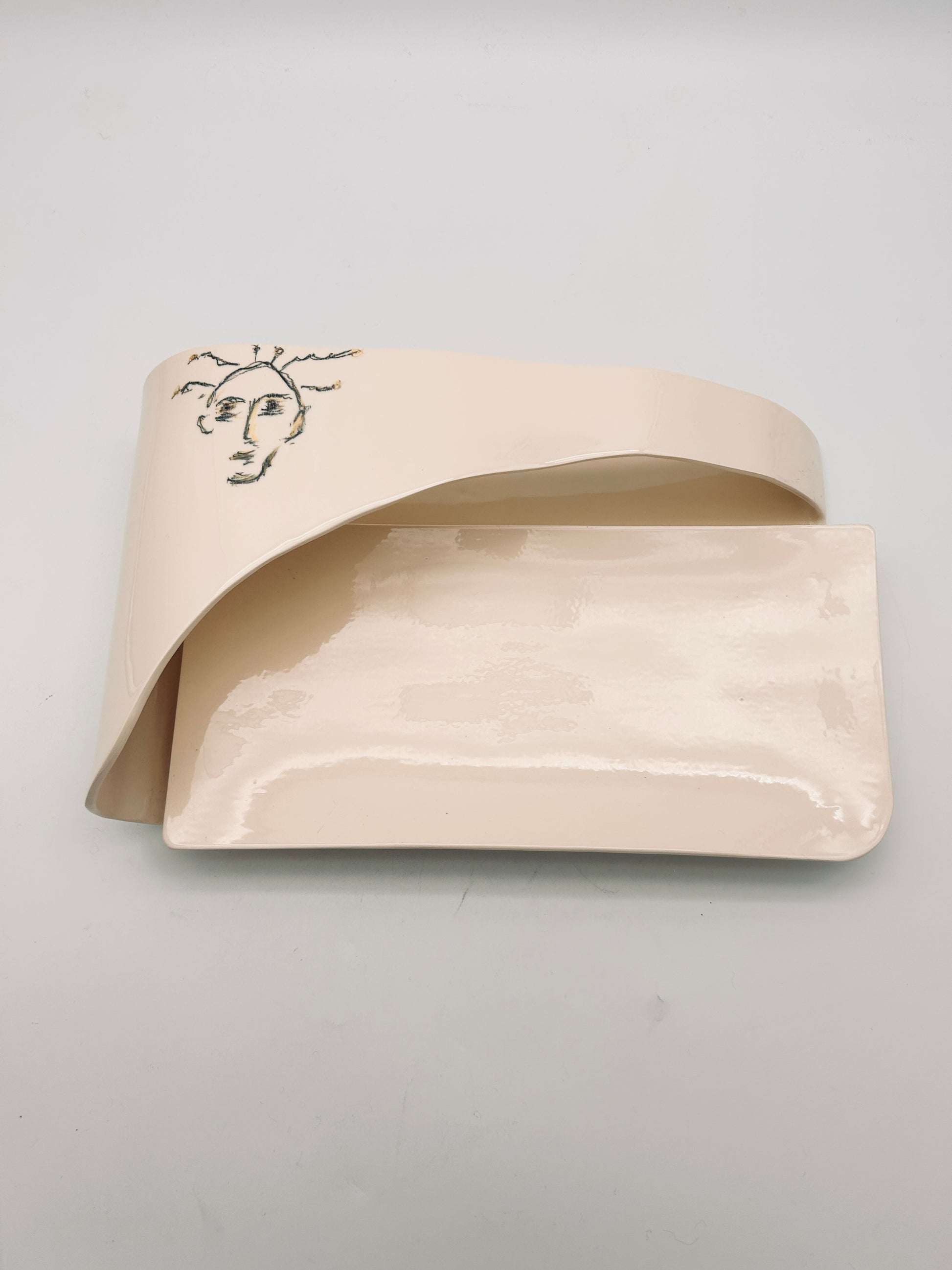 Chaque assiette présente un motif unique de personnage, alien, avatar ou arlequin, évoquant le futur graphique, avec une finition renversée distinctive qui ajoute une dimension sculpturale à la pièce.
