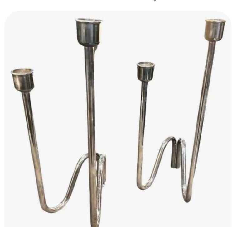 Réalisé en métal argenté, ce chandelier à double bougies se distingue par ses lignes élancées et fluides, évoquant une flamme en mouvement.