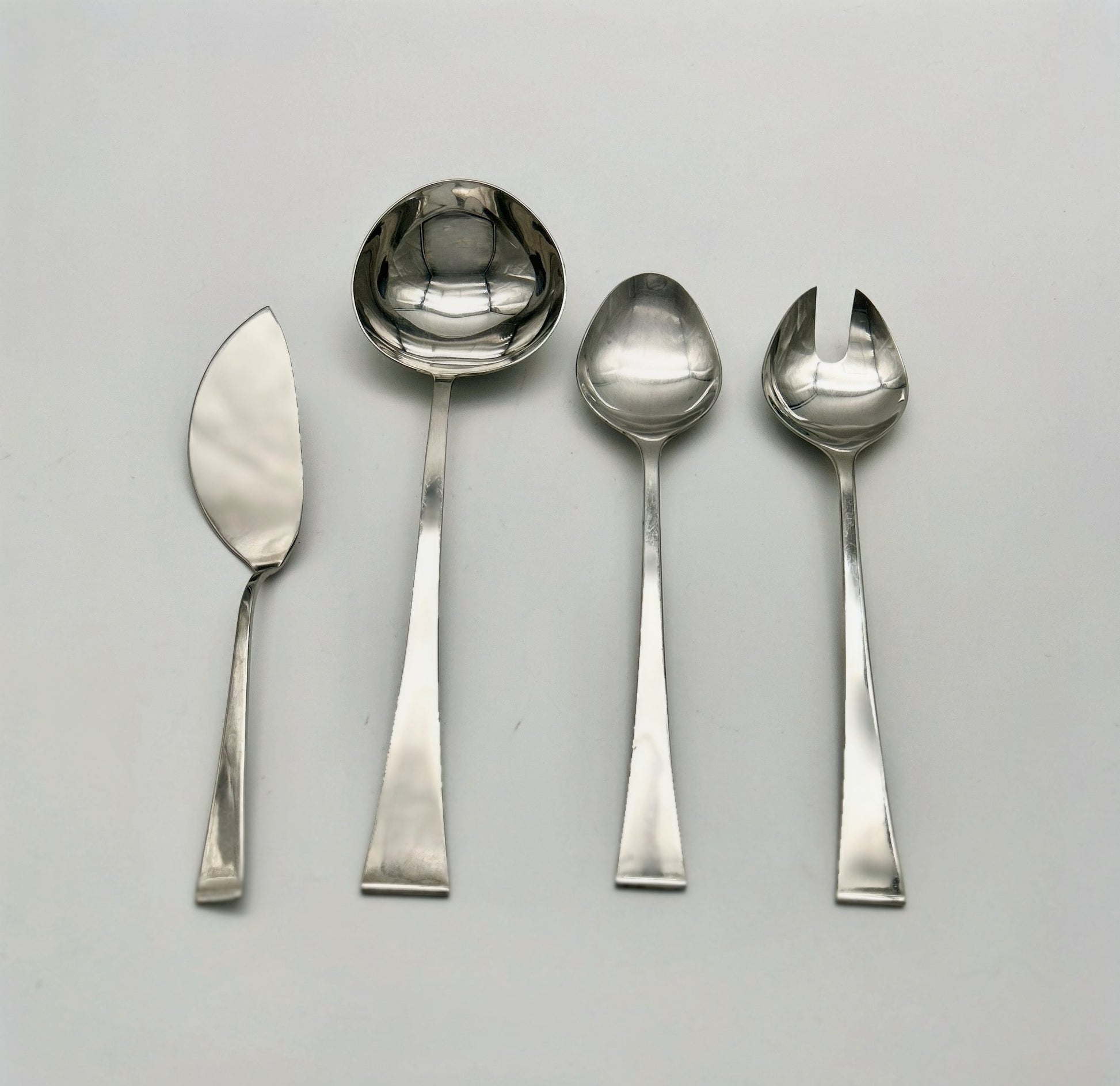 Chaque pièce, du couteau à la cuillère, se distingue par une géométrie épurée qui séduit l'œil par sa pureté de lignes.