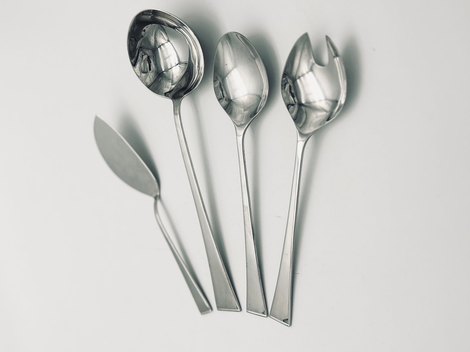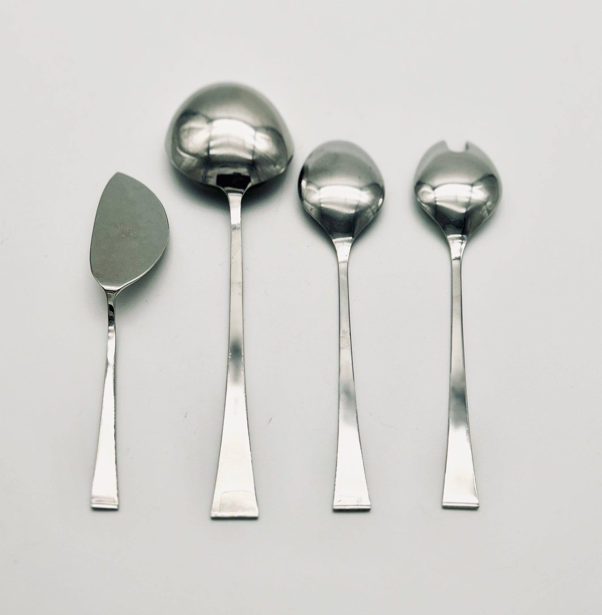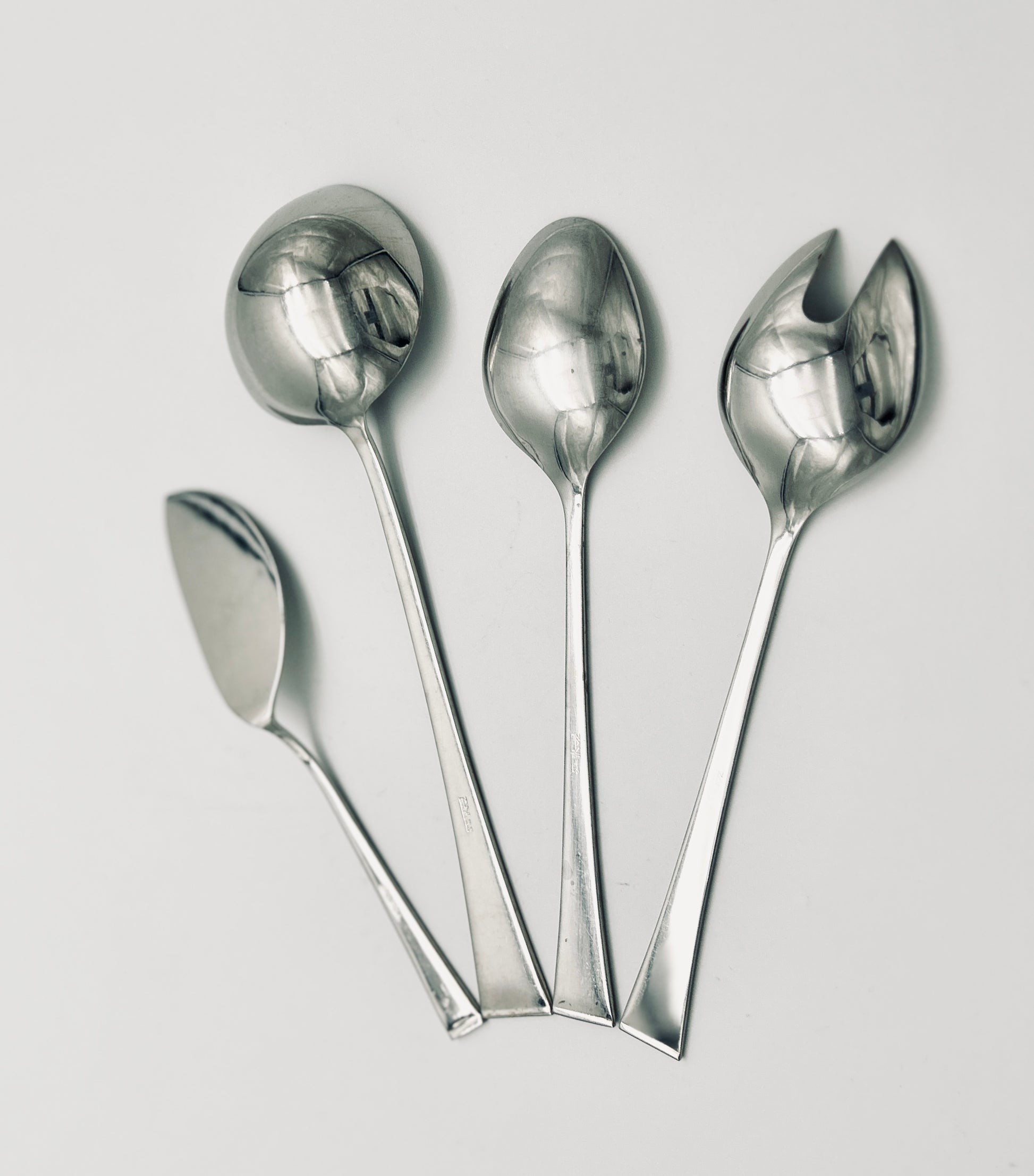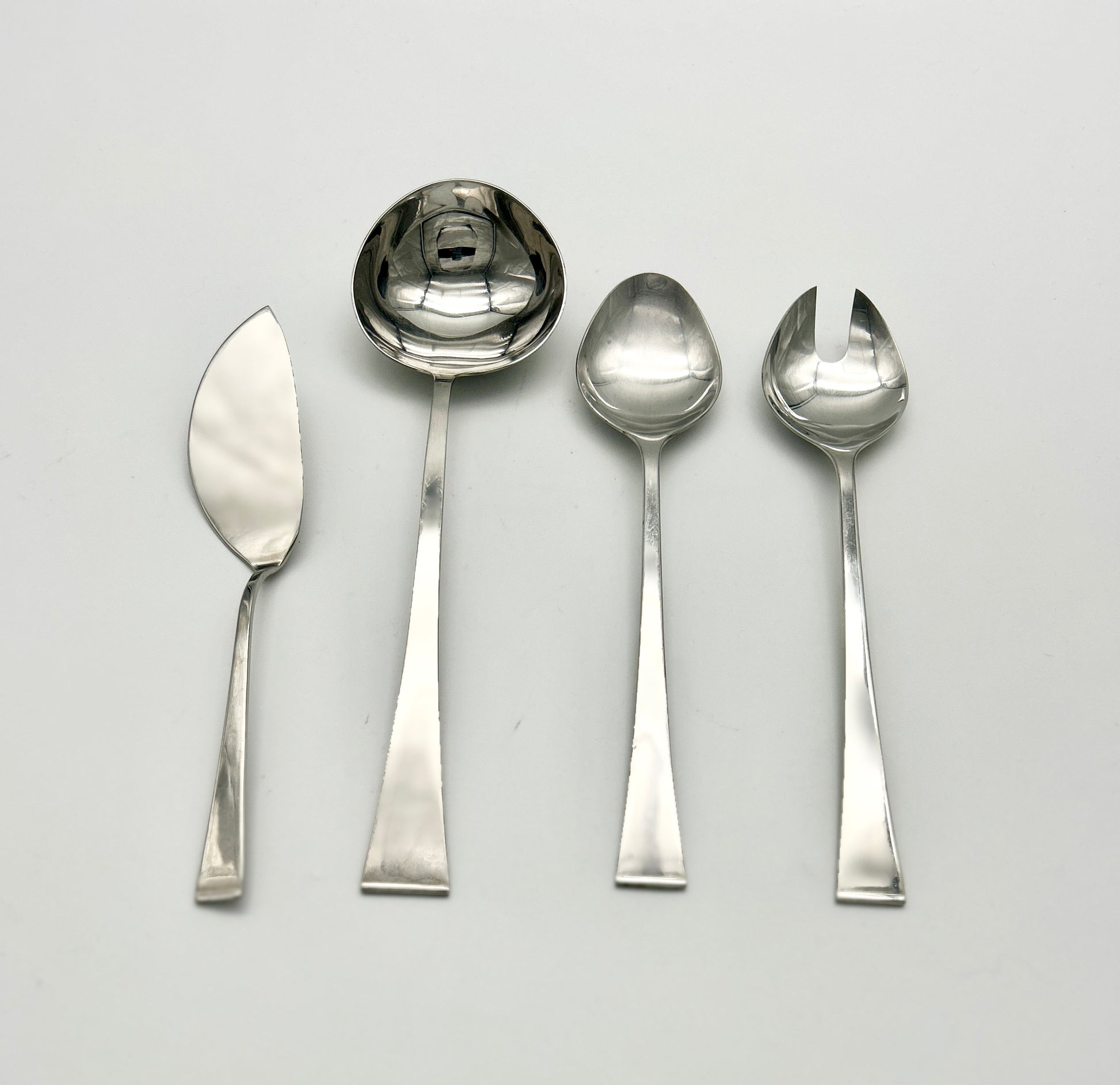 Ces couverts de service en acier inoxydable, composés d'une louche, d'une pelle et de couverts à salade reflètent une élégance minimaliste et intemporelle digne des créations les plus emblématiques du design italien.