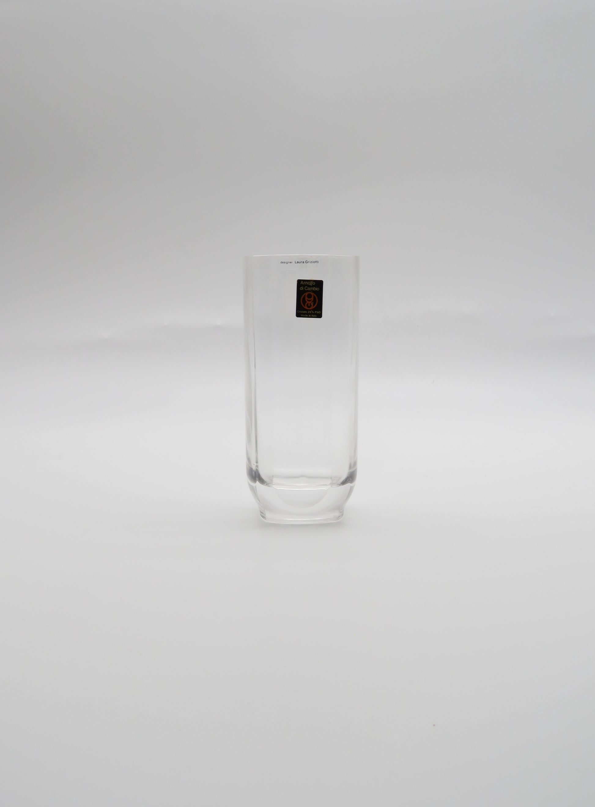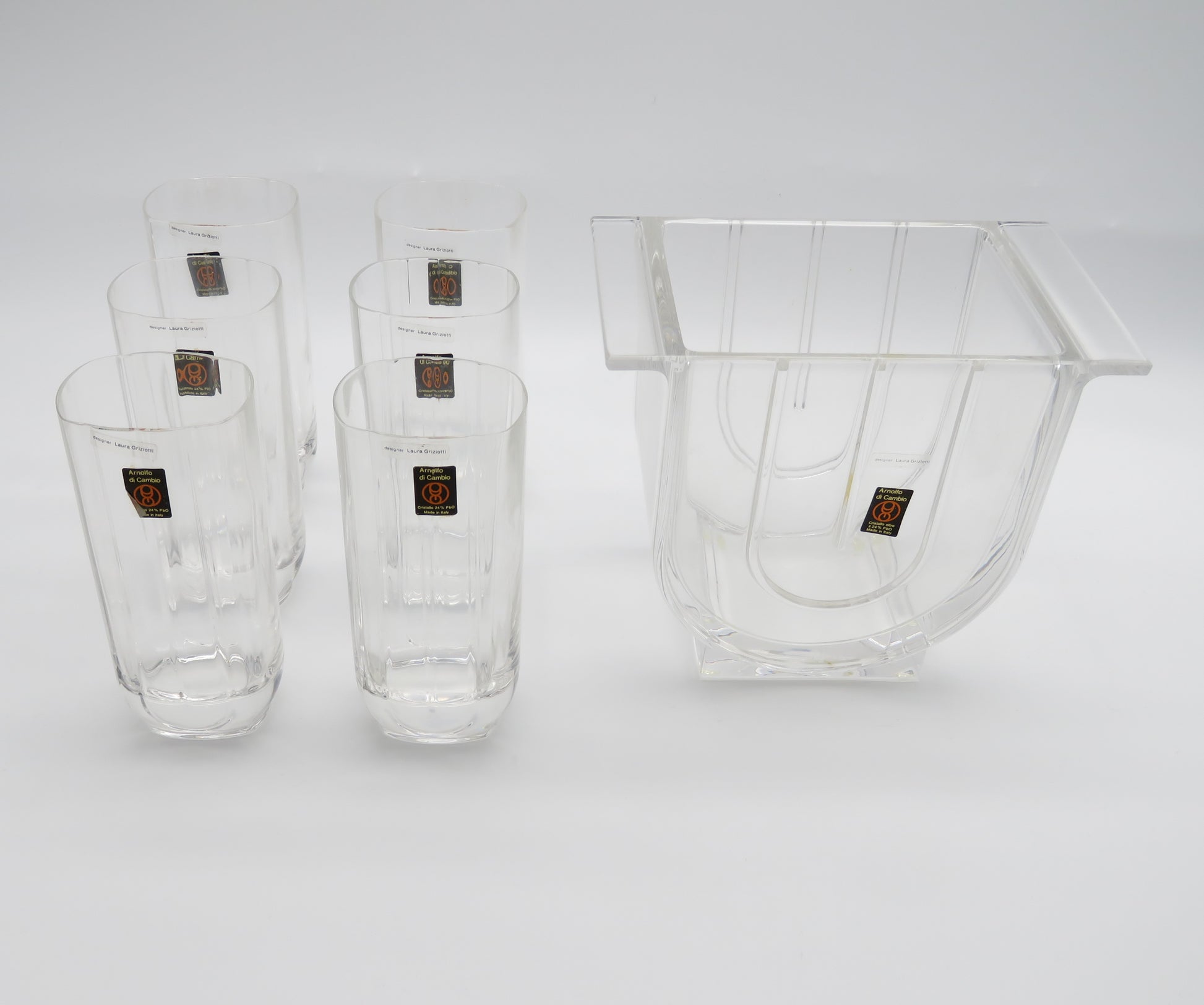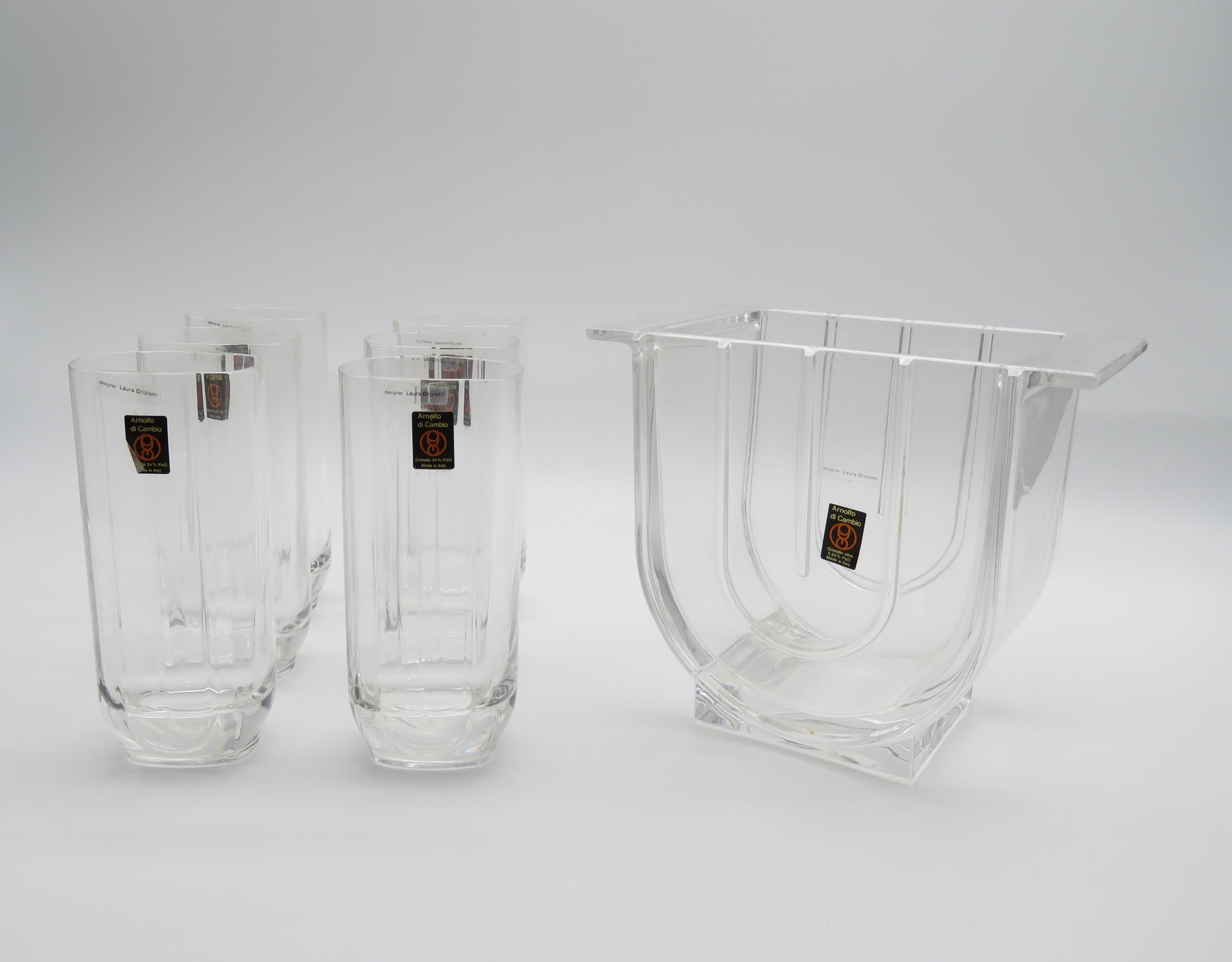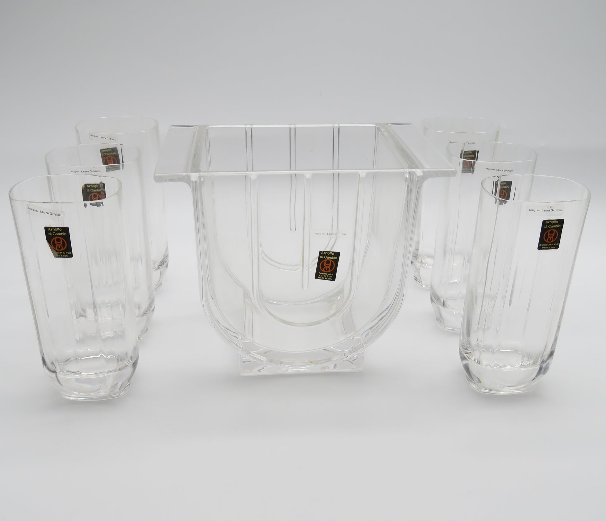 Plongez dans l'élégance des années 1980 avec cet ensemble exceptionnel de verres Collins et seau à glace, conçu par la talentueuse designer italienne Laura Griziotti pour la cristallerie Arnolfo di Cambio.