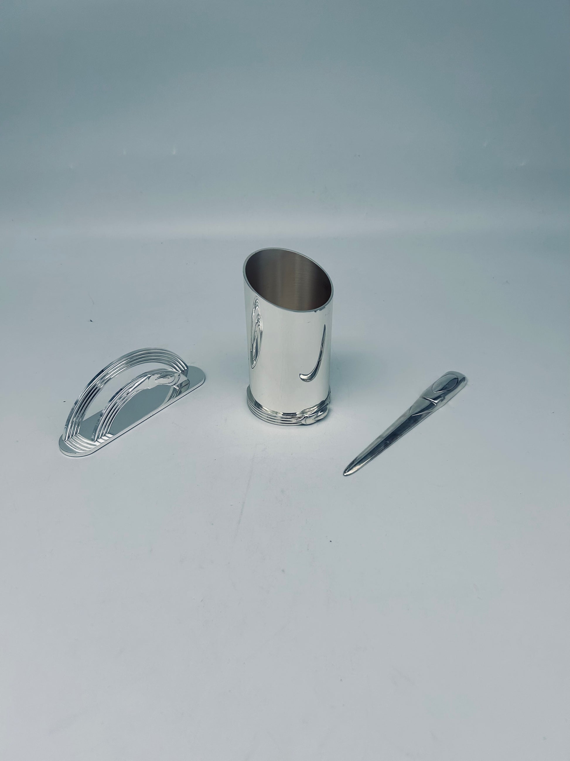 Il est composé de trois pièces, dont un pot à crayons, un coupe-papier et un porte courrier.
