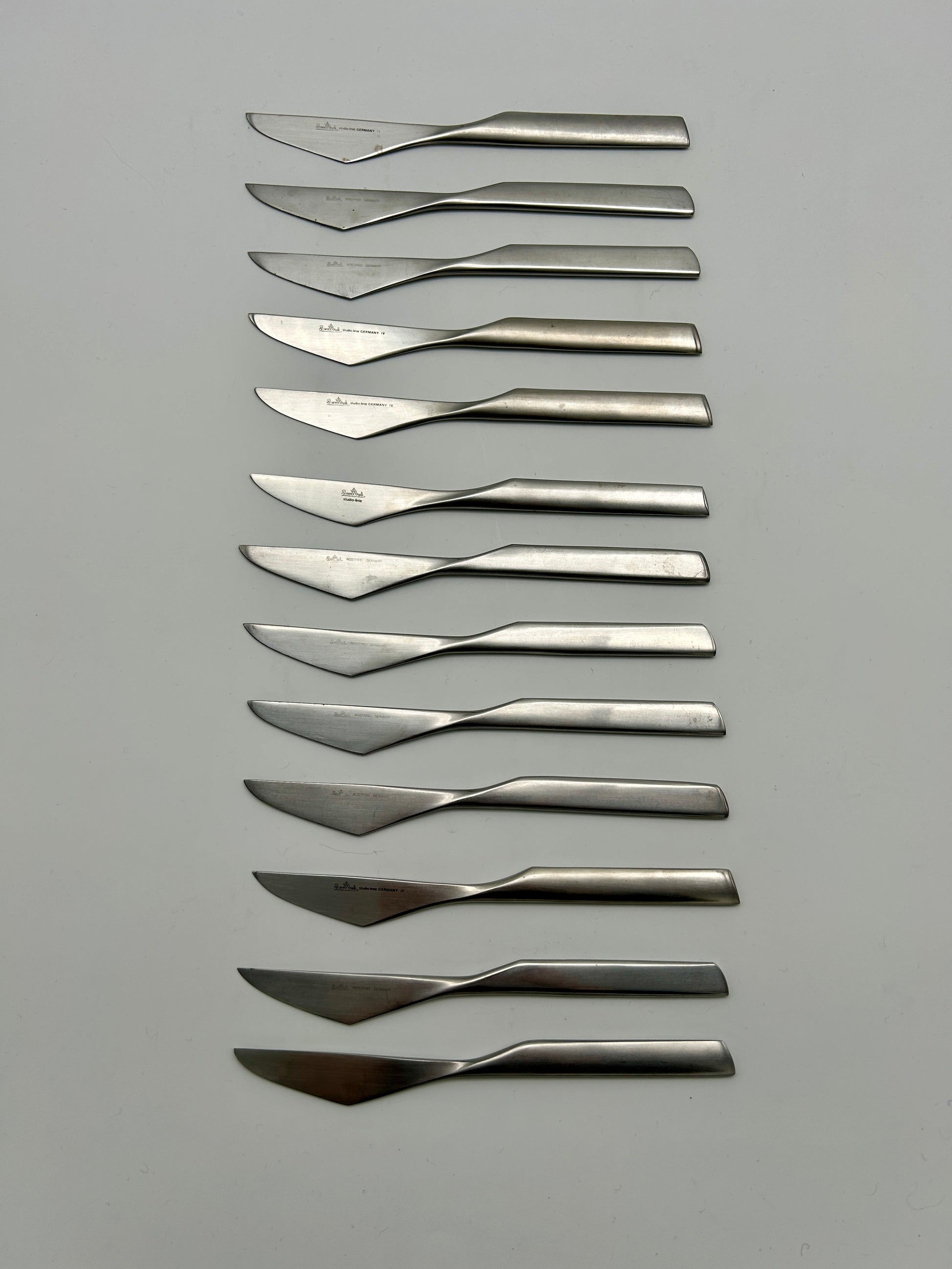 Fabriqués en acier inoxydable, ces couteaux se caractérisent par des lignes fluides et dynamiques, reflet du style organique et minimaliste de Wirkkala. Leur silhouette incurvée assure une prise en main ergonomique, tout en ajoutant une touche élégante à l'art de la table.