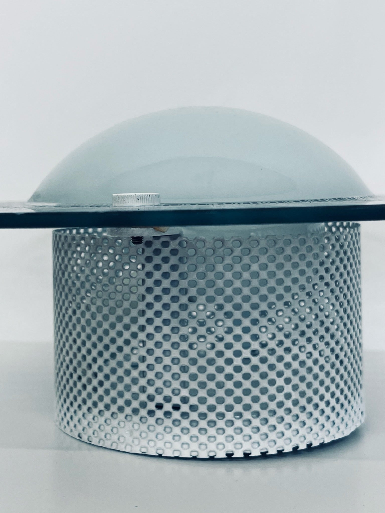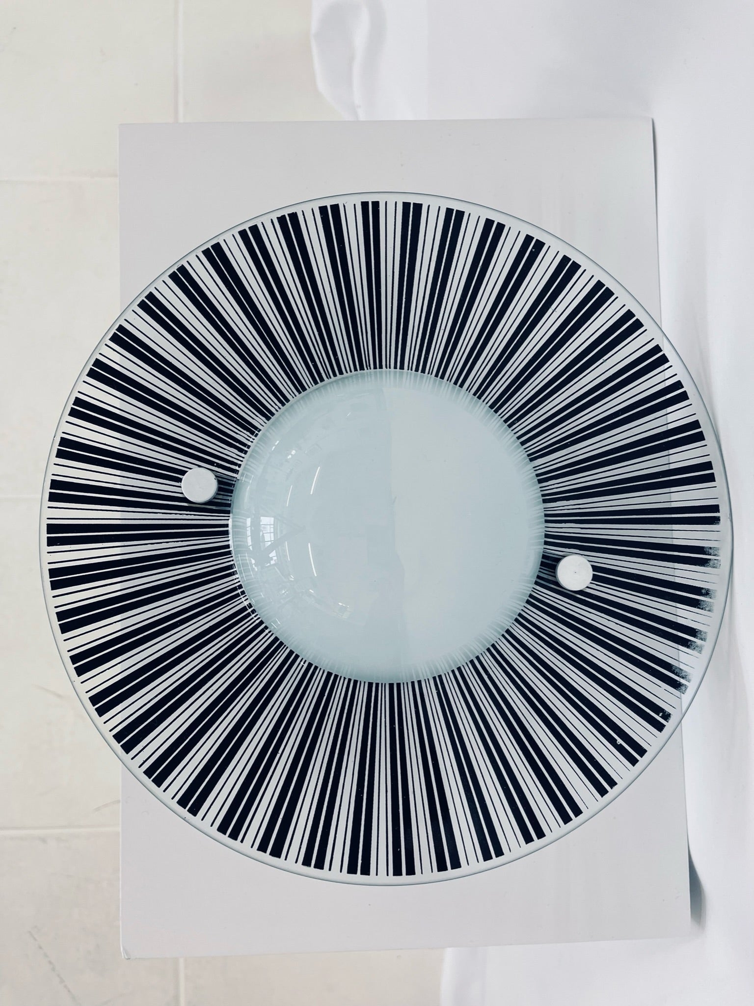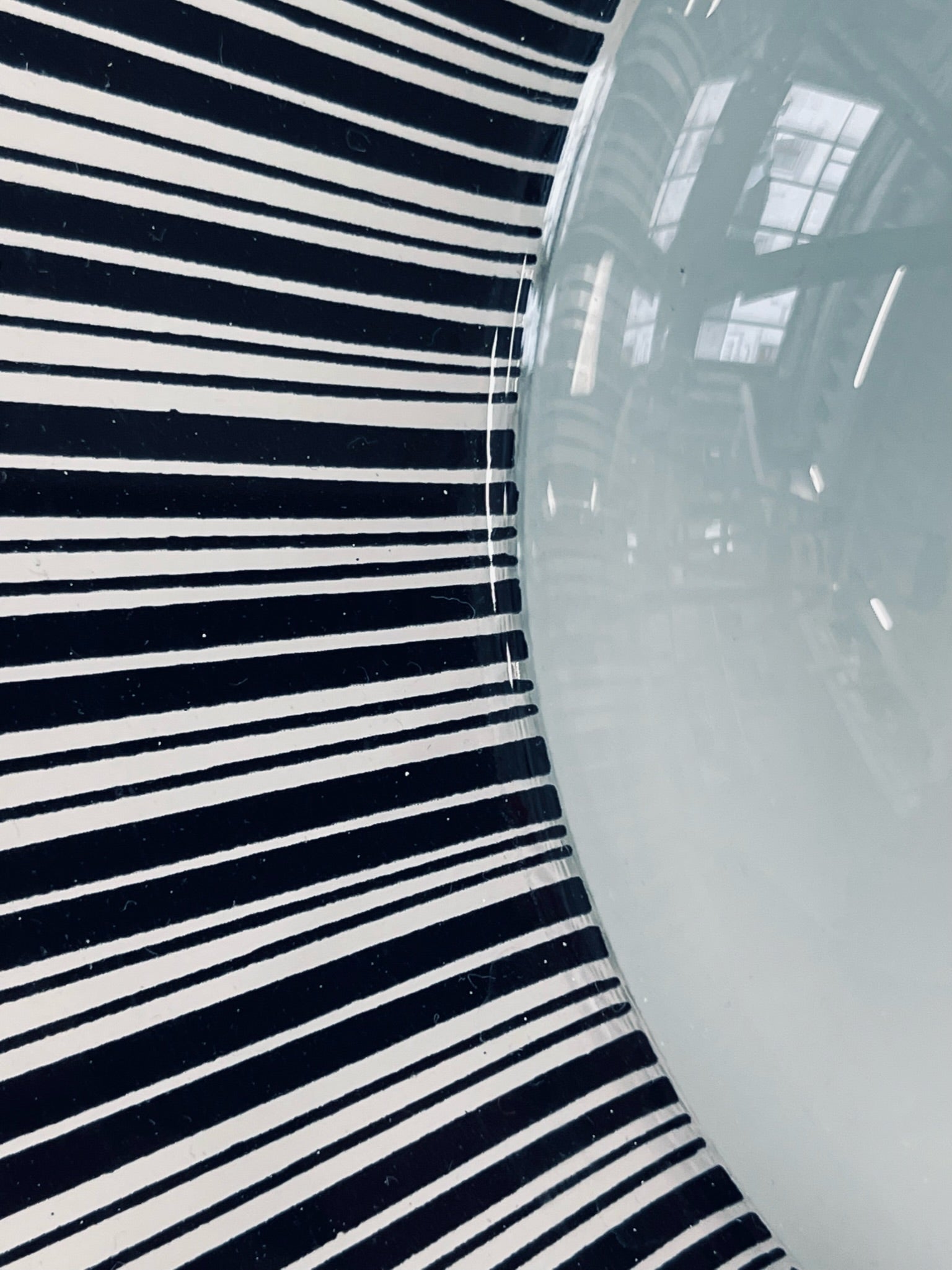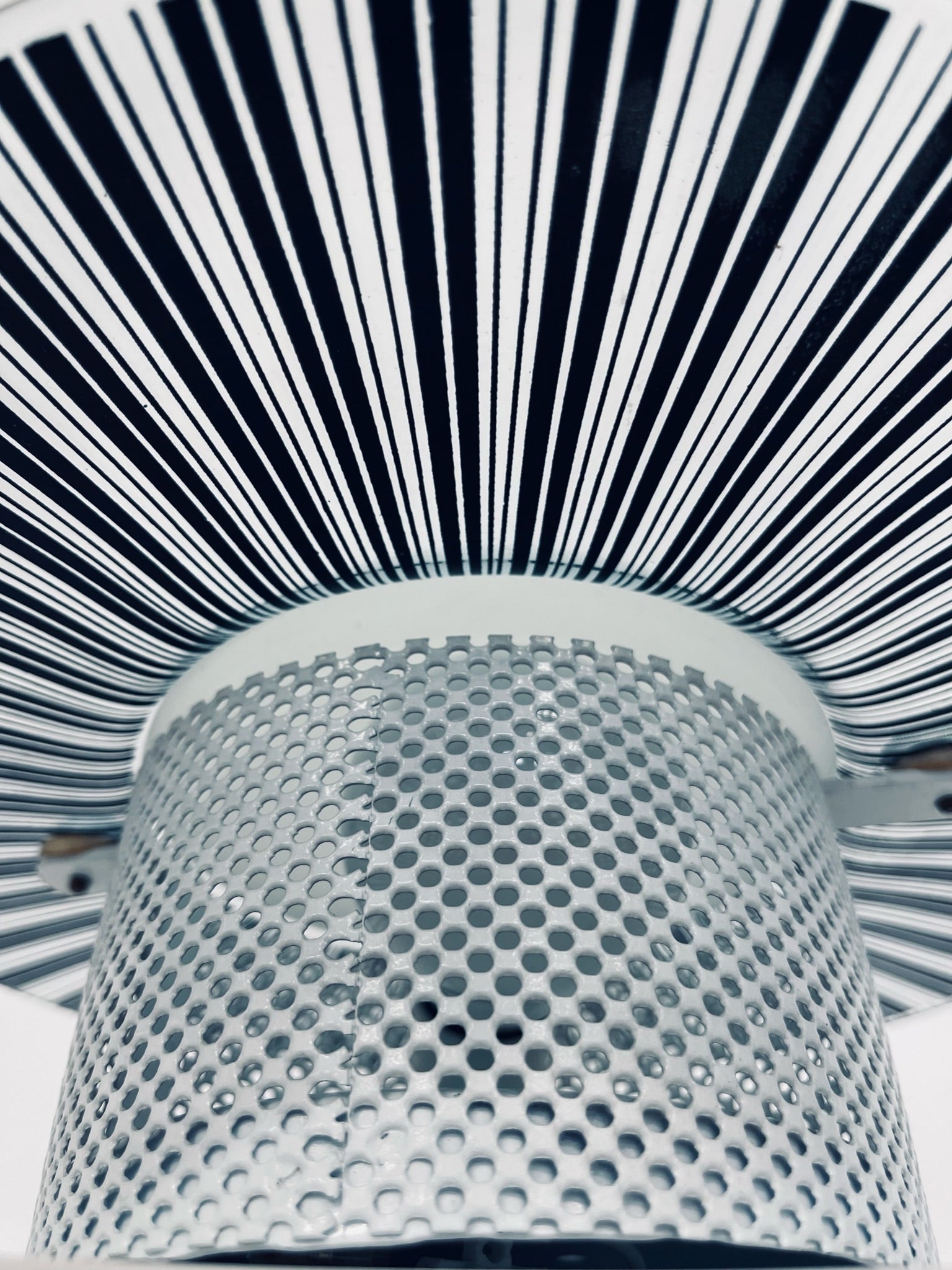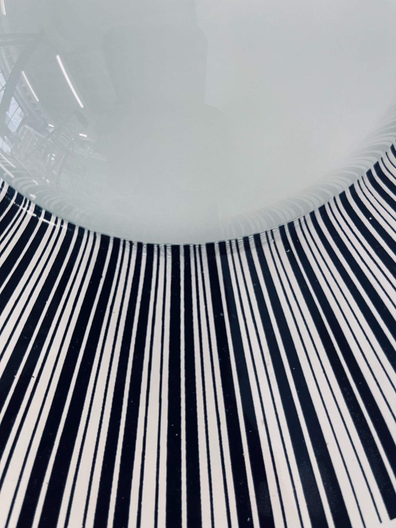 La structure en acier perforé blanc contraste harmonieusement avec le verre de Murano strié, créant un jeu de lumière subtil et raffiné.