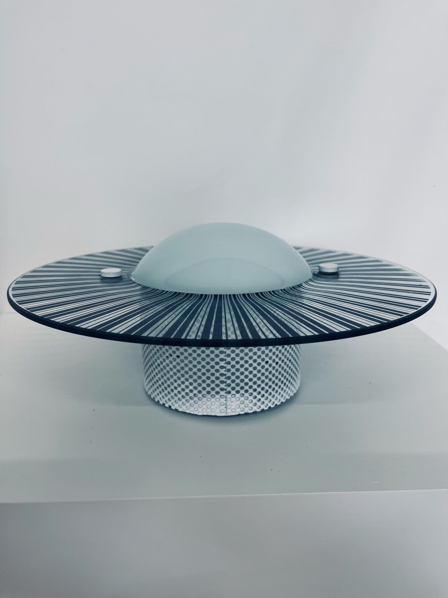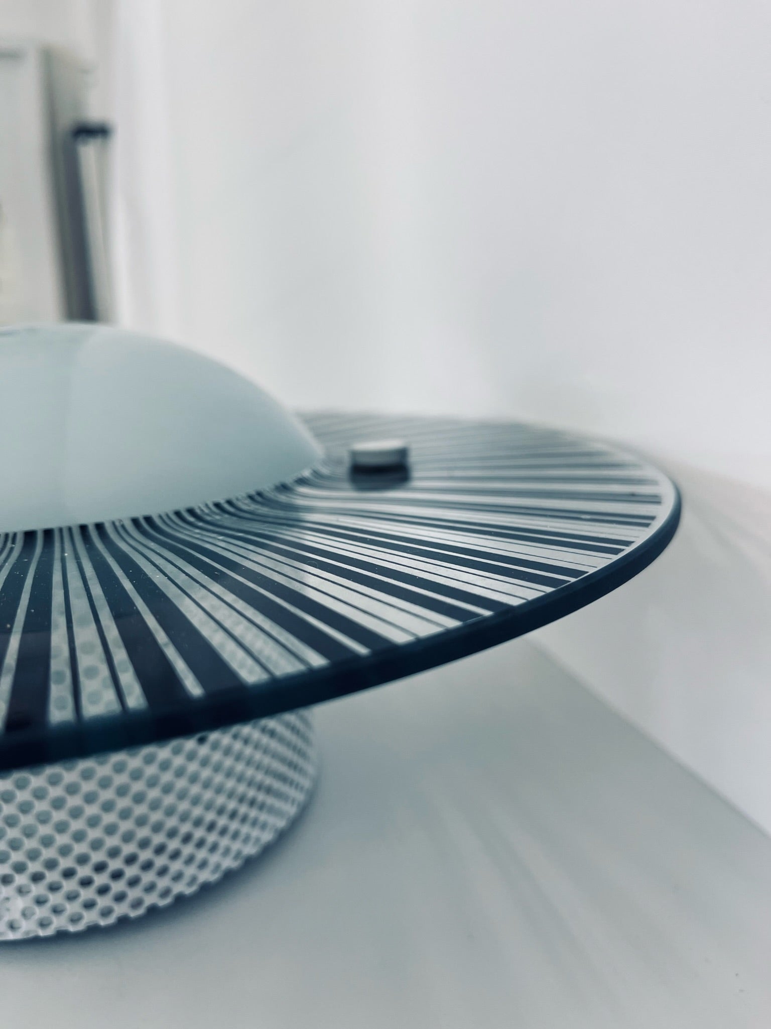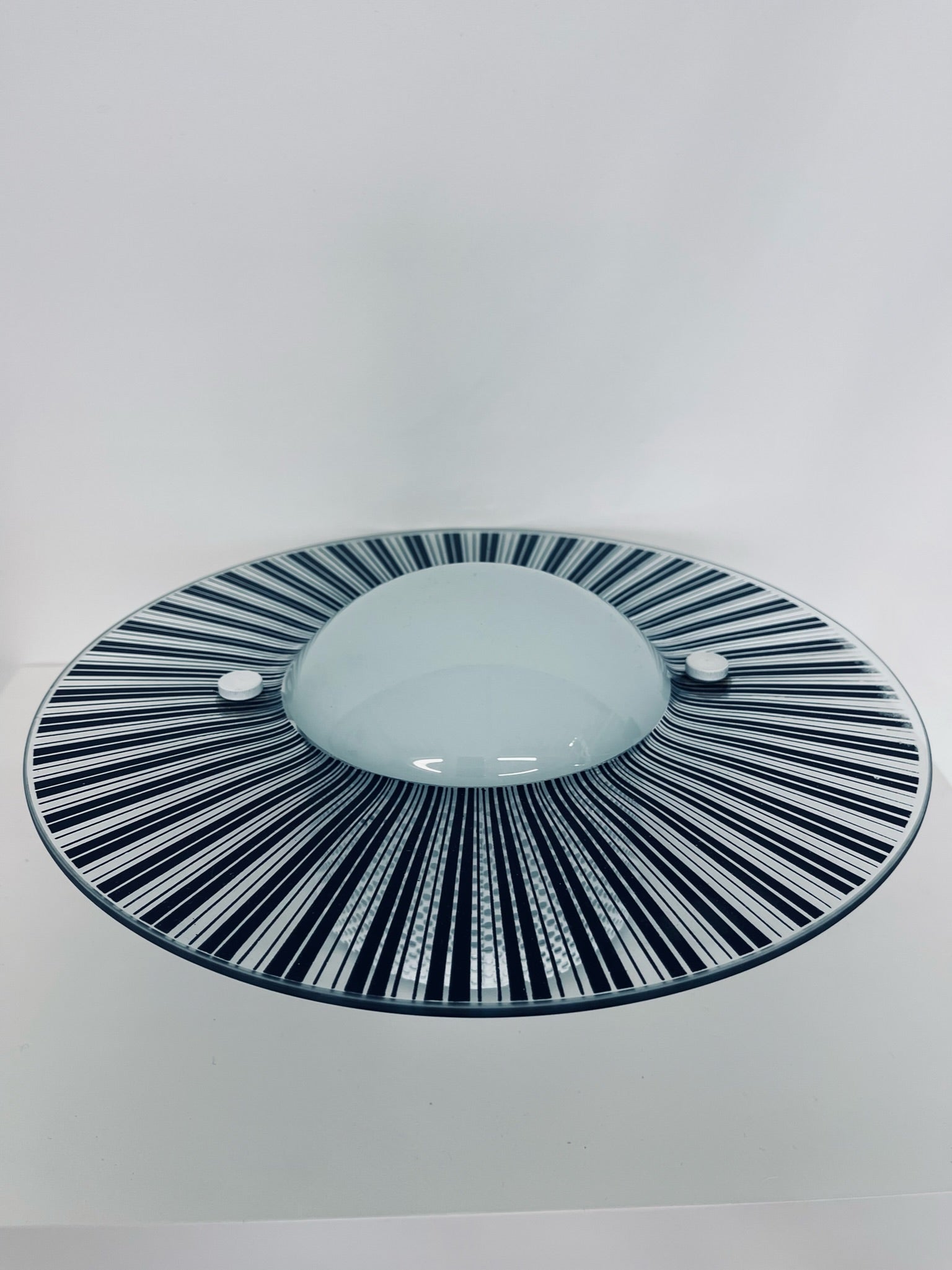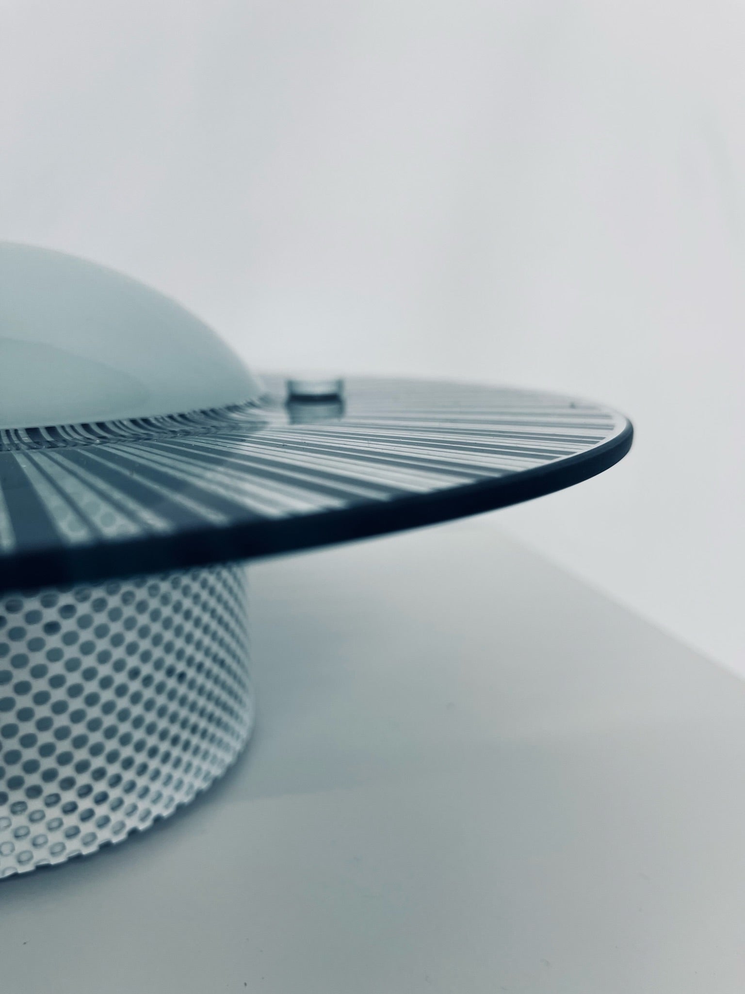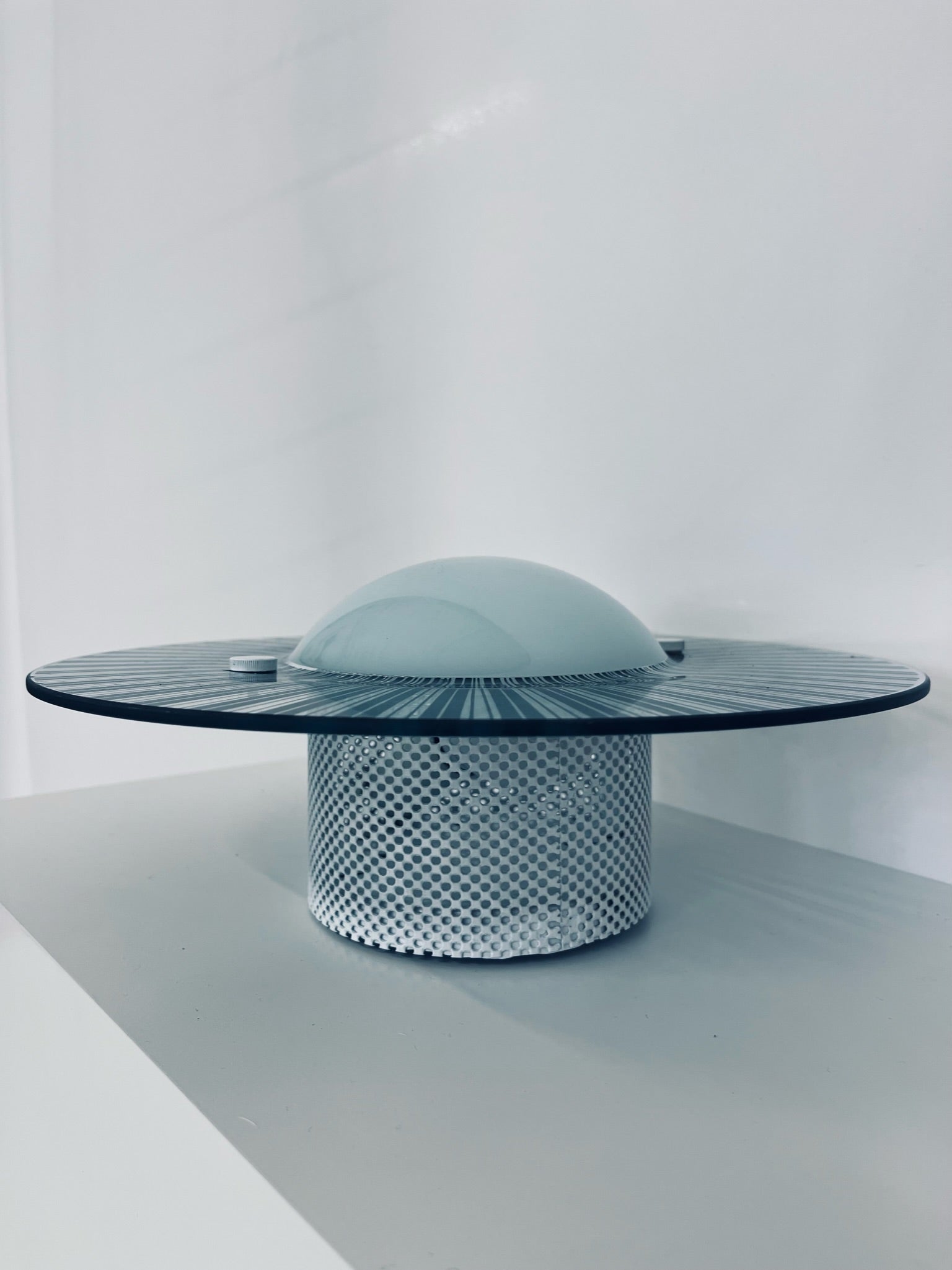 Cette applique ou plafonnier bicolore en verre de Murano et acier perforé est typique du design italien des années 1980, et allie élégance et fonctionnalité.