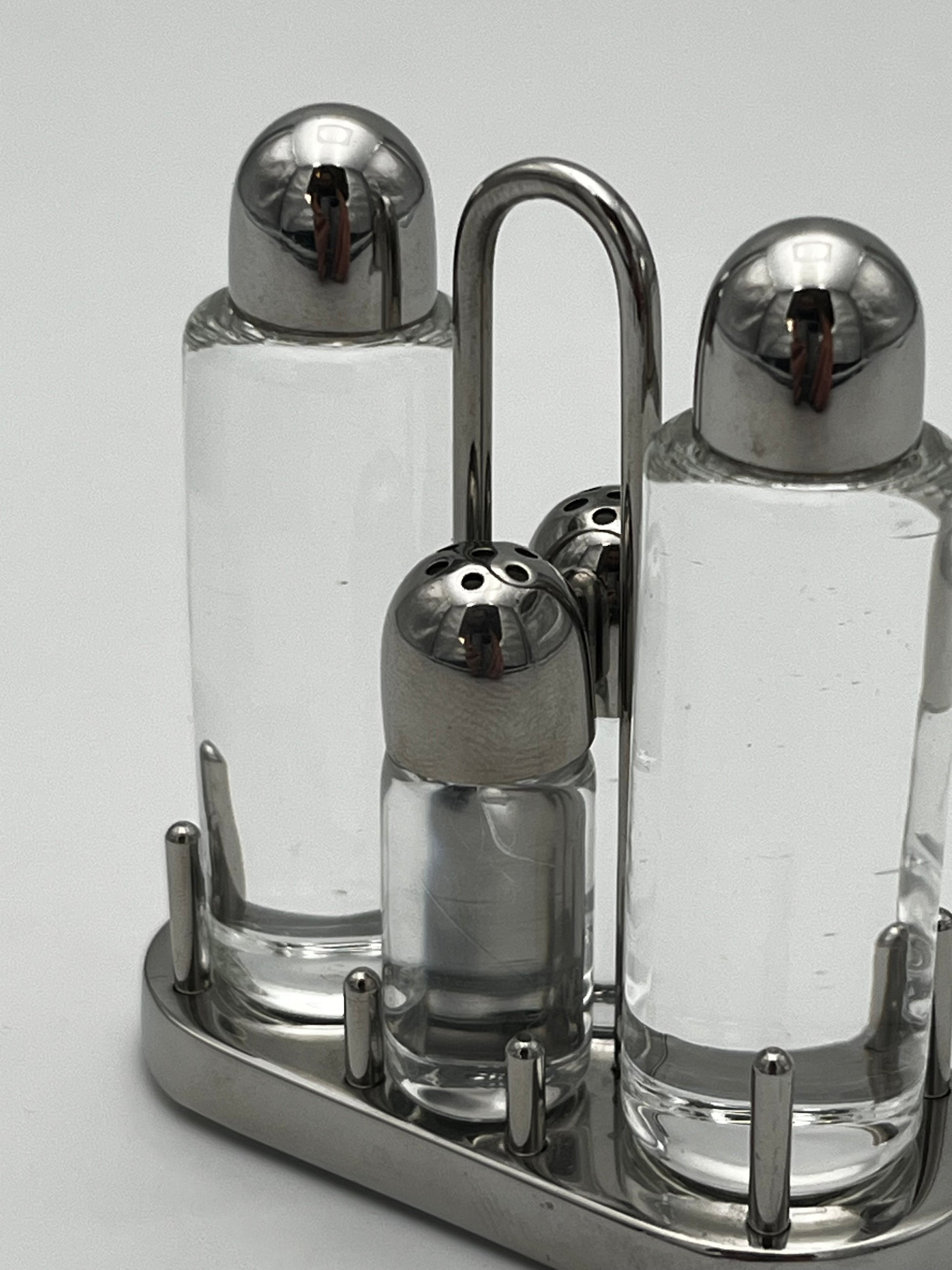 Miniature set à condiments, designé par Ettore Sottsass pour Alessi.