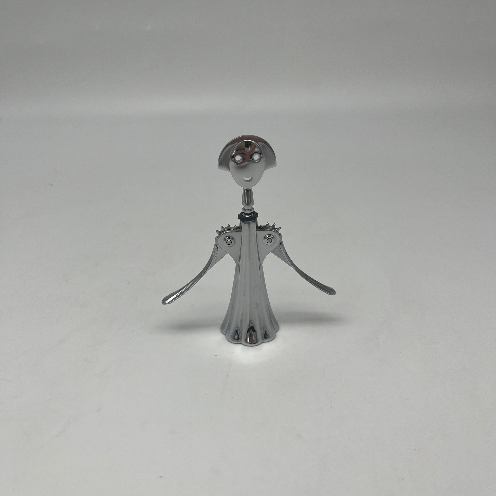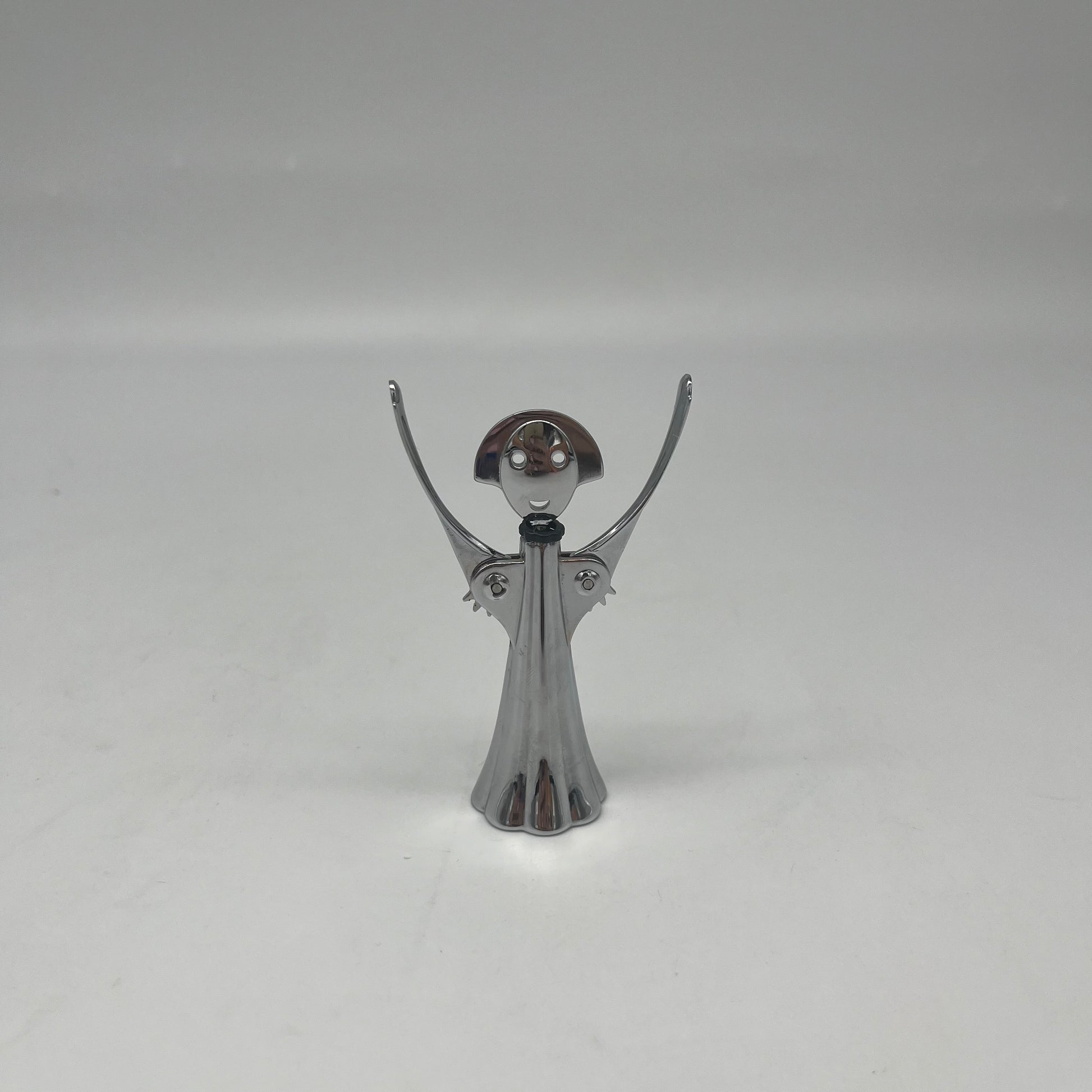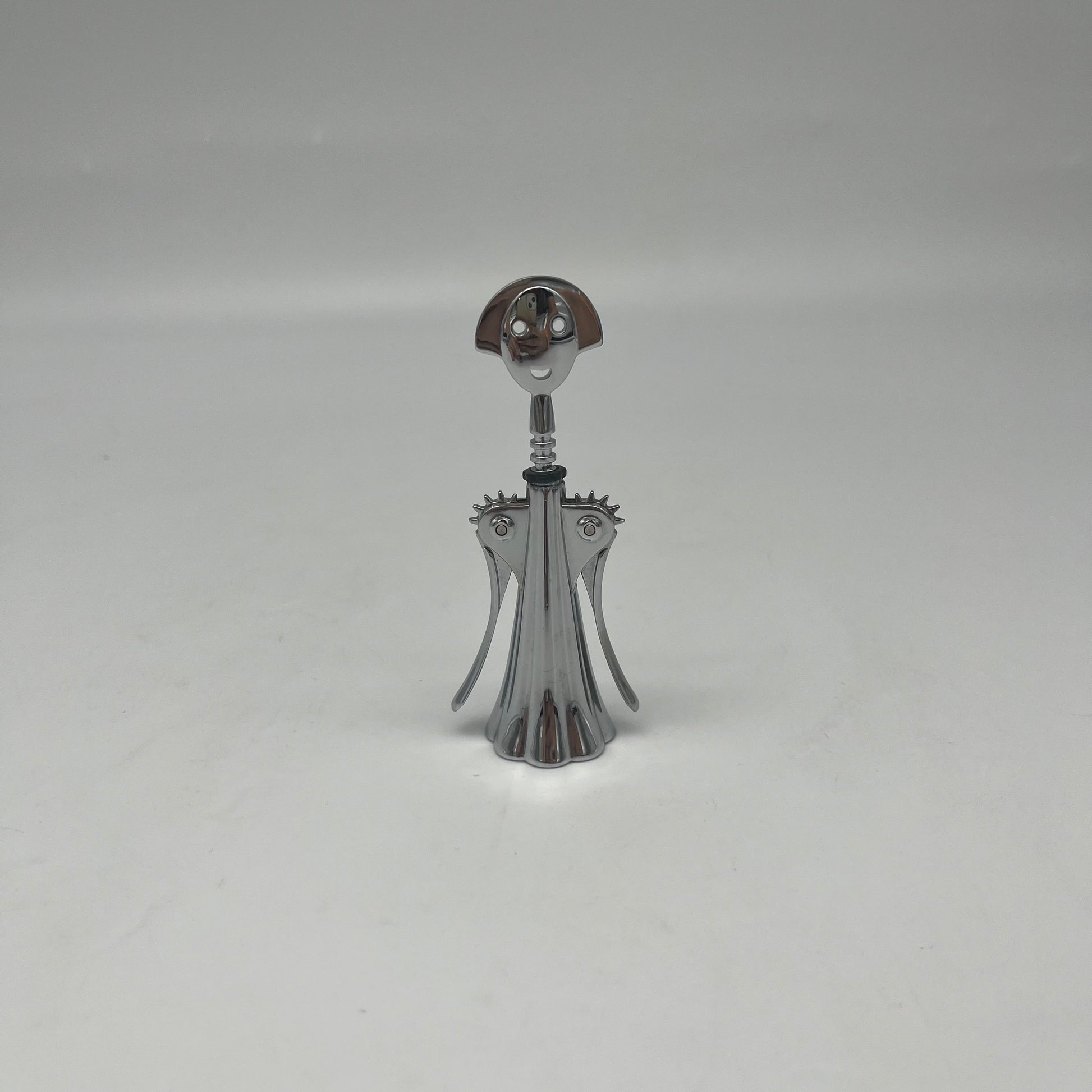Le design de l’ouvre-bouteille miniature Anna G. se distingue par sa silhouette stylisée et sa finition chromée brillante.