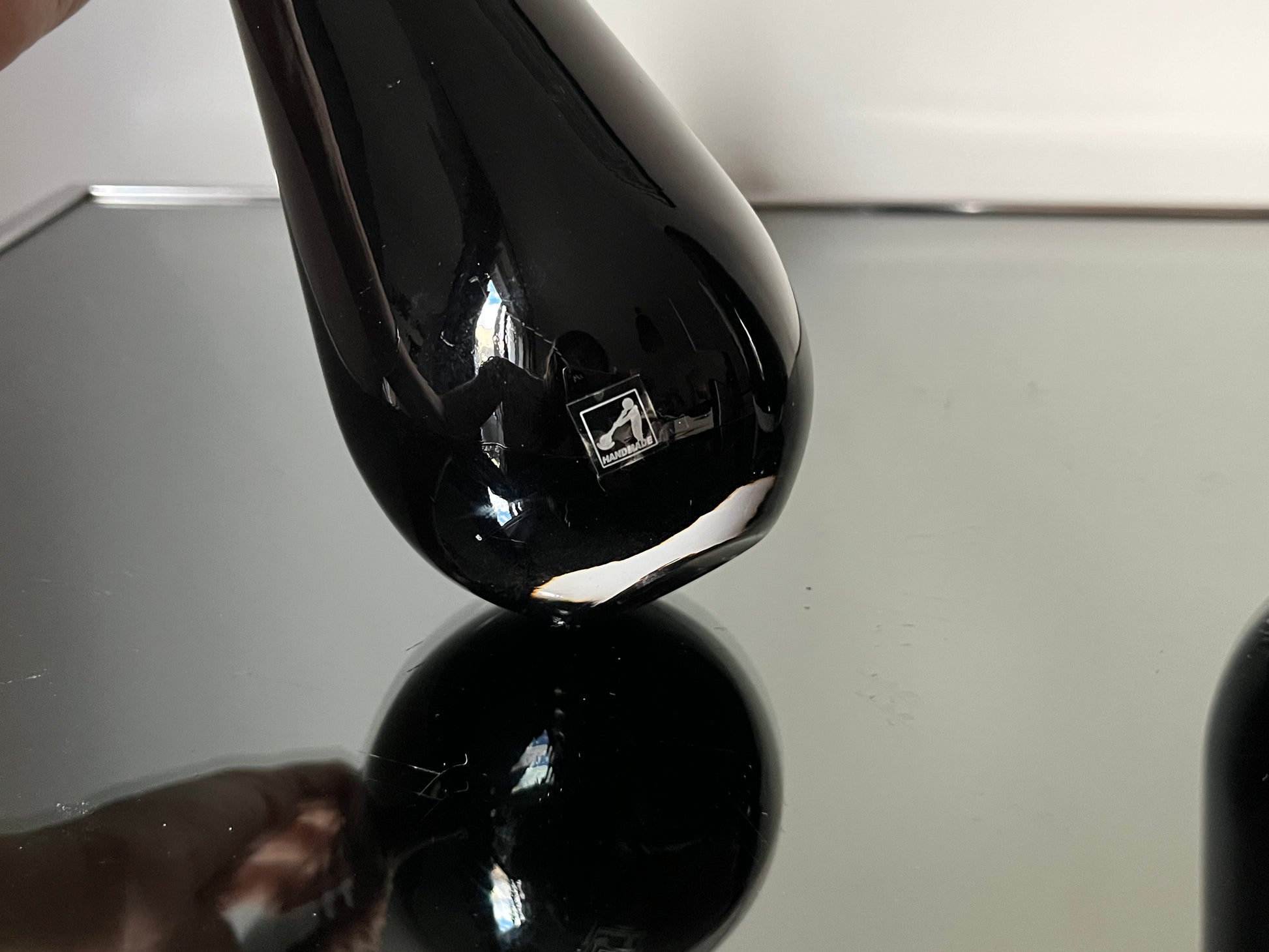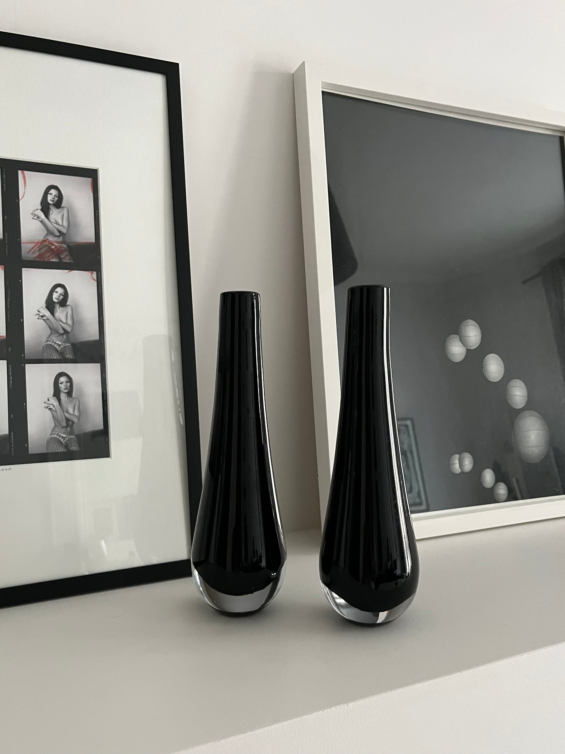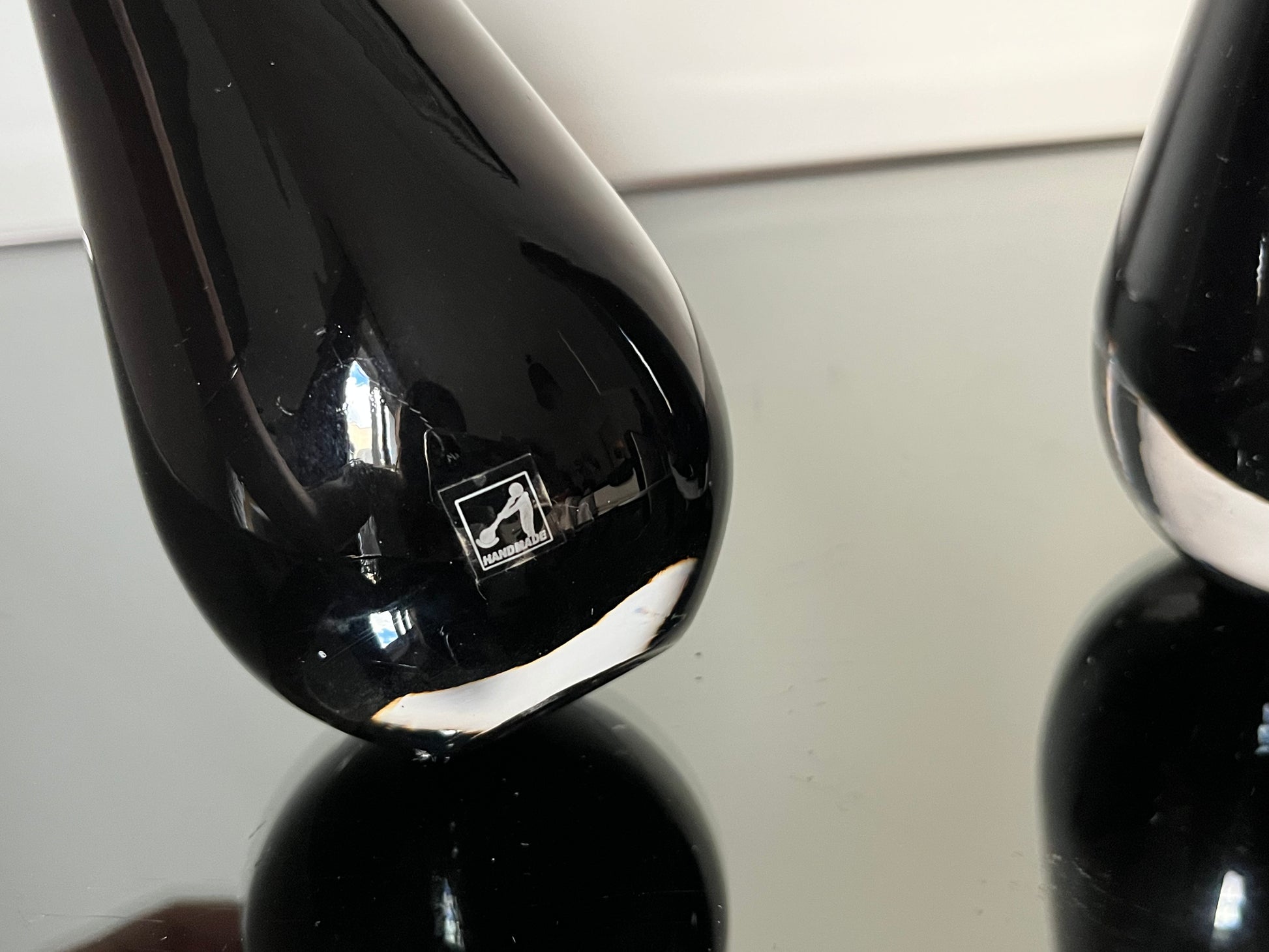 Soufflés à la main par les maîtres verriers vénitiens, ils se distinguent par leur noir profond, brillant et mystérieux, qui souligne la pureté de leurs lignes et leur élégance minimaliste.