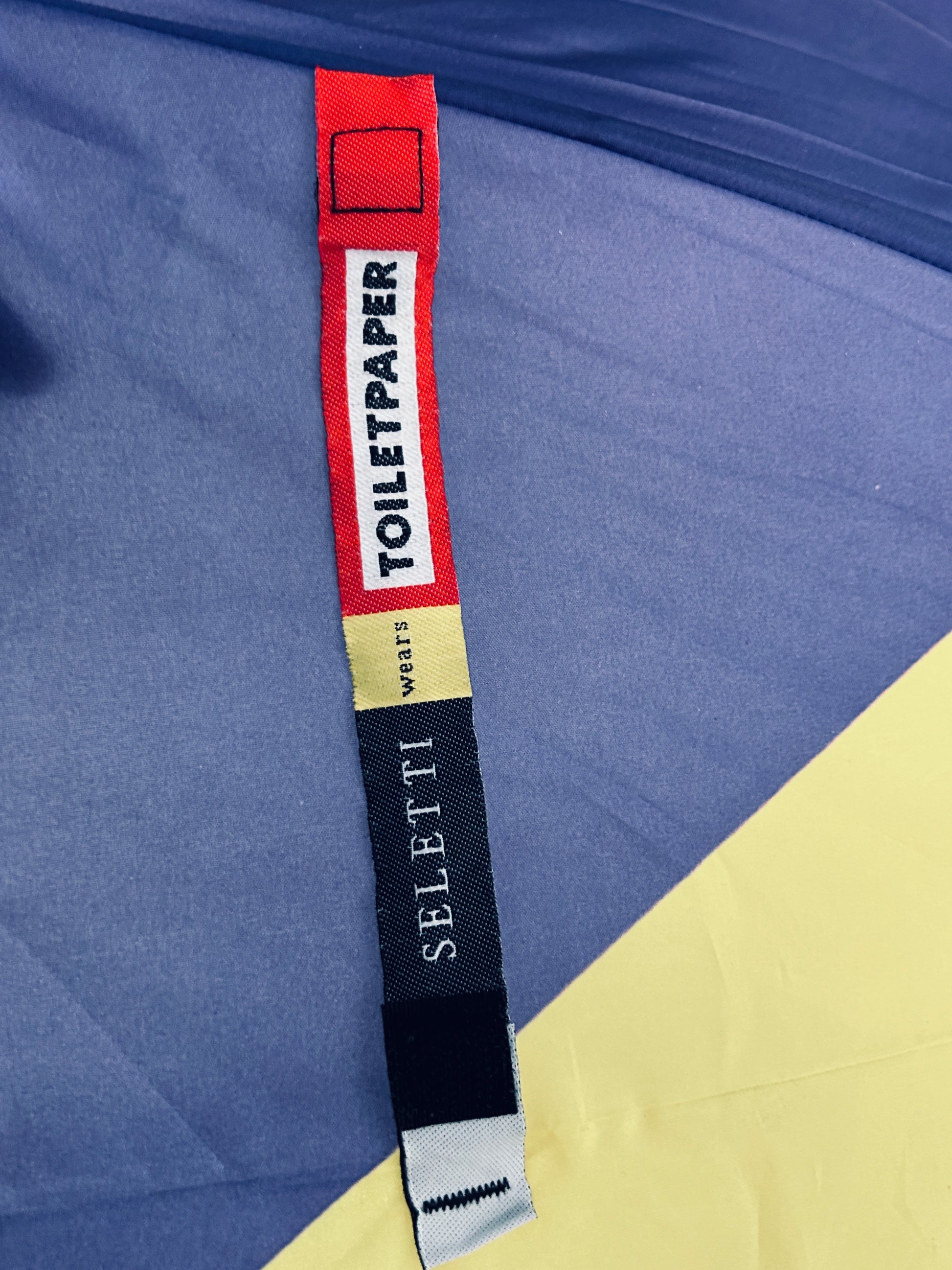 Son imprimé Machine à écrire sur fond bleu ne passe pas inaperçu, incarnant l’esprit irrévérencieux et décalé de la marque.
