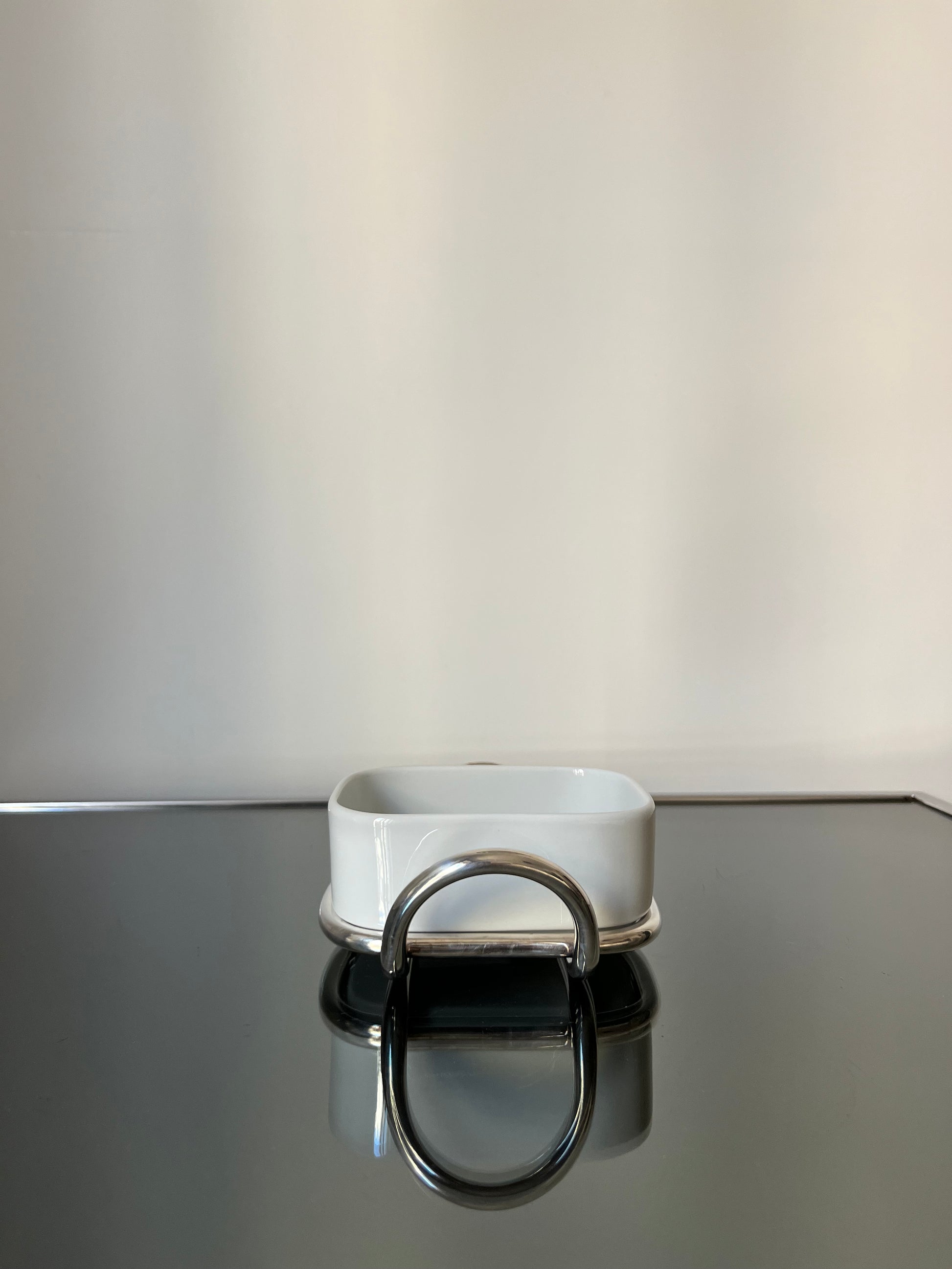 Réalisé en céramique blanche posée sur un support en métal argenté, il séduit par le contraste subtil entre la douceur de la matière et l’éclat du métal.