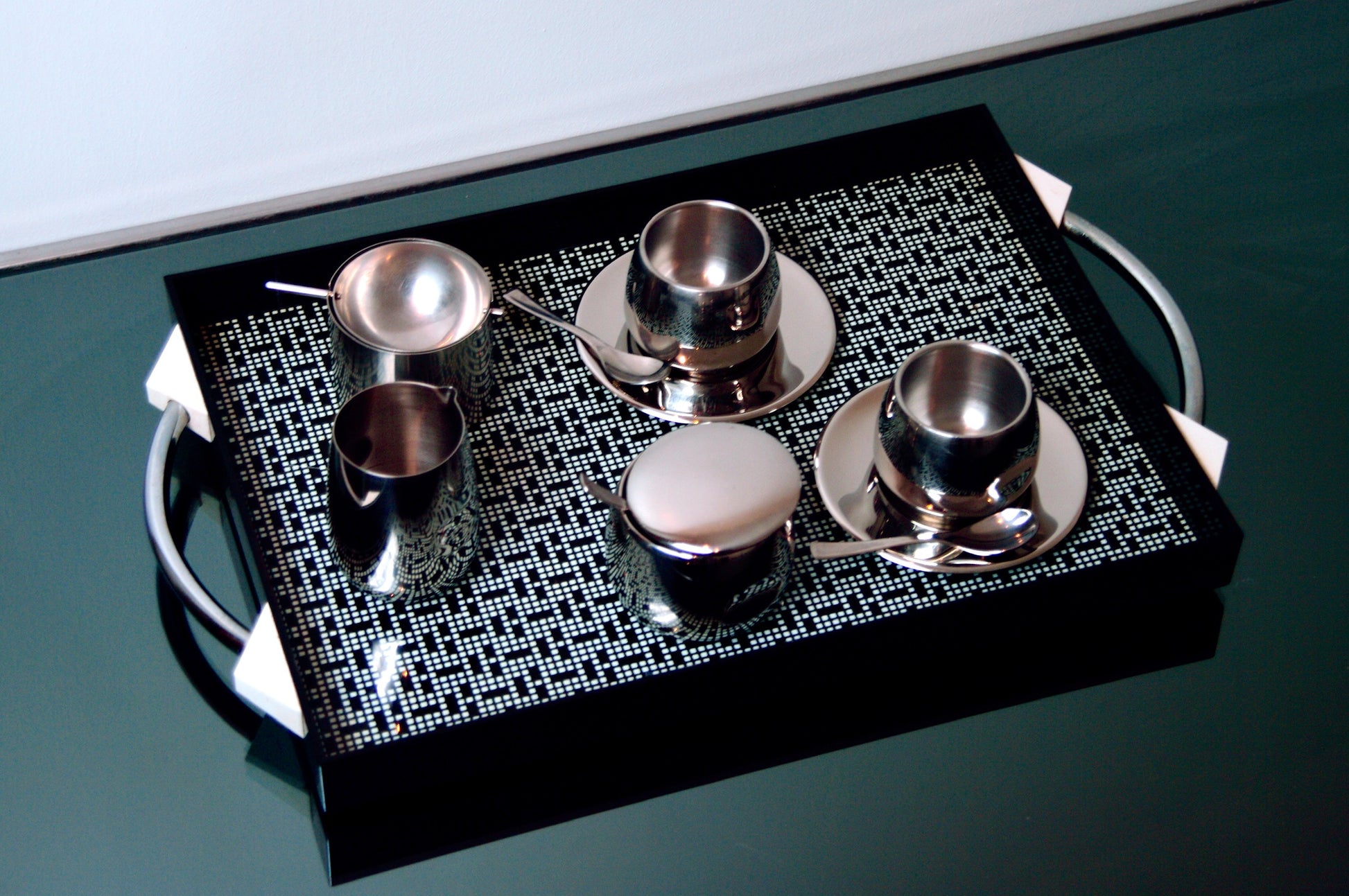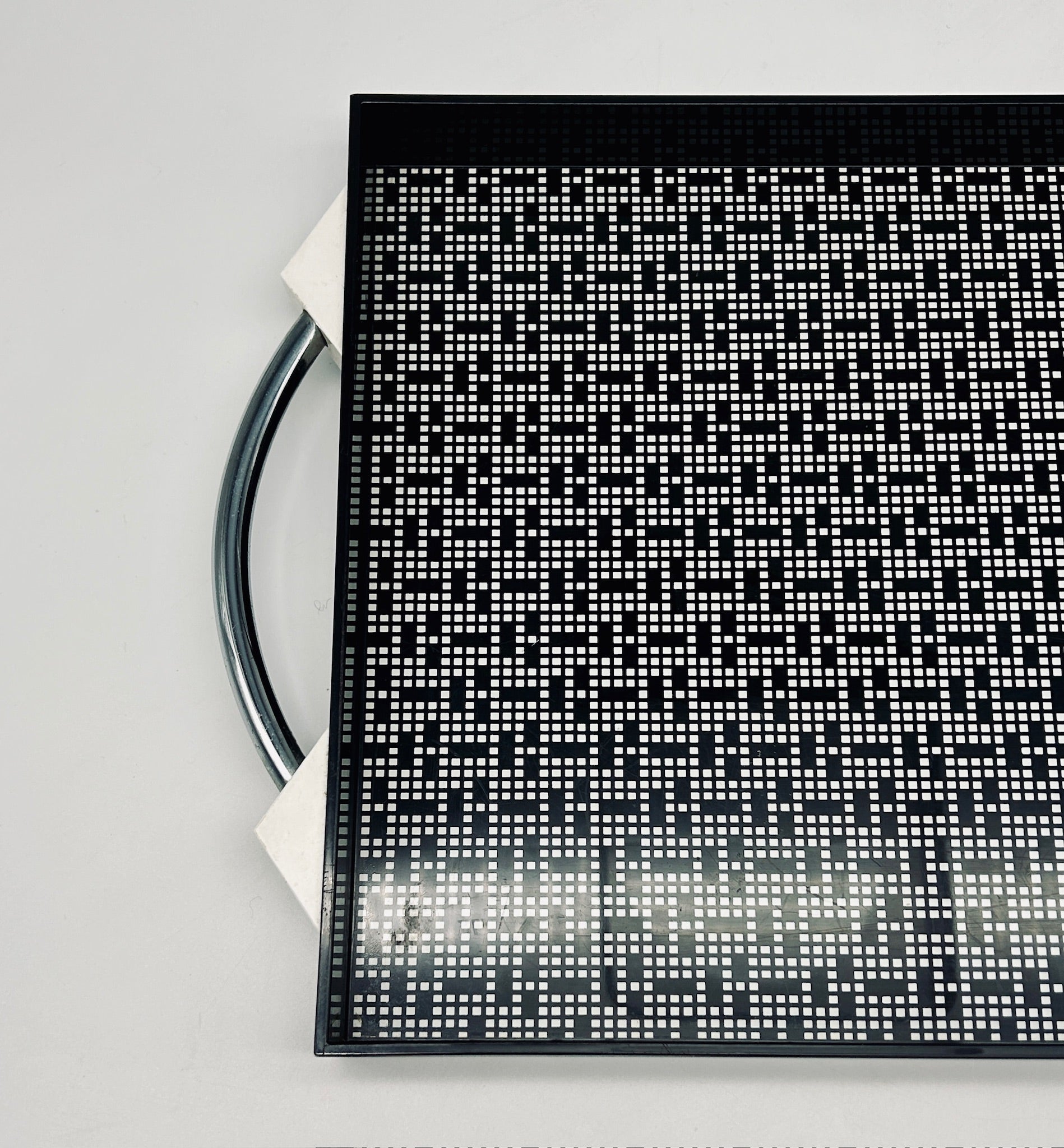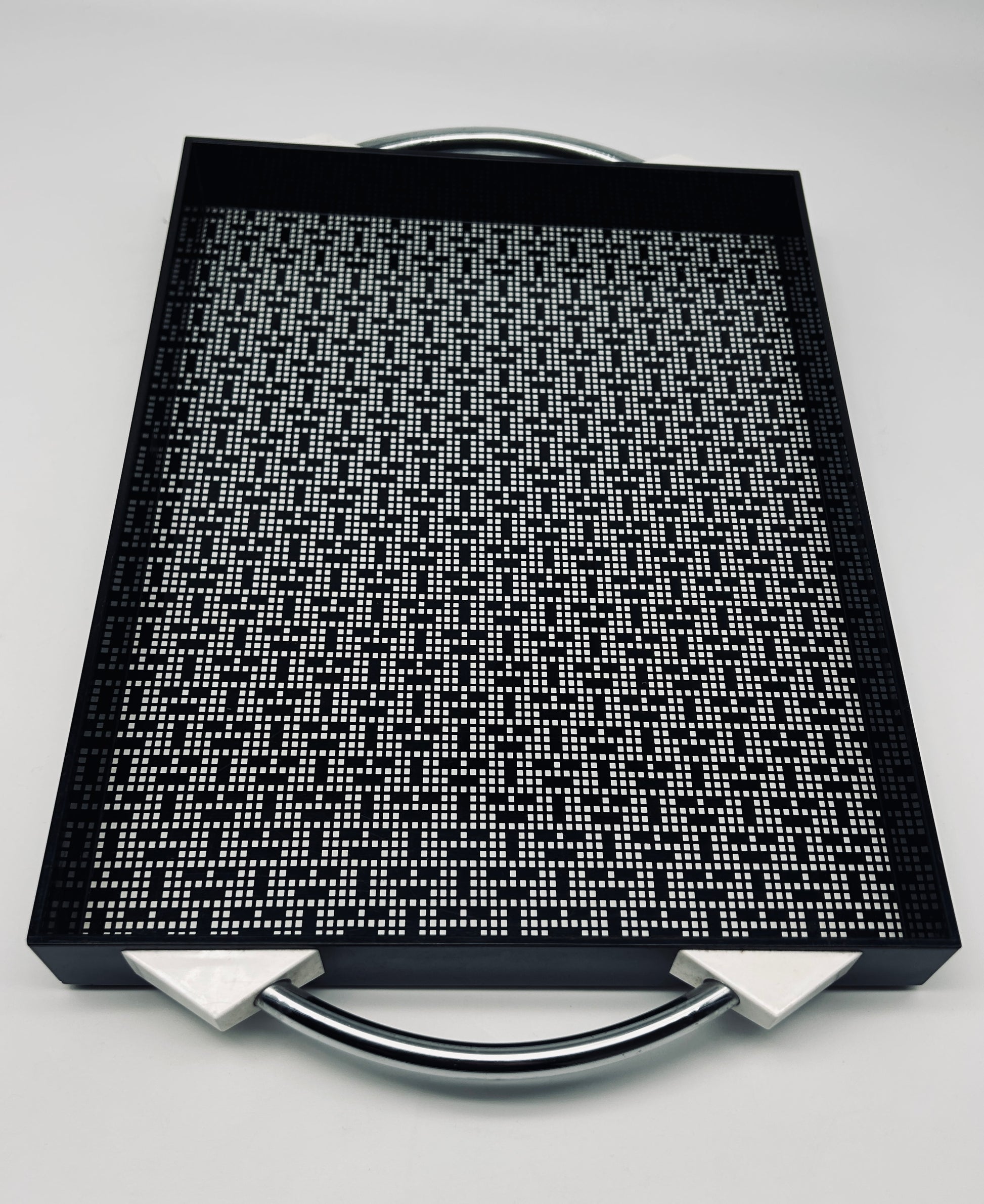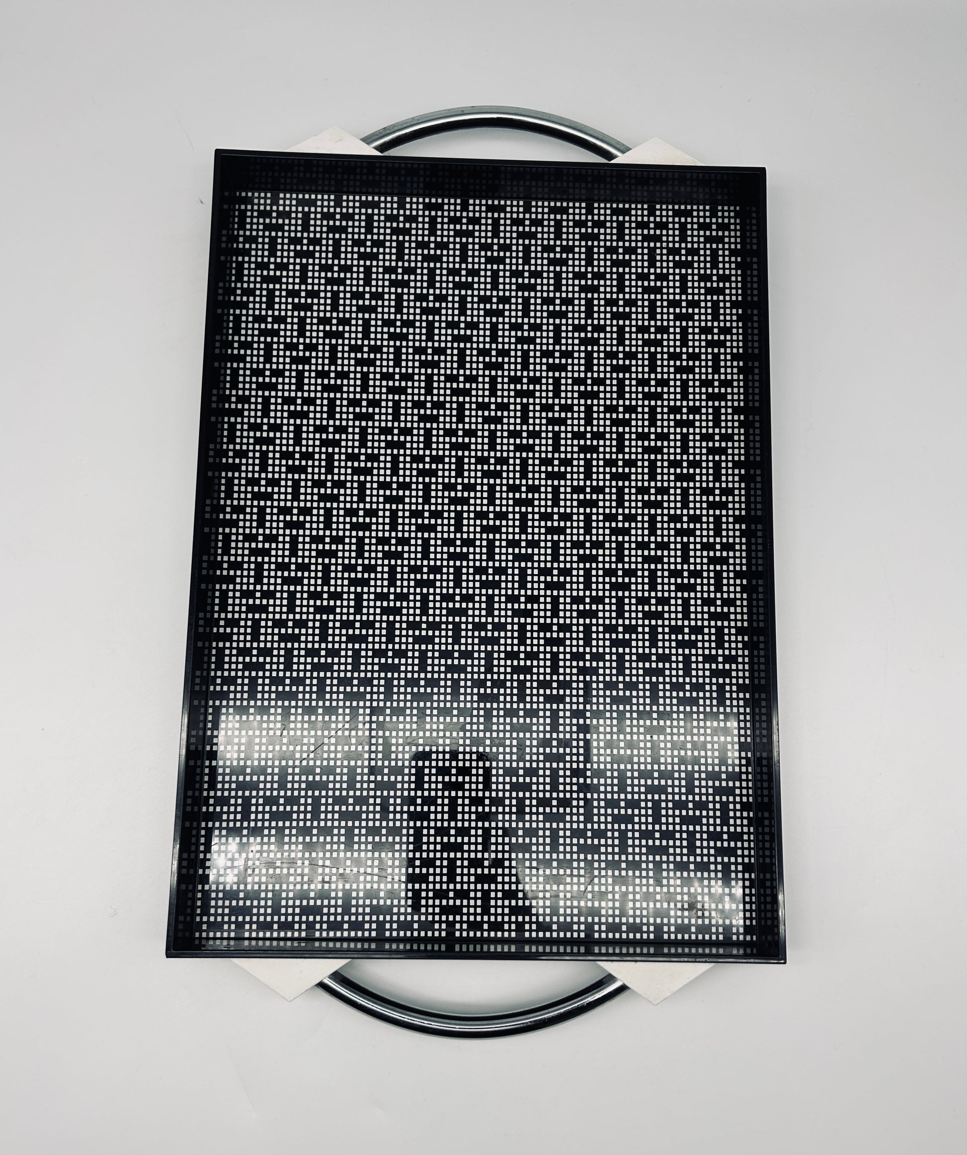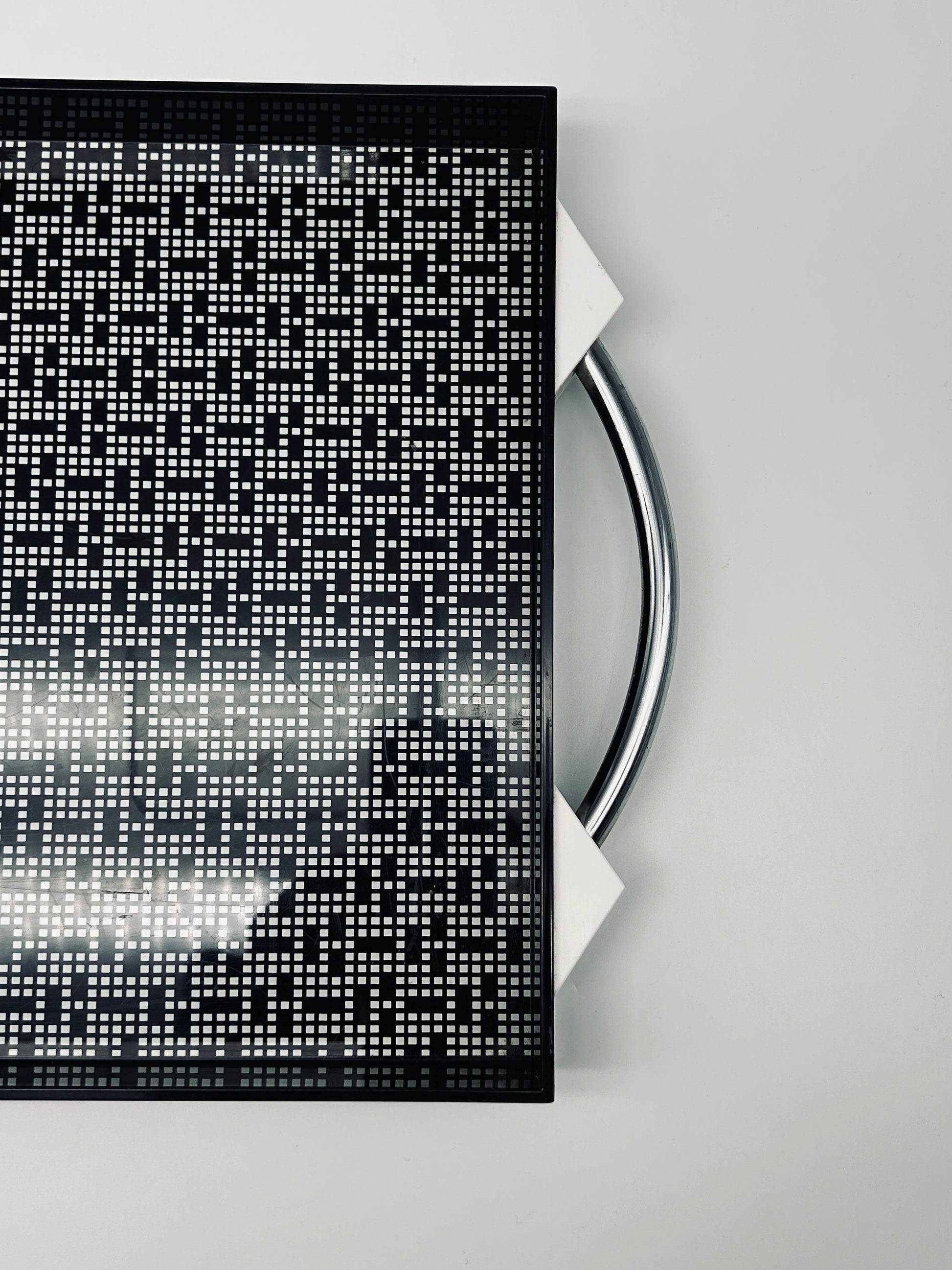 Ce plateau vintage postmoderne conçu par Matteo Thun pour WMF, dans les années 1980, est caractéristique du style postmoderne de Thun, avec son utilisation audacieuse de formes géométriques et de motifs graphiques contrastés (ici, un motif pixel).