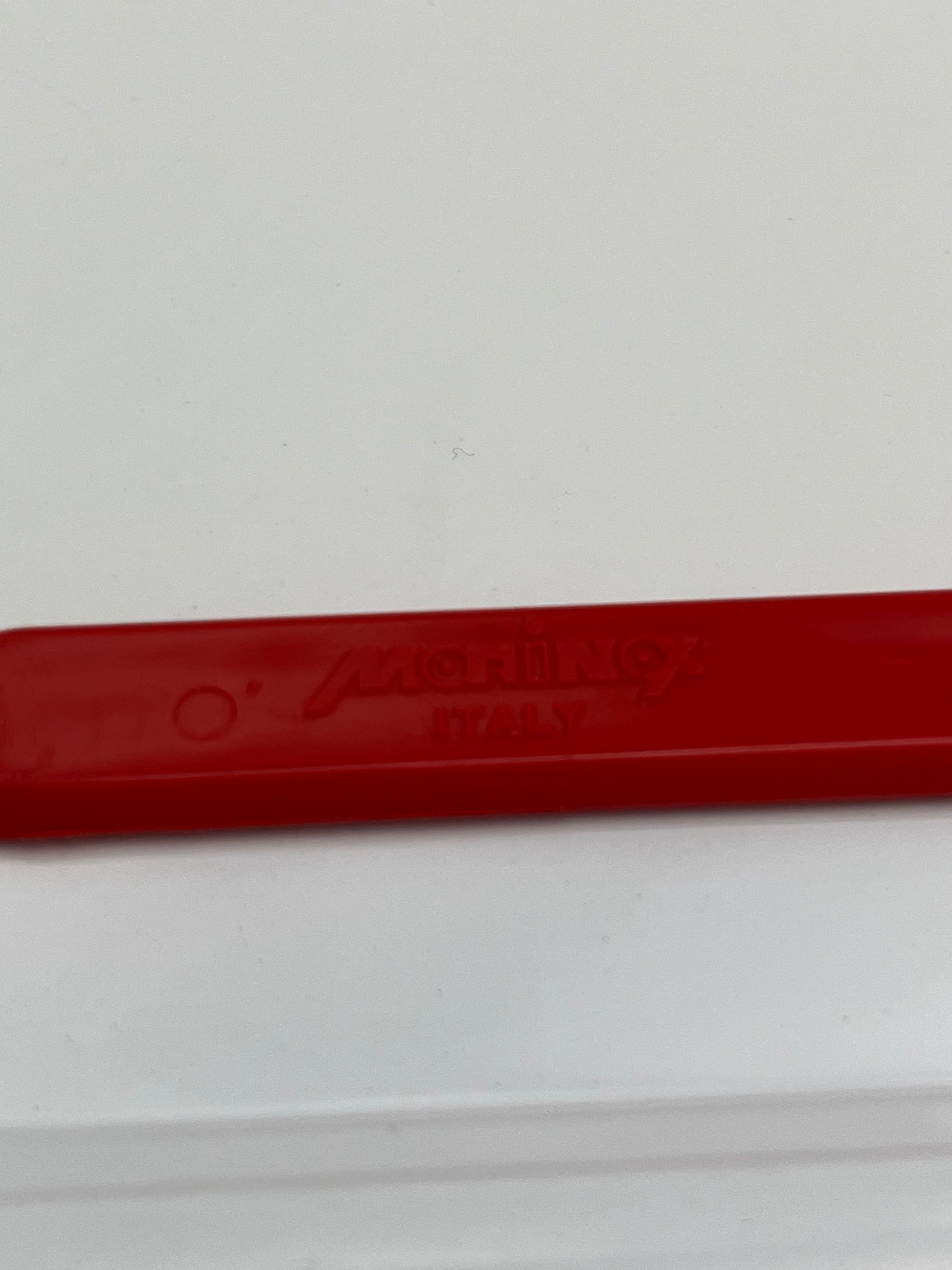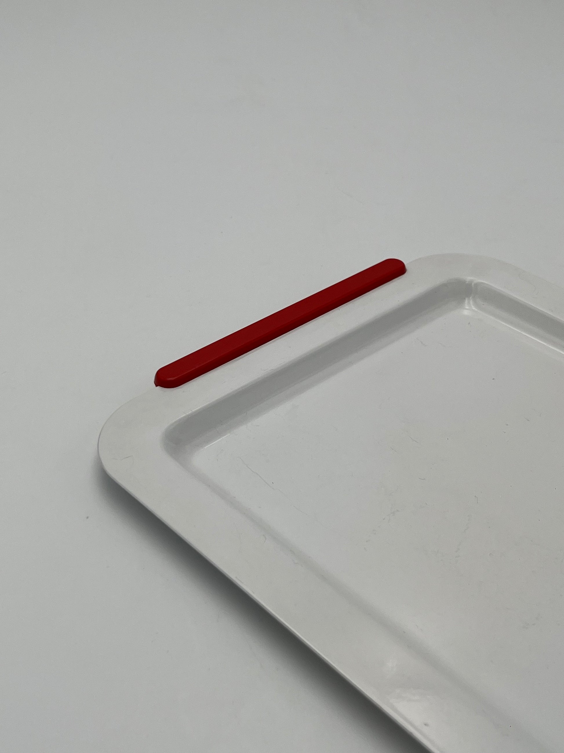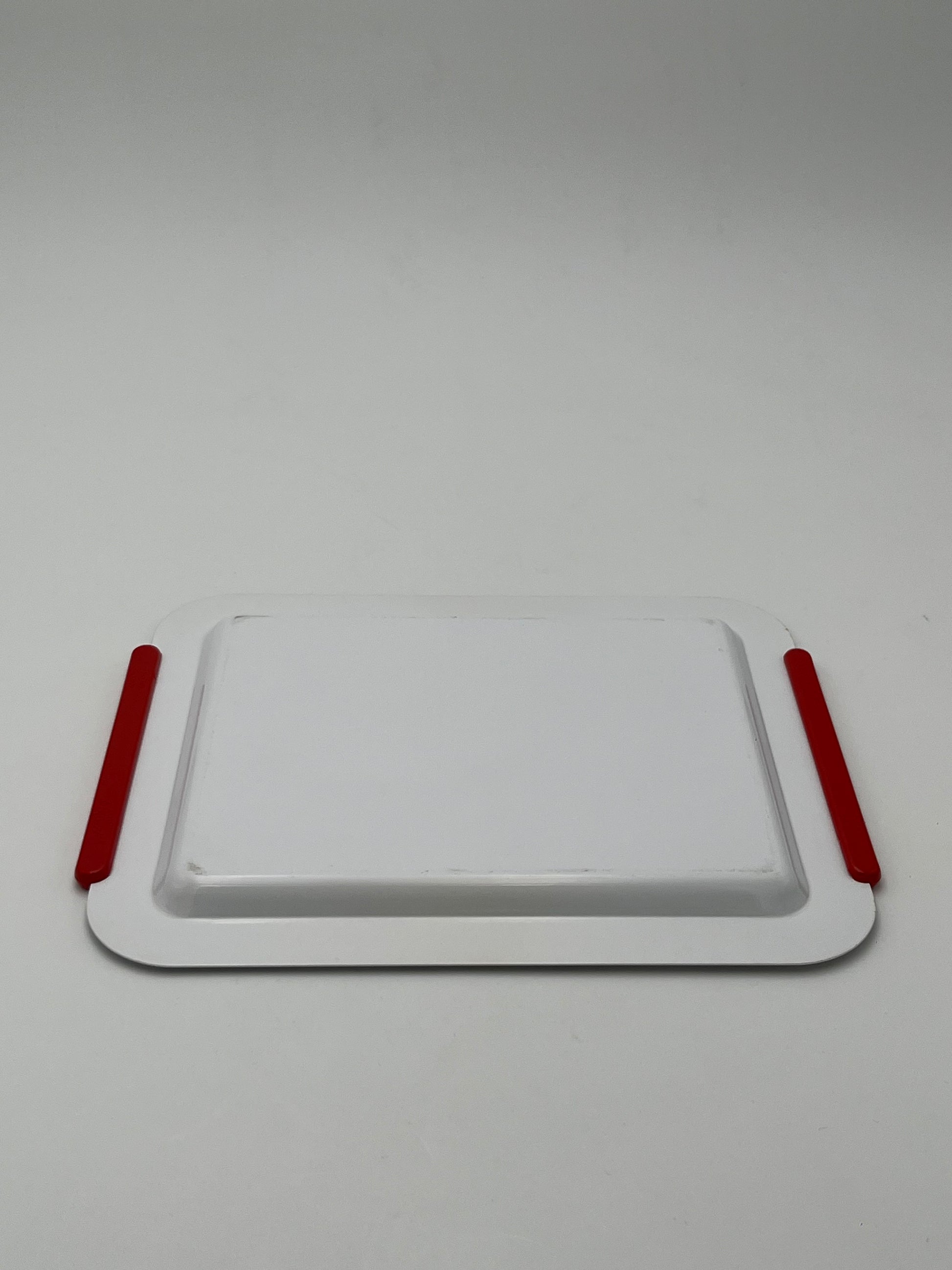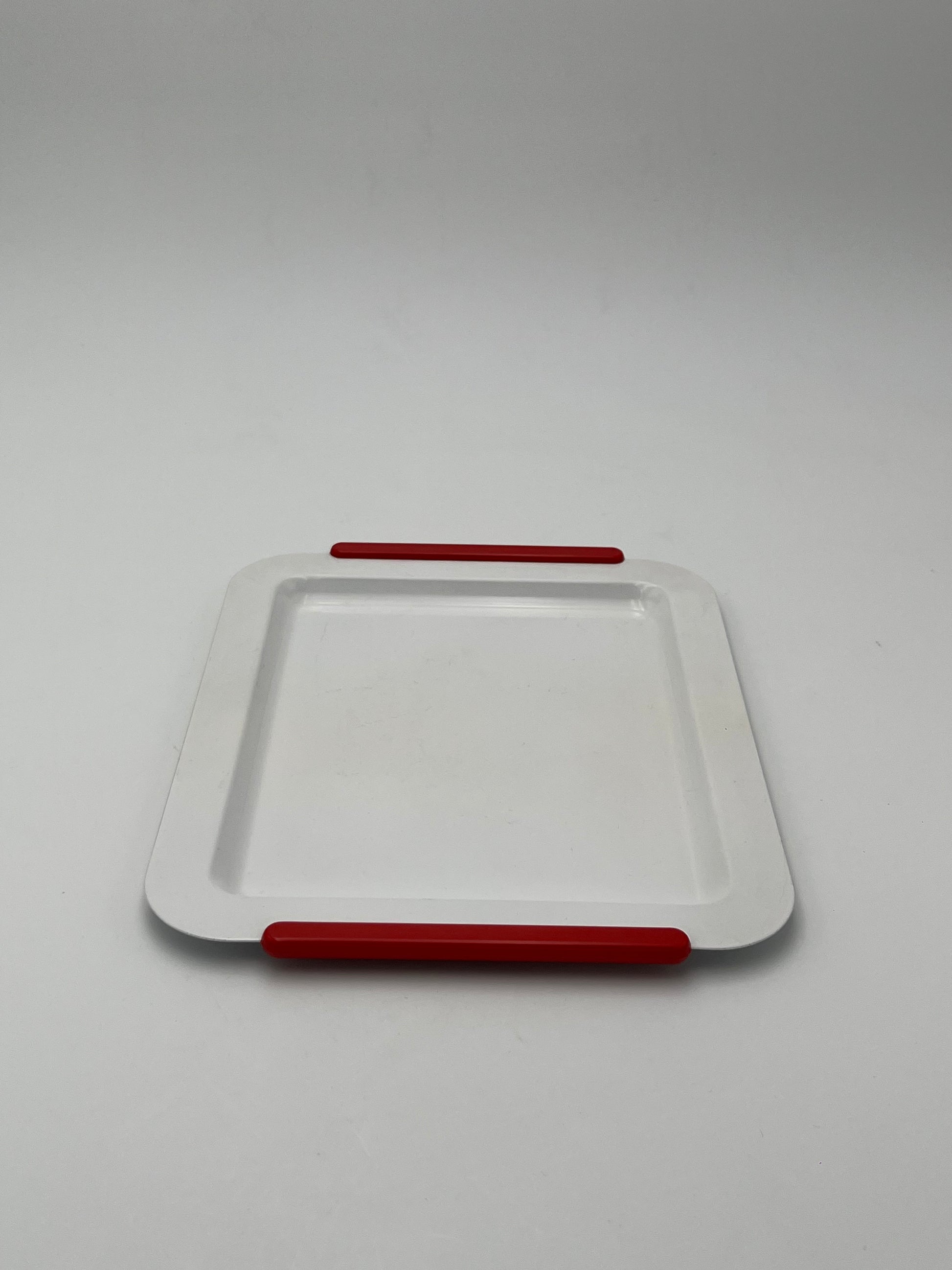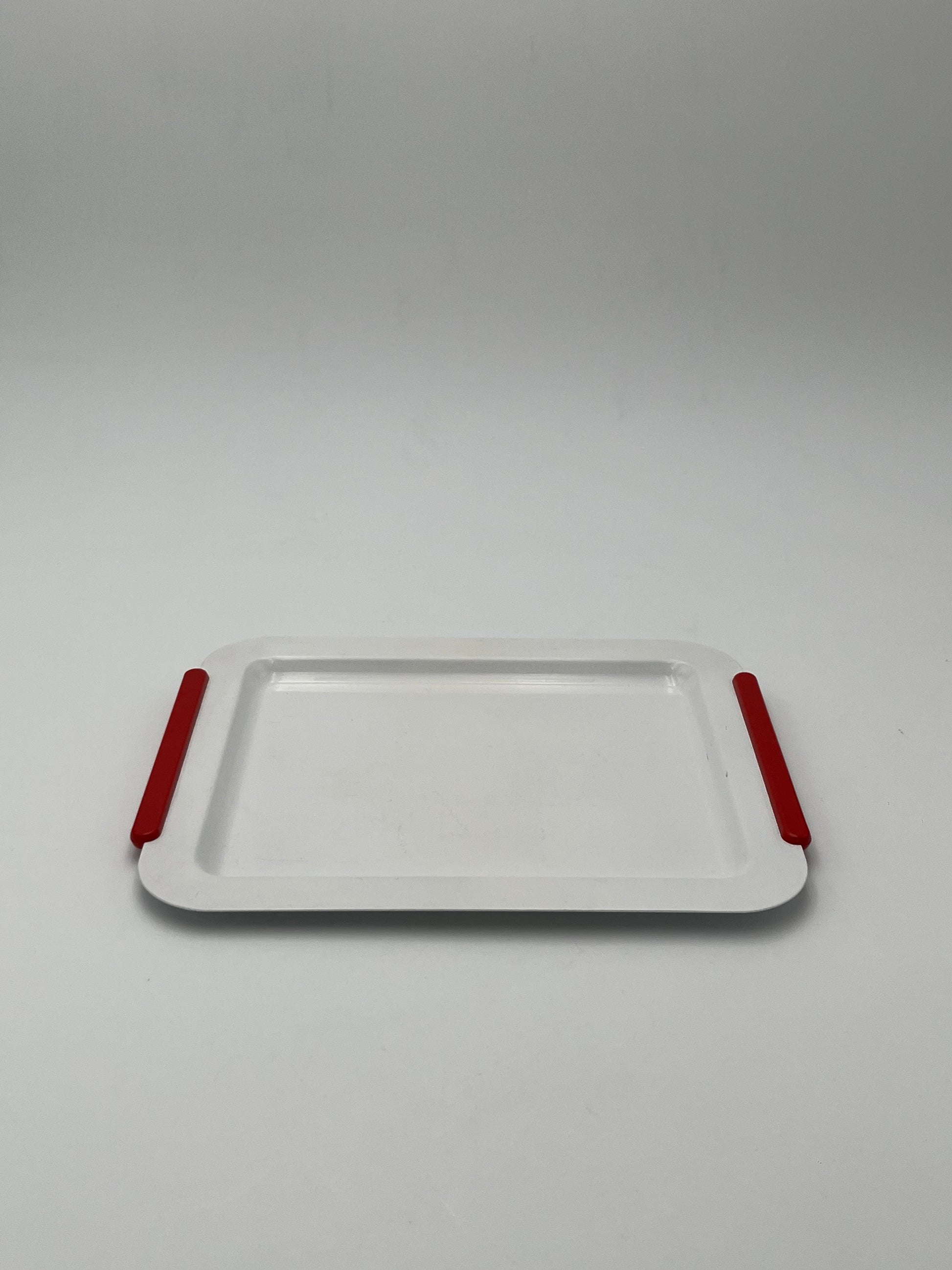 Ce plateau en acier blanc avec des poignées rouges de la marque Morinox, conçu en Italie dans les années 1970, est un exemple de design élégant et fonctionnel.