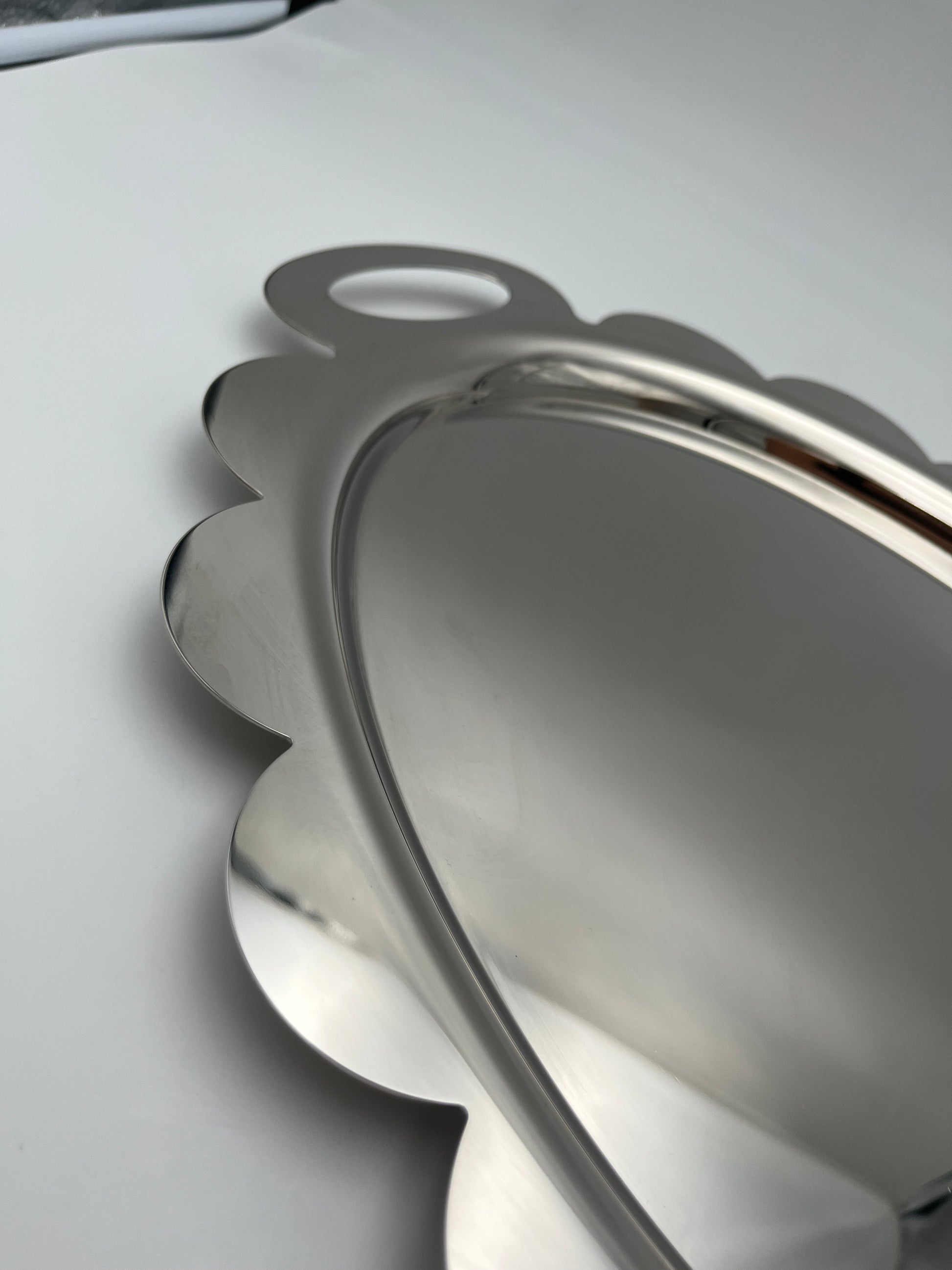 Fabriqué avec soin en Italie par le designer Alessandro Mendini pour la marque Alessi, ce grand plateau est disponible en deux versions : une version grise avec des finitions en métal et une autre version en miroir ancien en acier inoxydable.