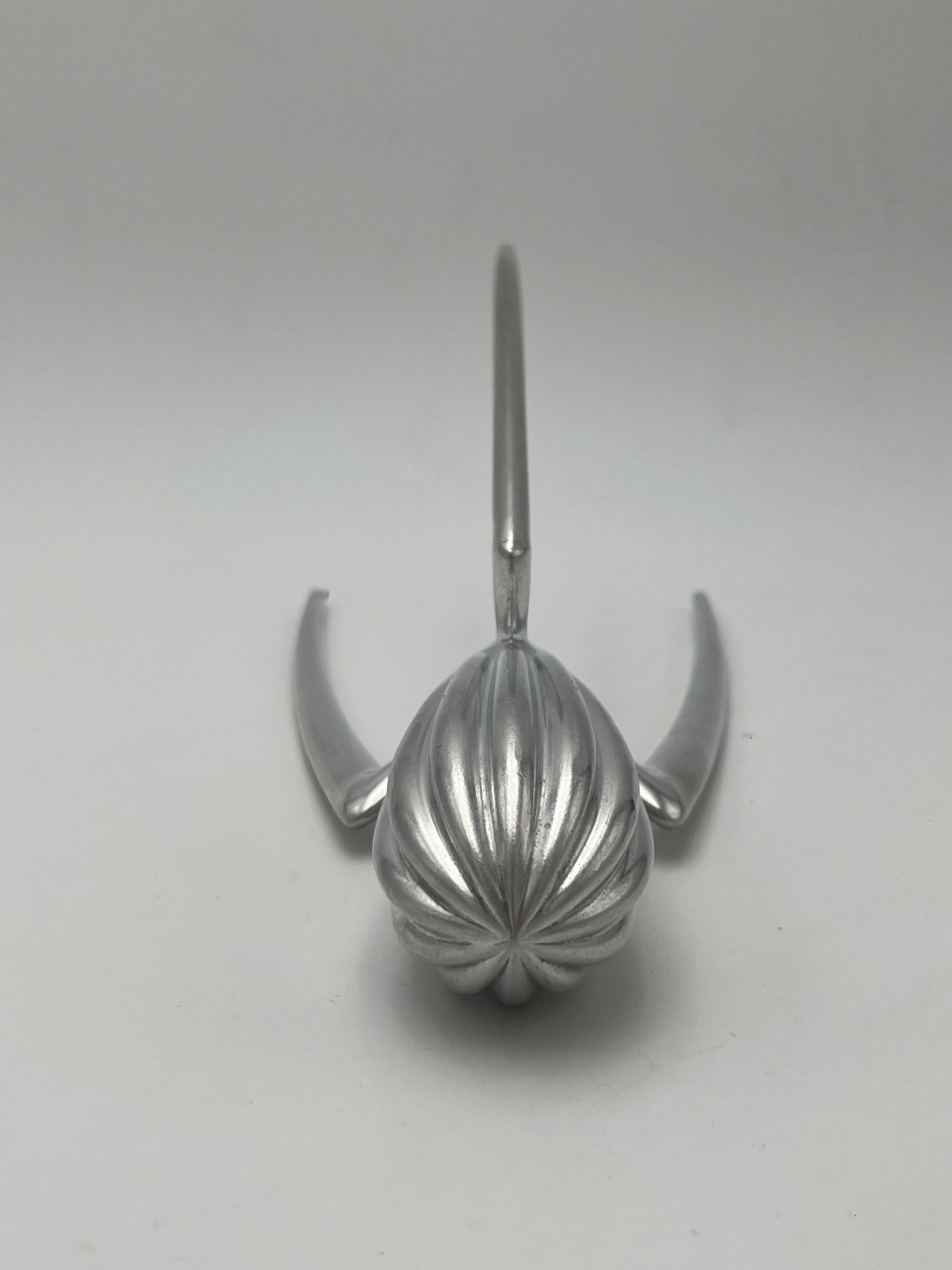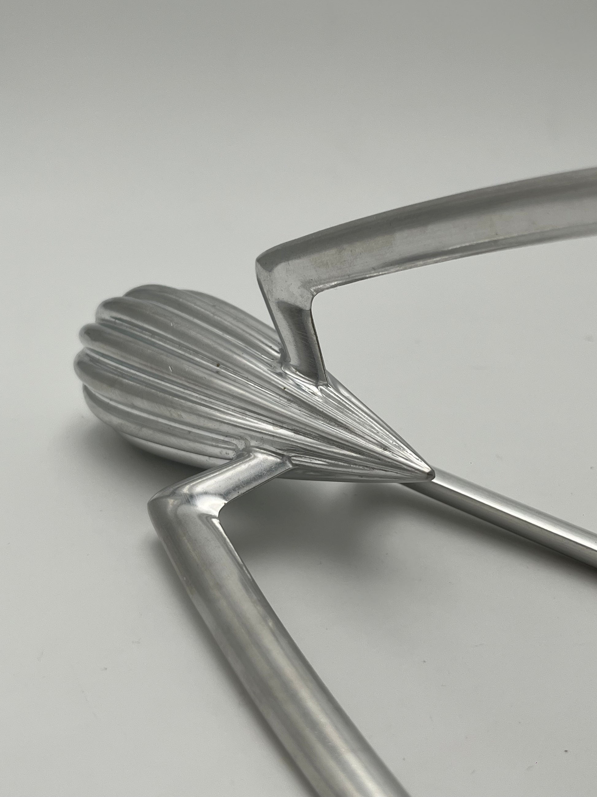 Le presse-citron est conçu sous la forme d'une sculpture abstraite en aluminium, qui sert également de presse-agrumes.