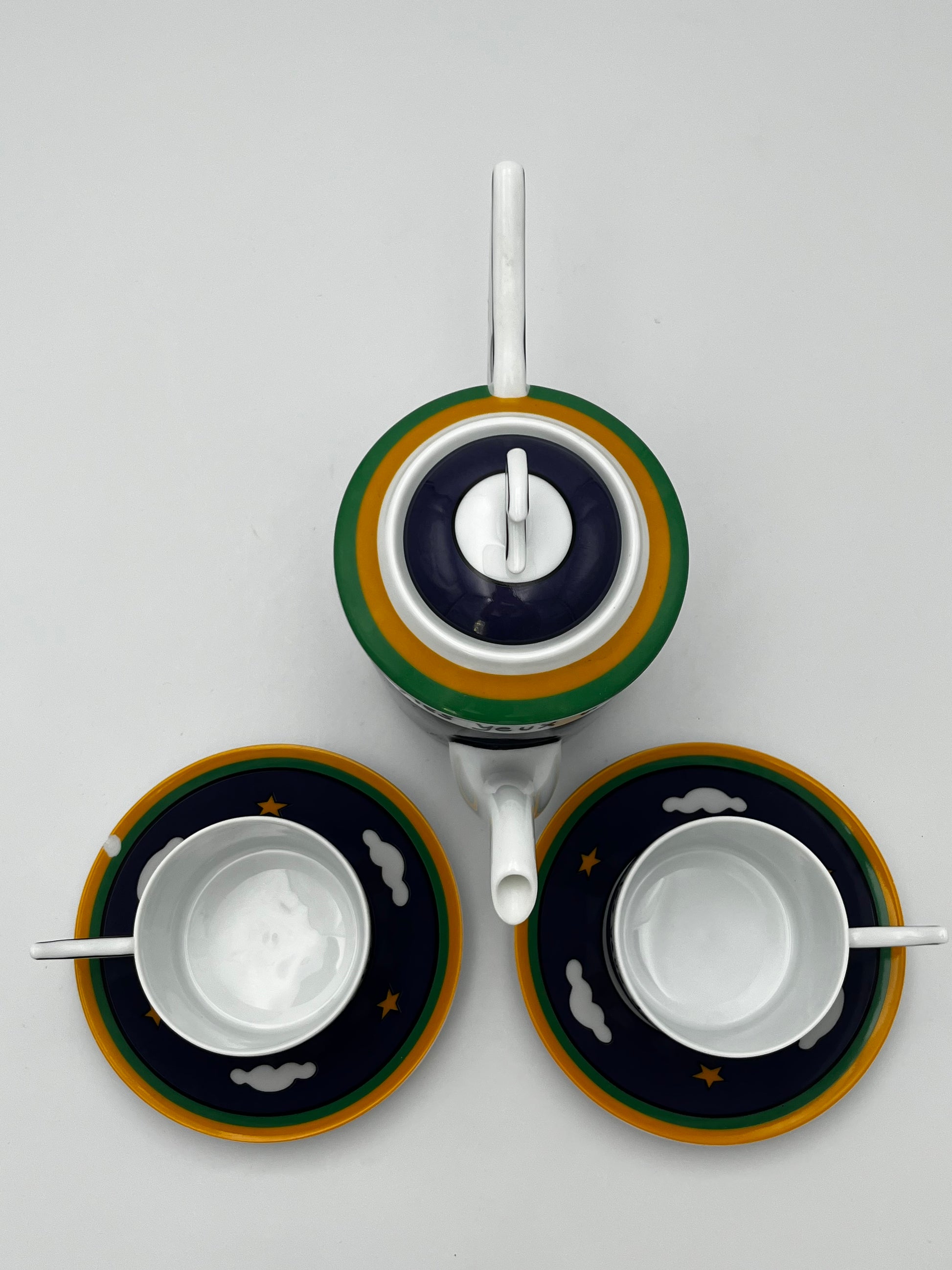Conçu par Jean Charles de Castelbajac en 1995 pour l'Ancienne Manufacture royale, ce set se compose d'une cafetière, de deux tasses, de deux soucoupes, dedeux petites assiettes et deux plus grandes assiettes.