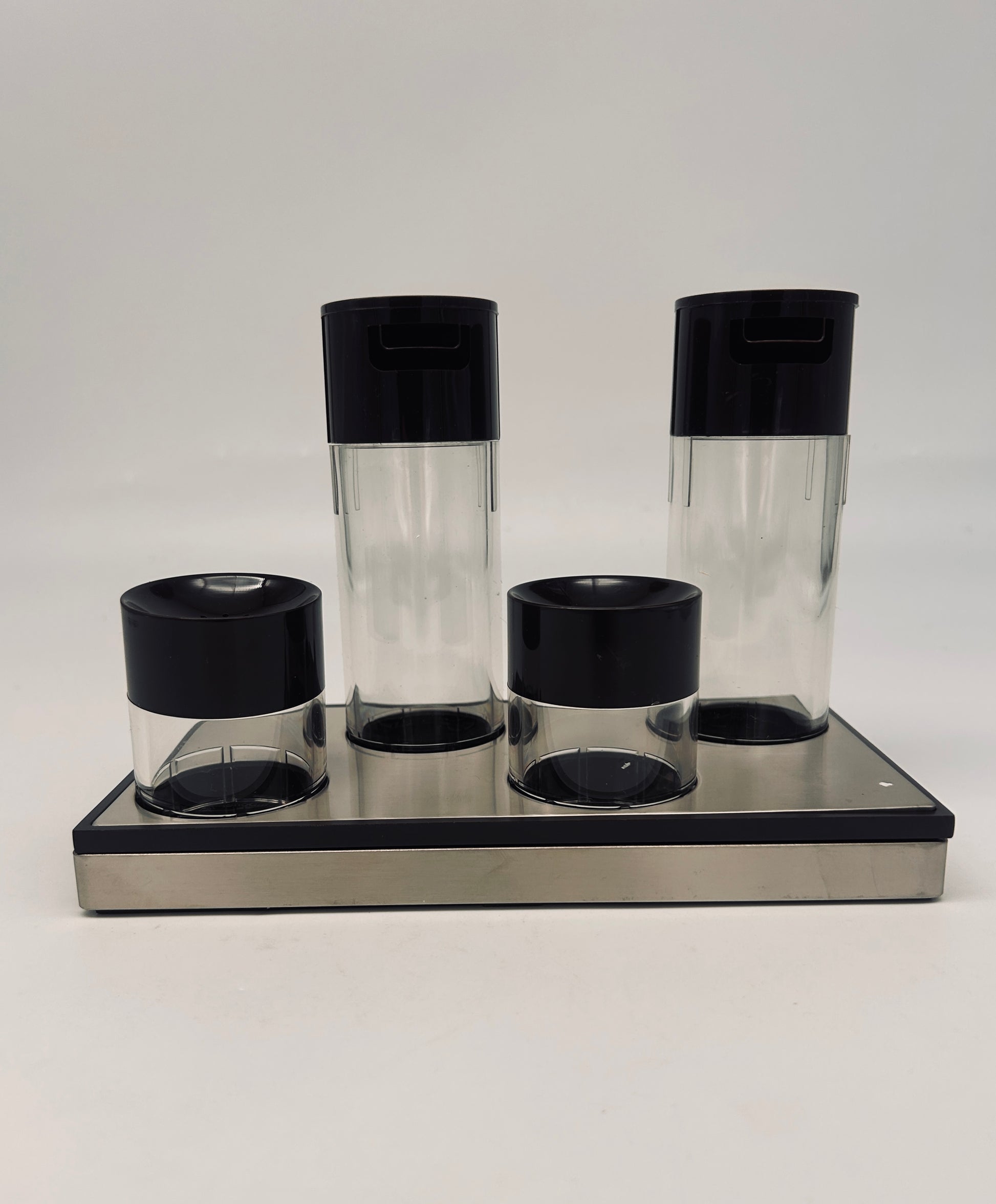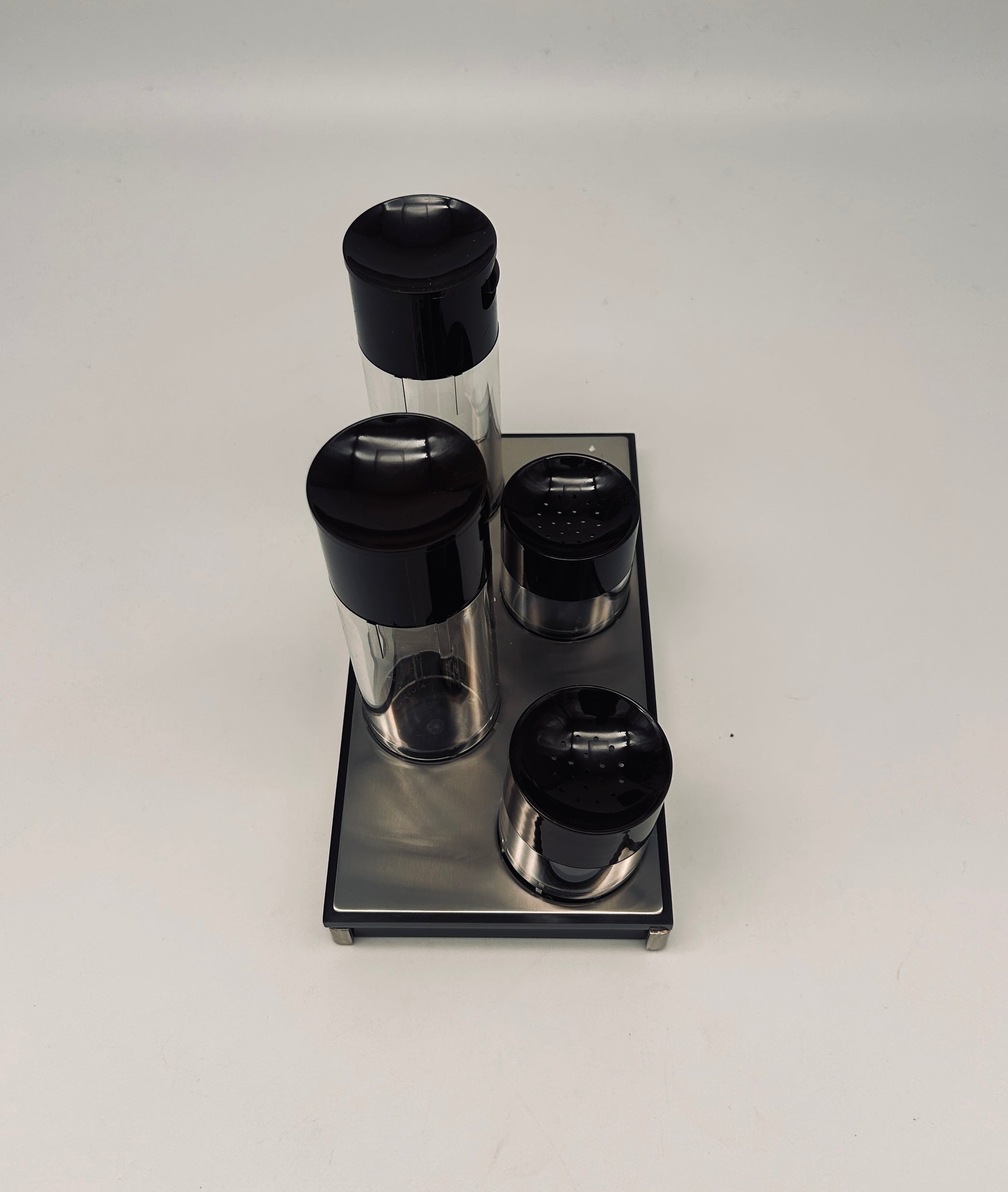 Composé de plusieurs récipients, il est idéal pour présenter vos sel, poivre, huiles, vinaigres et autres condiments.