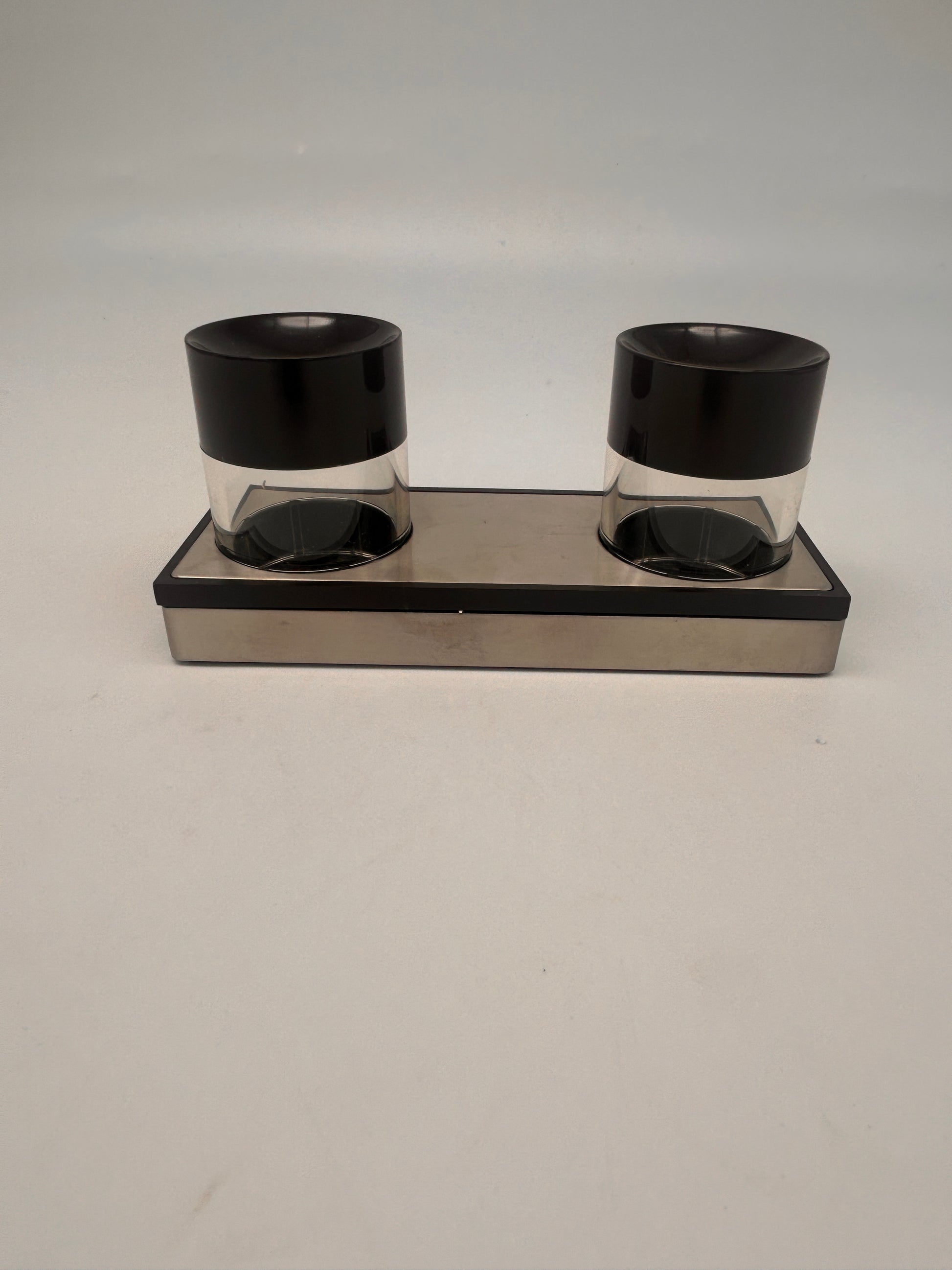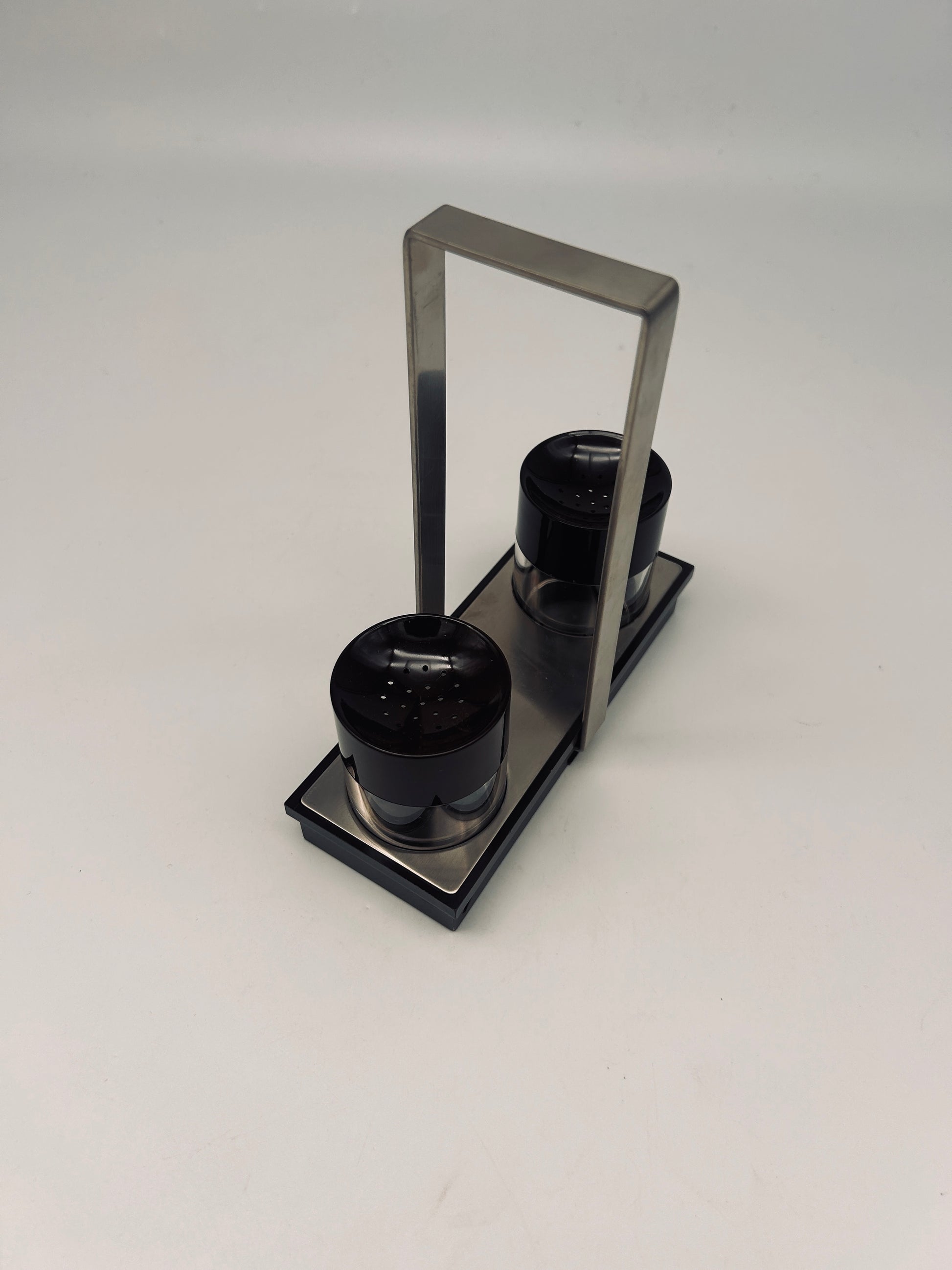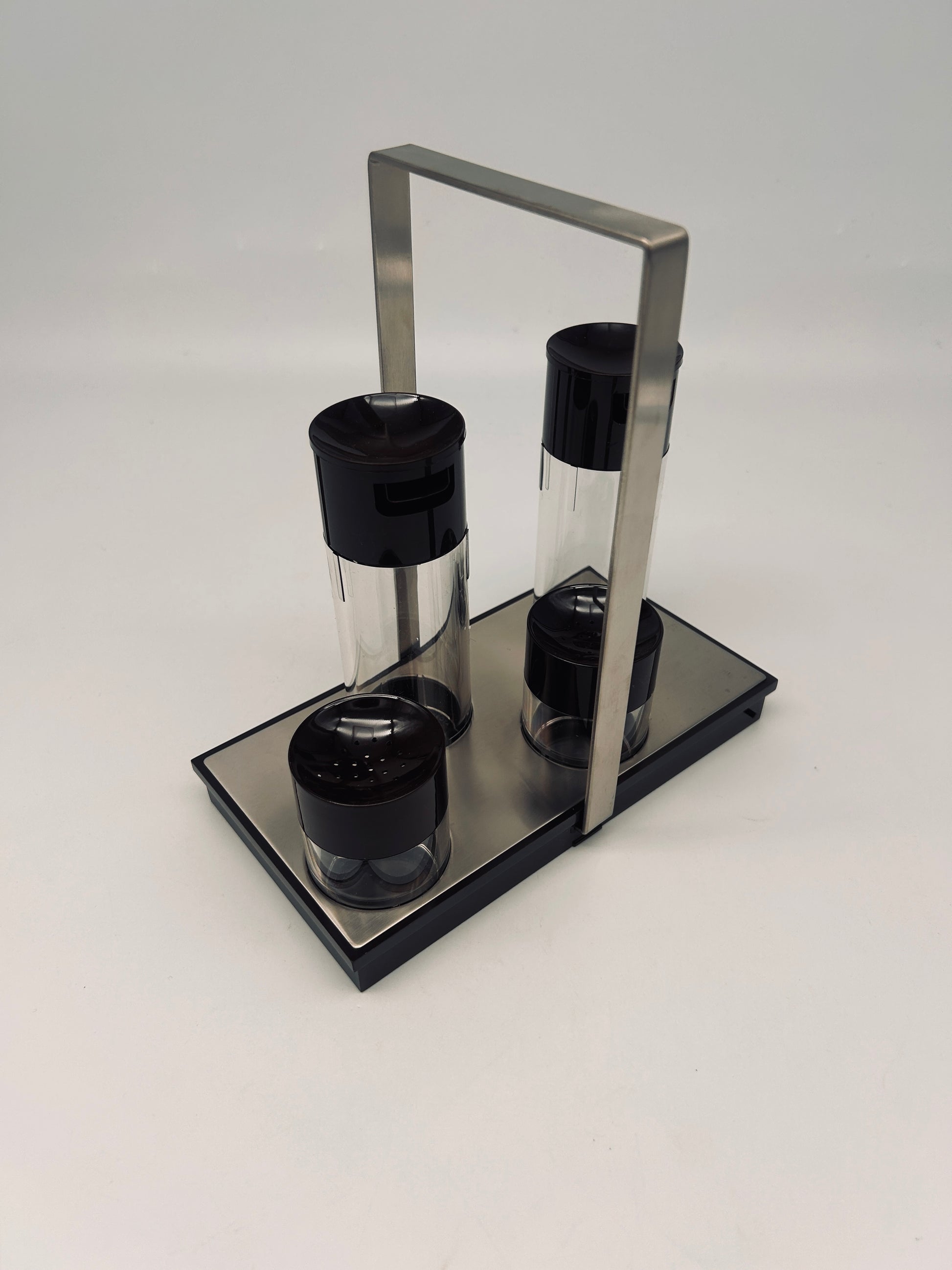 Avec ses lignes épurées et son contraste entre matériaux transparents et accents marrons, ce set à condiments ajoute une note space age et minimaliste à votre décoration de table.