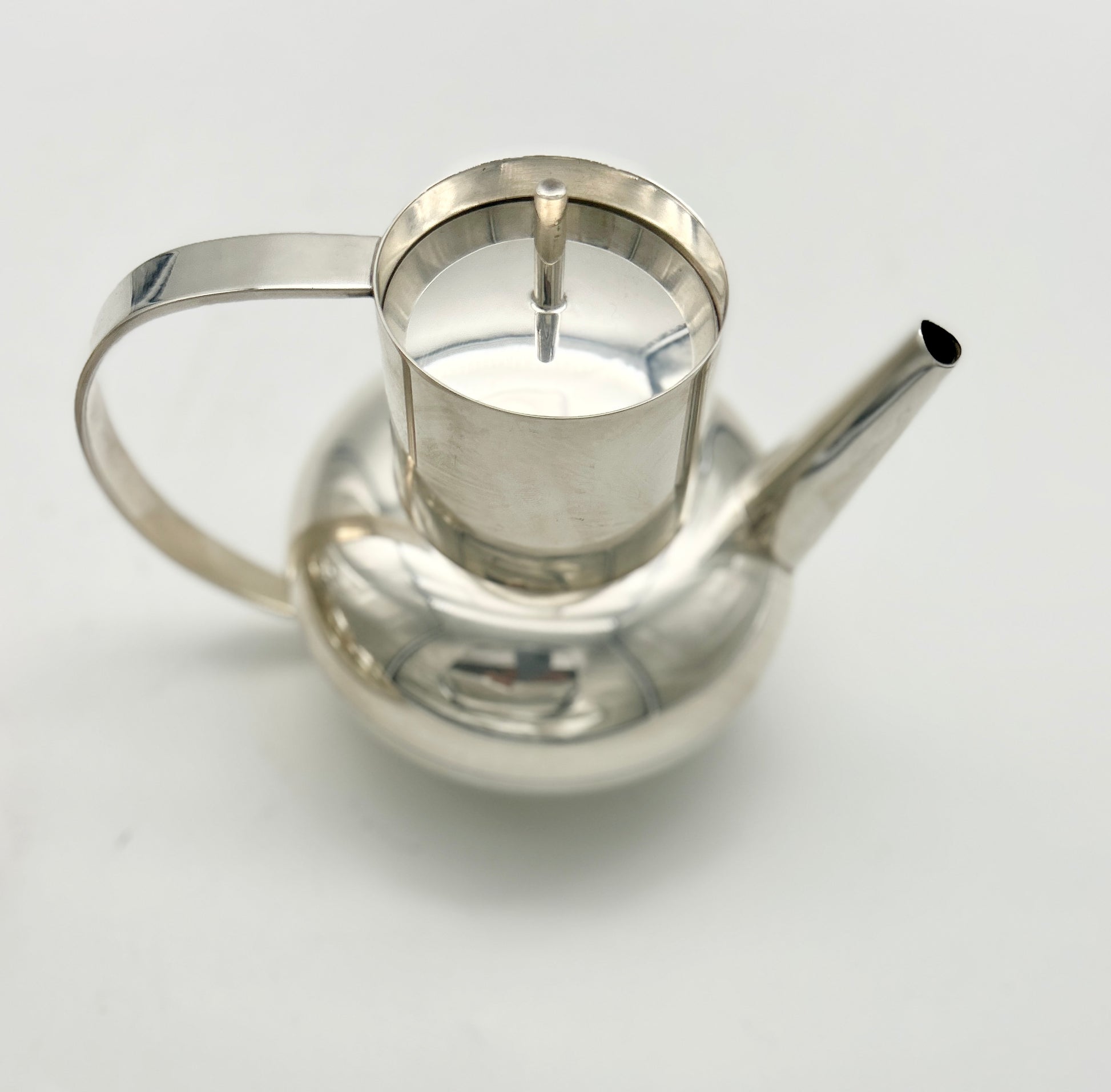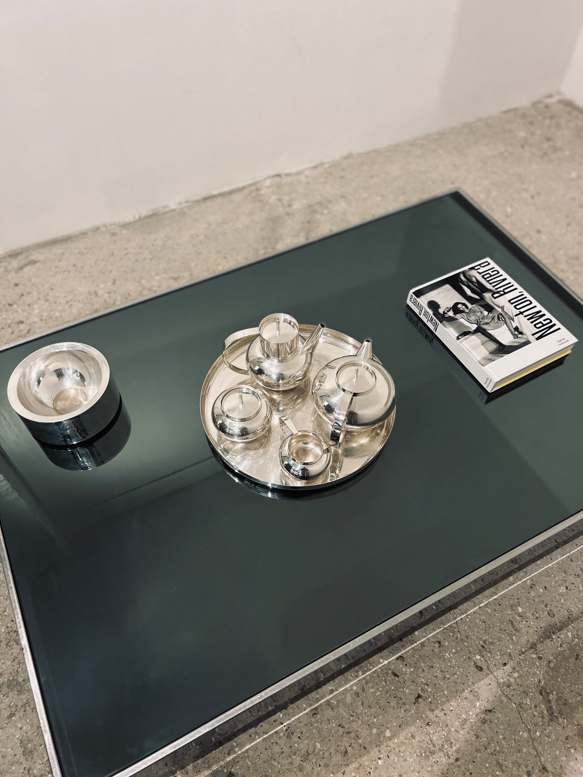Conçu dans les années 1960, cet ensemble iconique en métal argenté se distingue par ses formes sphériques et son design minimaliste, caractéristique du style visionnaire de Sabattini.