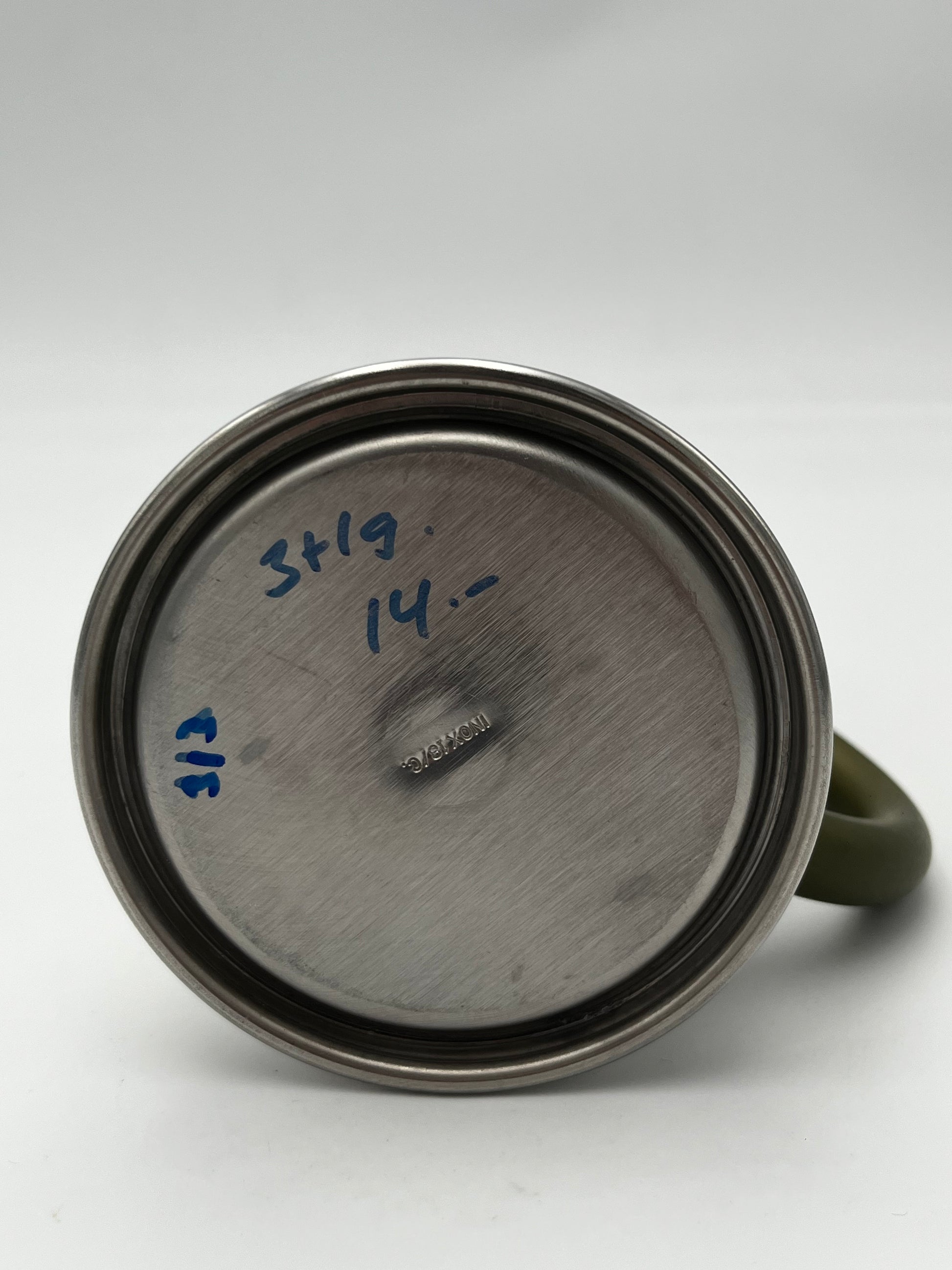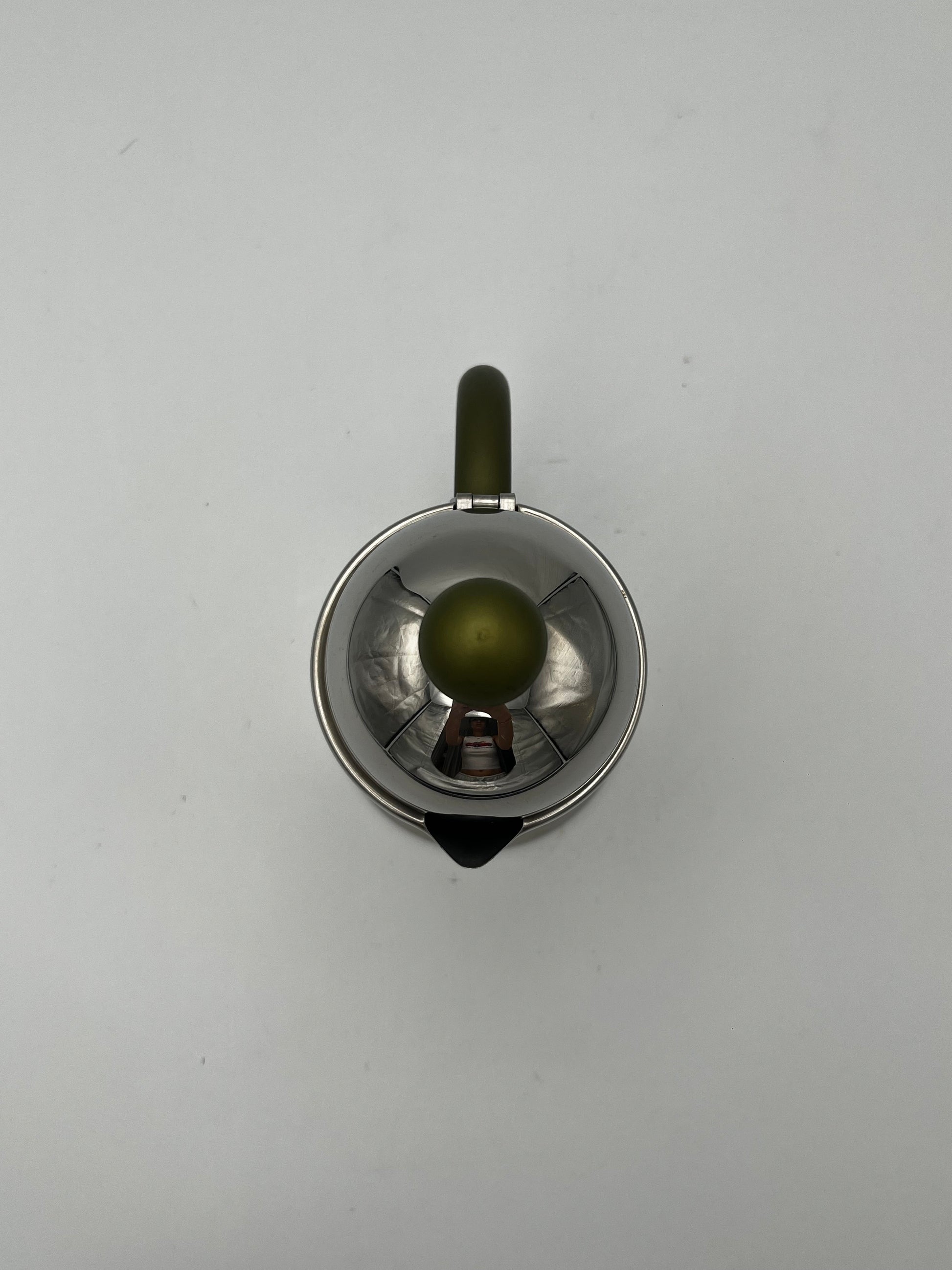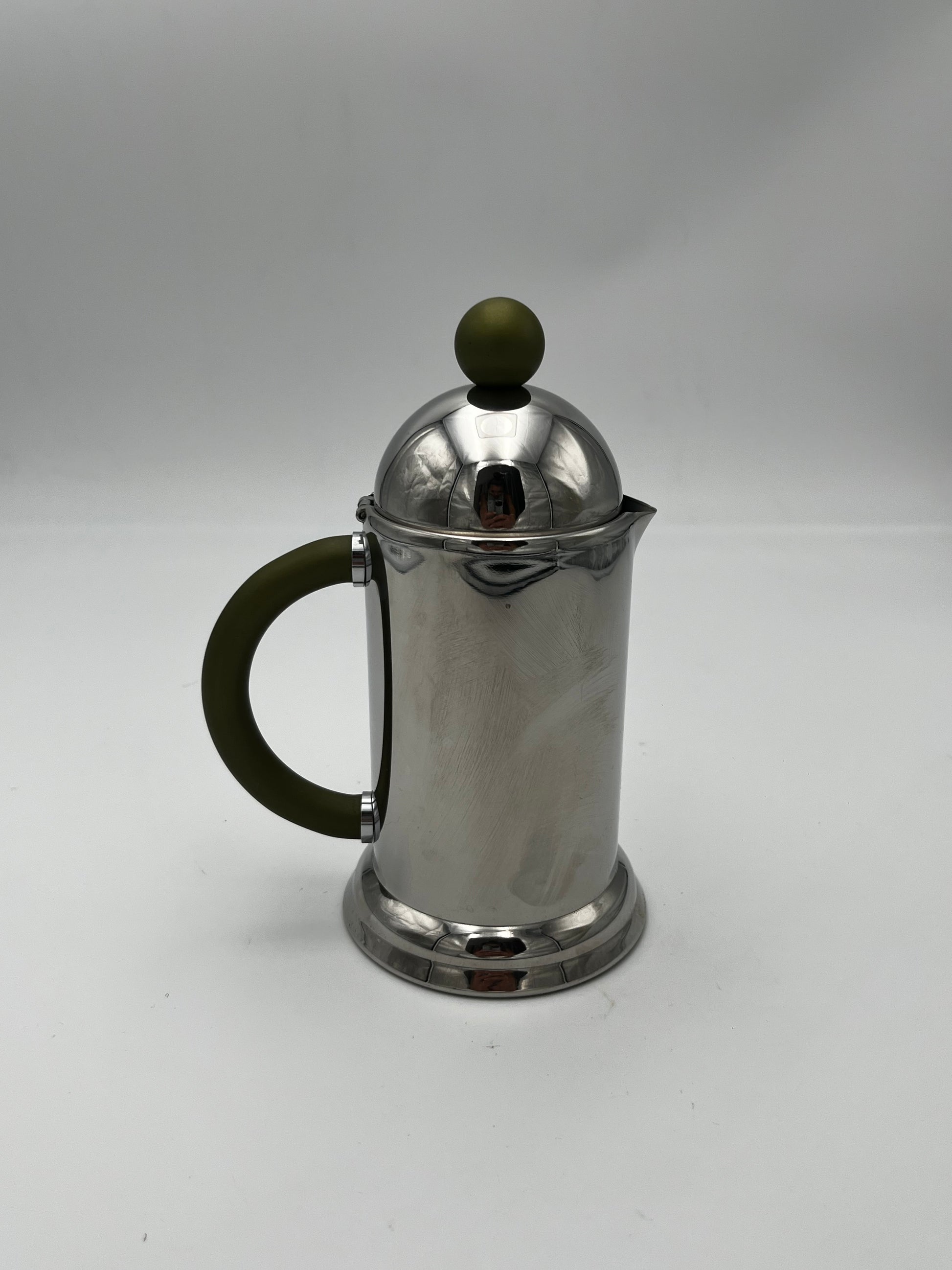 La cafetière, le sucrier et le pot à lait sont rehaussés de détails vert, ajoutant une touche de fraîcheur au design en acier inoxydable.