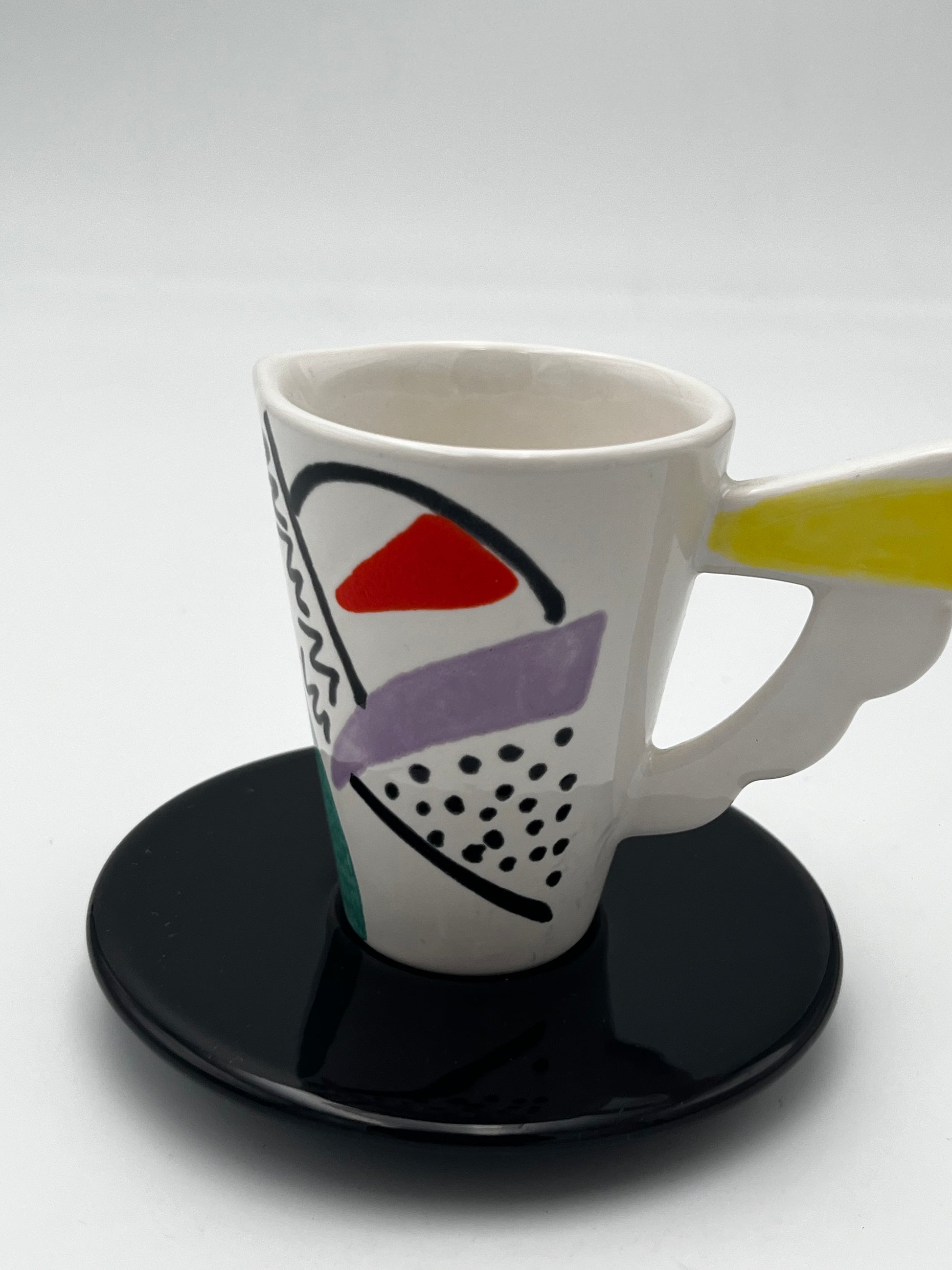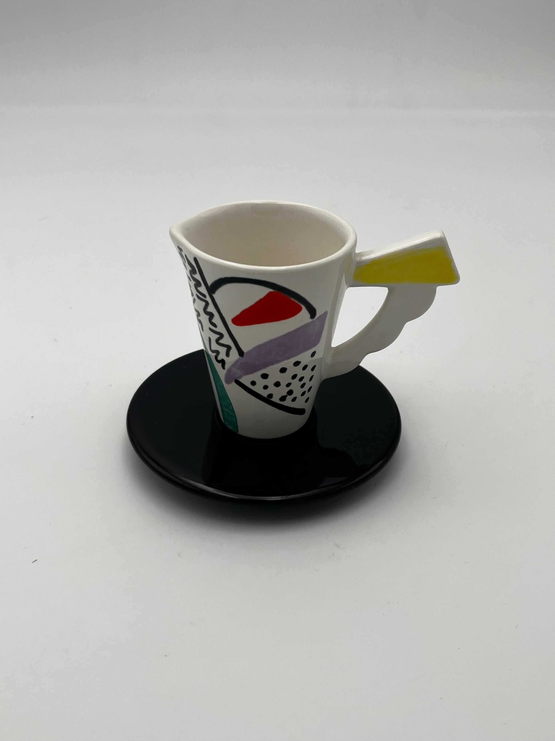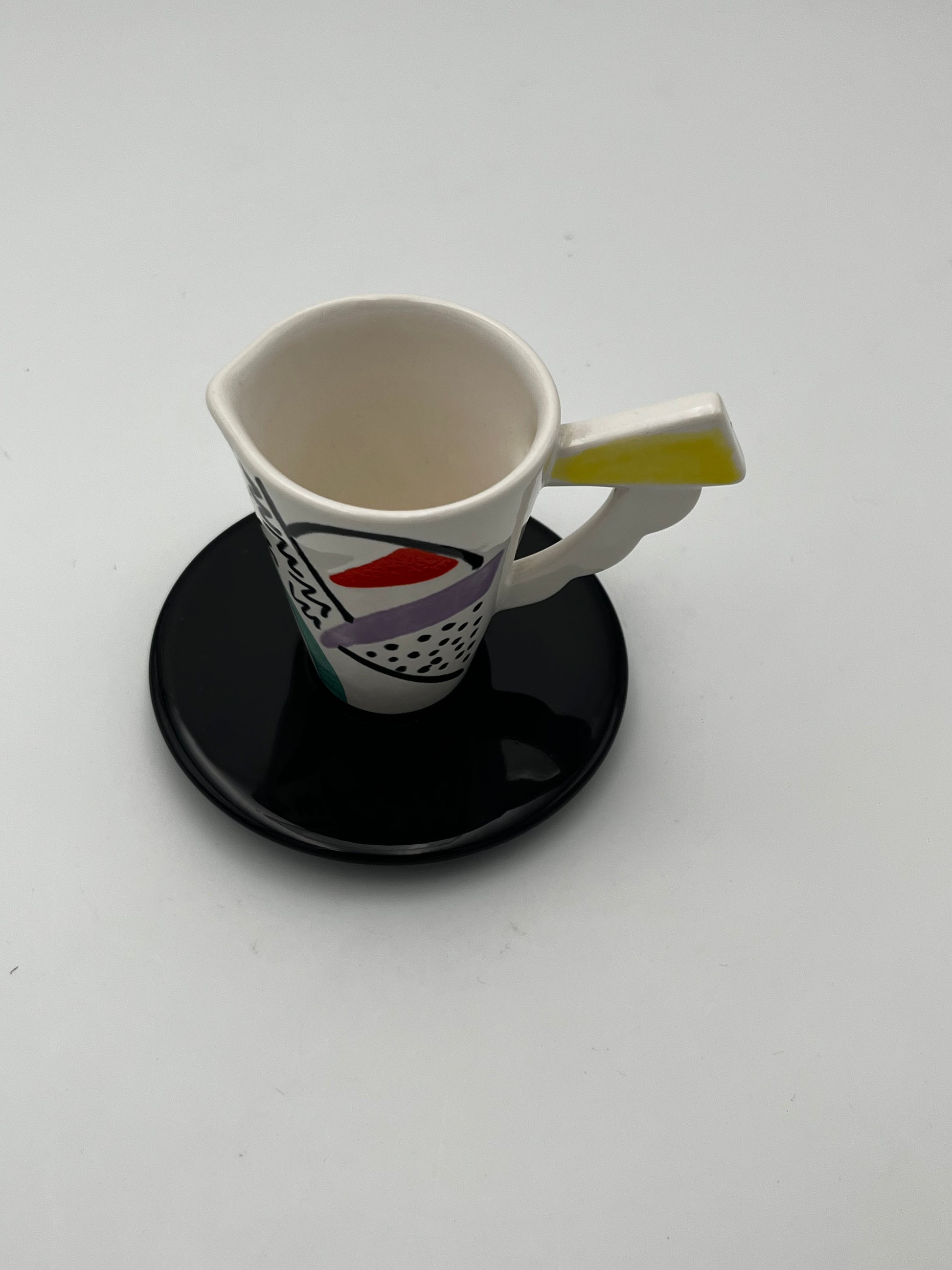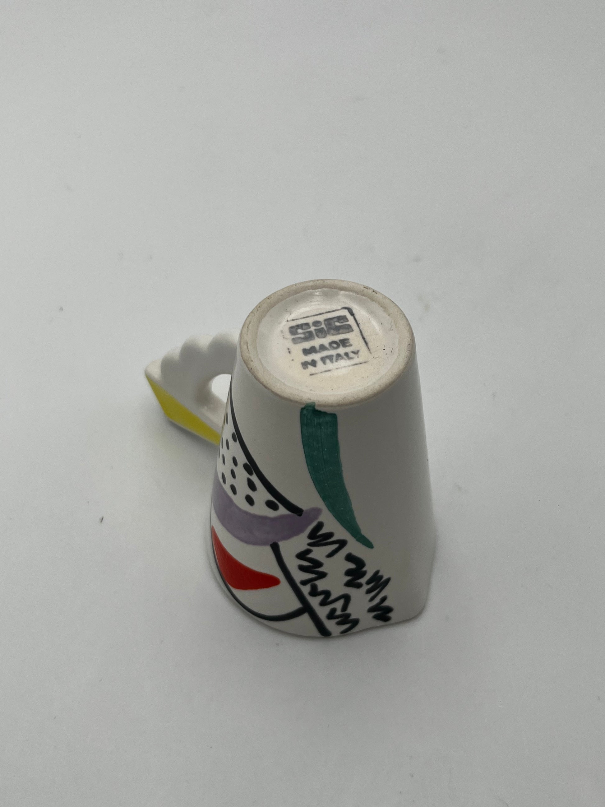 Ce set à café en céramique de couleur blanc avec details multicolores de la marque Sic, conçu dans les années 70 en Italie, est un véritable exemple de design Memphis, allié à la dolce vota italienne.