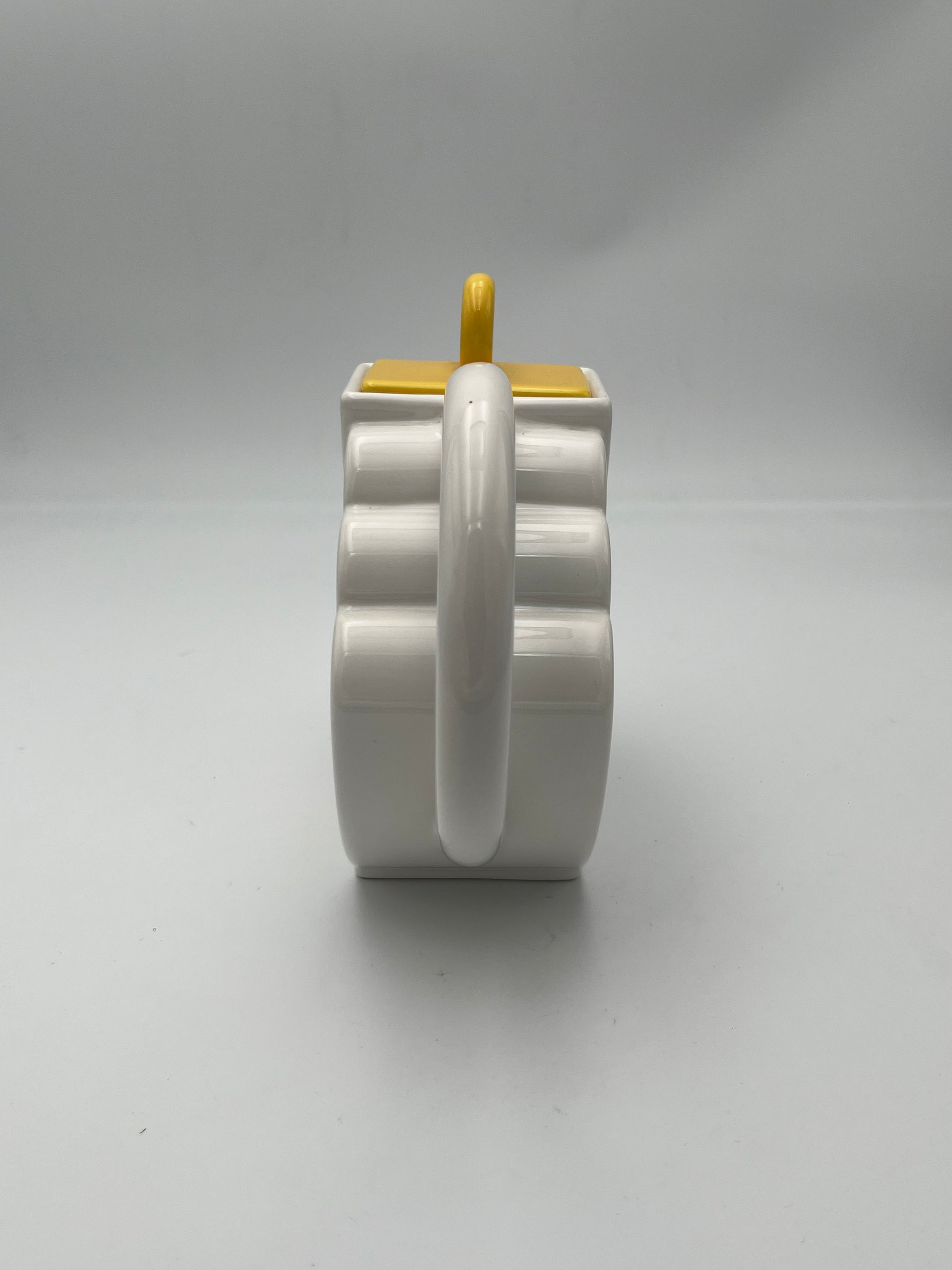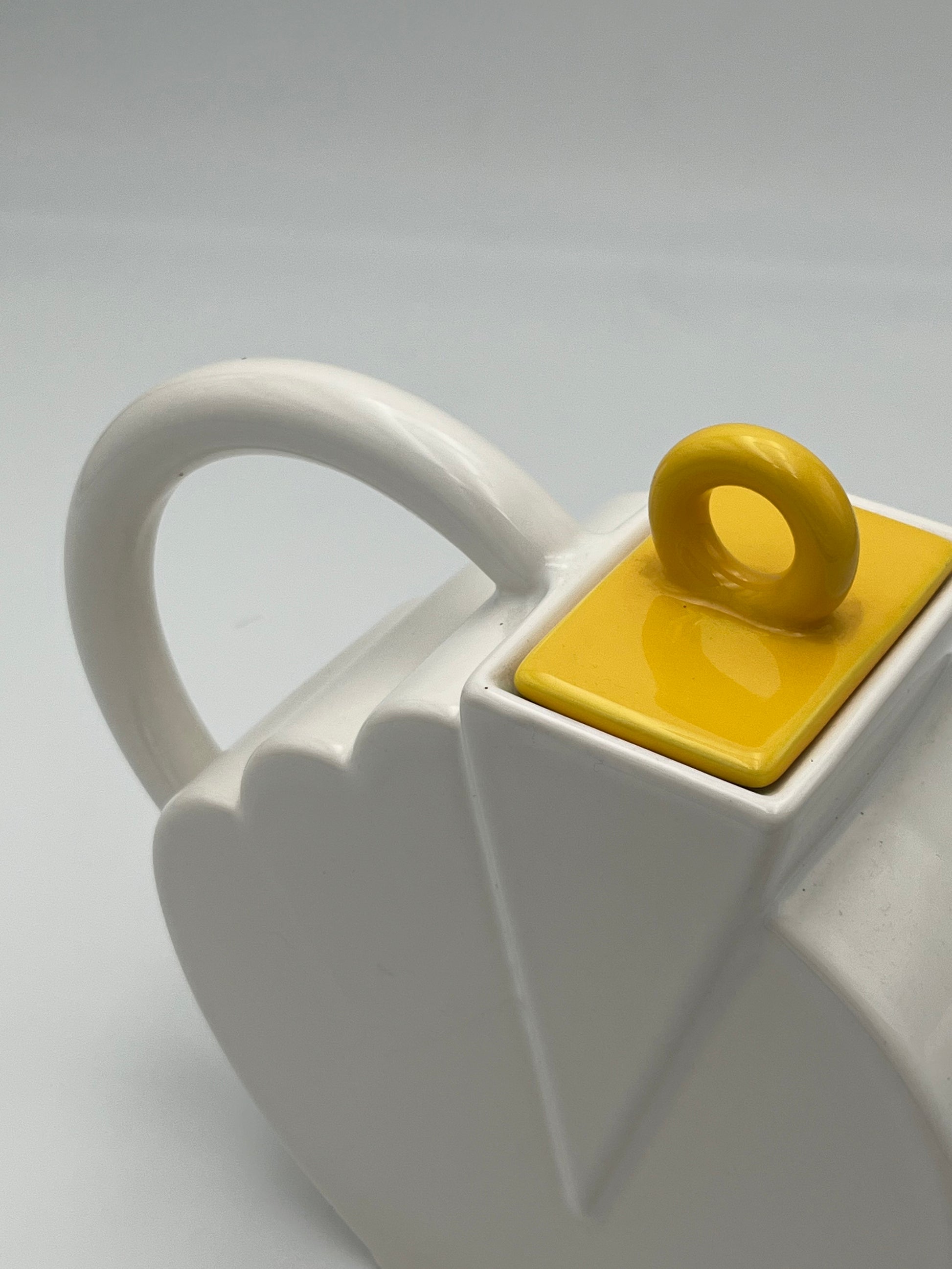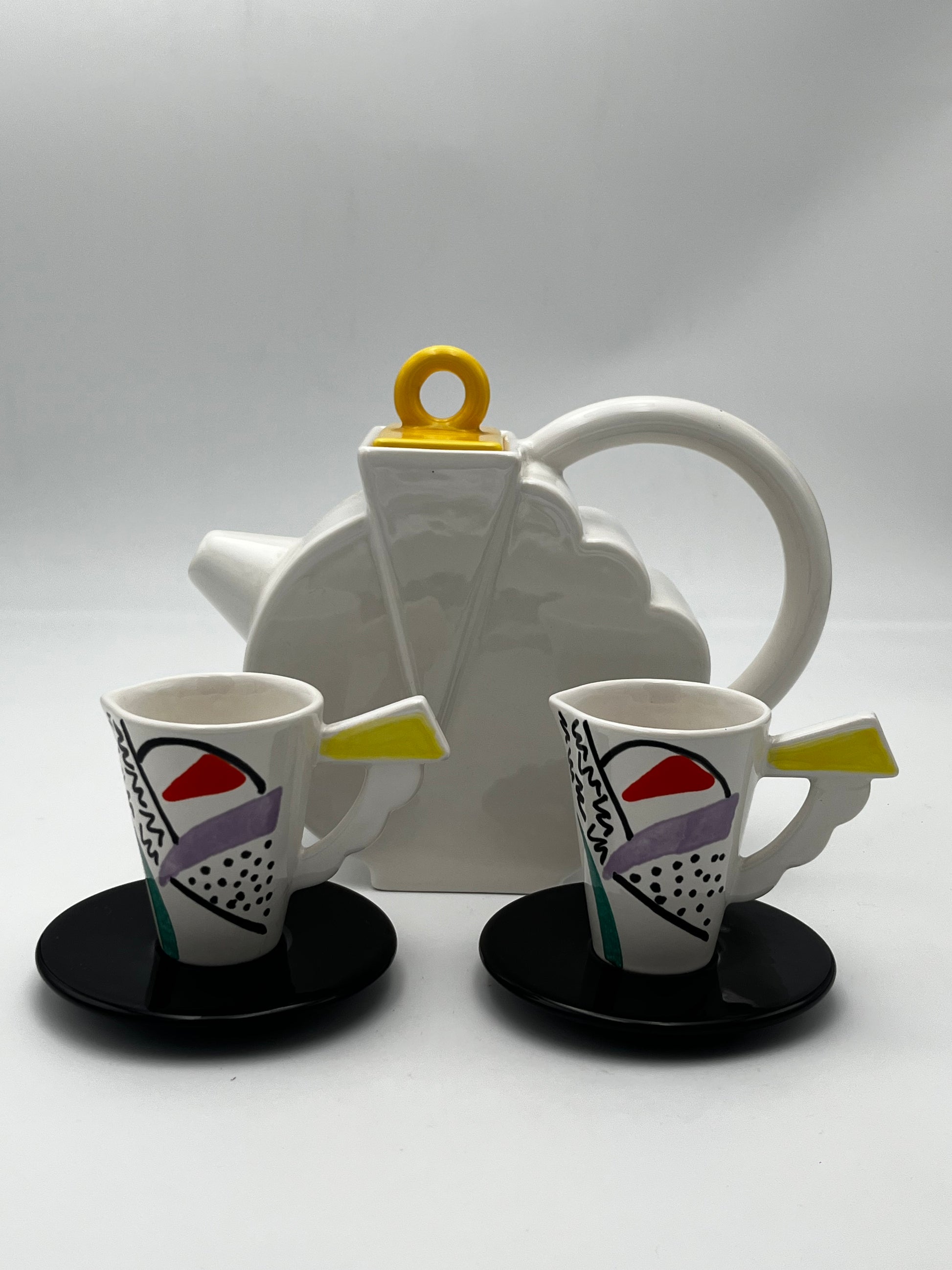 Ce set à café en céramique de couleur blanc avec details multicolores de la marque Sic, conçu dans les années 70 en Italie, est un véritable exemple de design Memphis, allié à la dolce vota italienne.