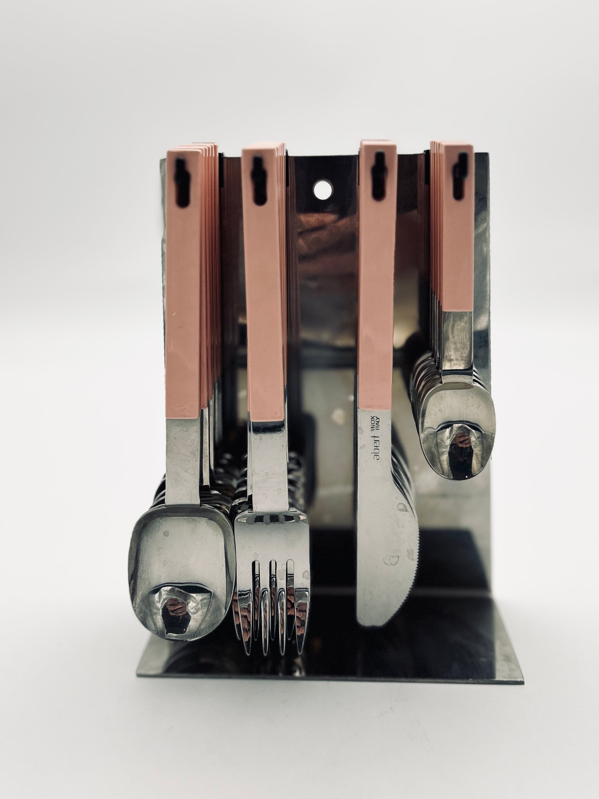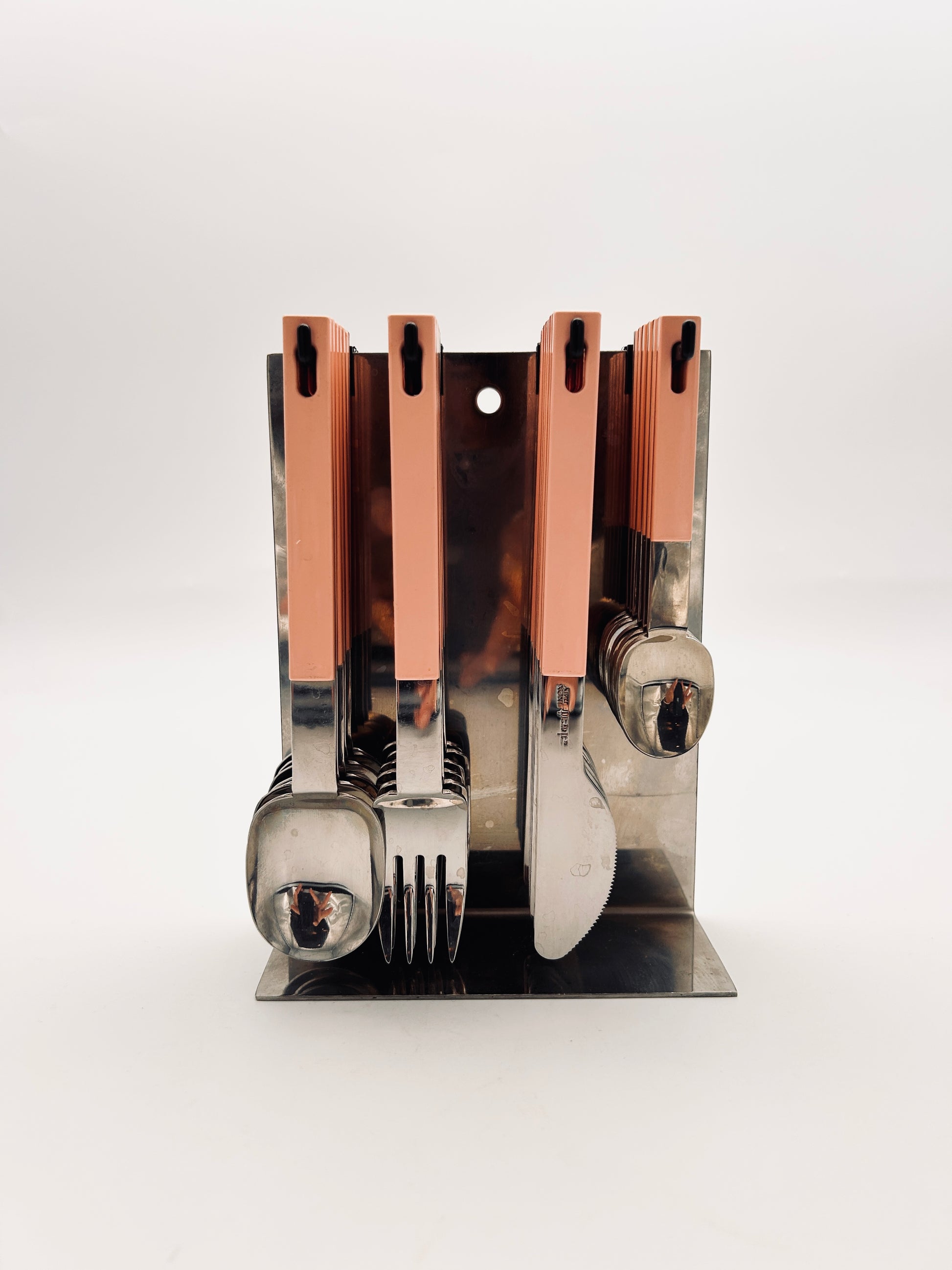 Ce set de 24 couverts avec support en métal, produit par la marque Abert datant des années 70 est un symbole du design pop age.