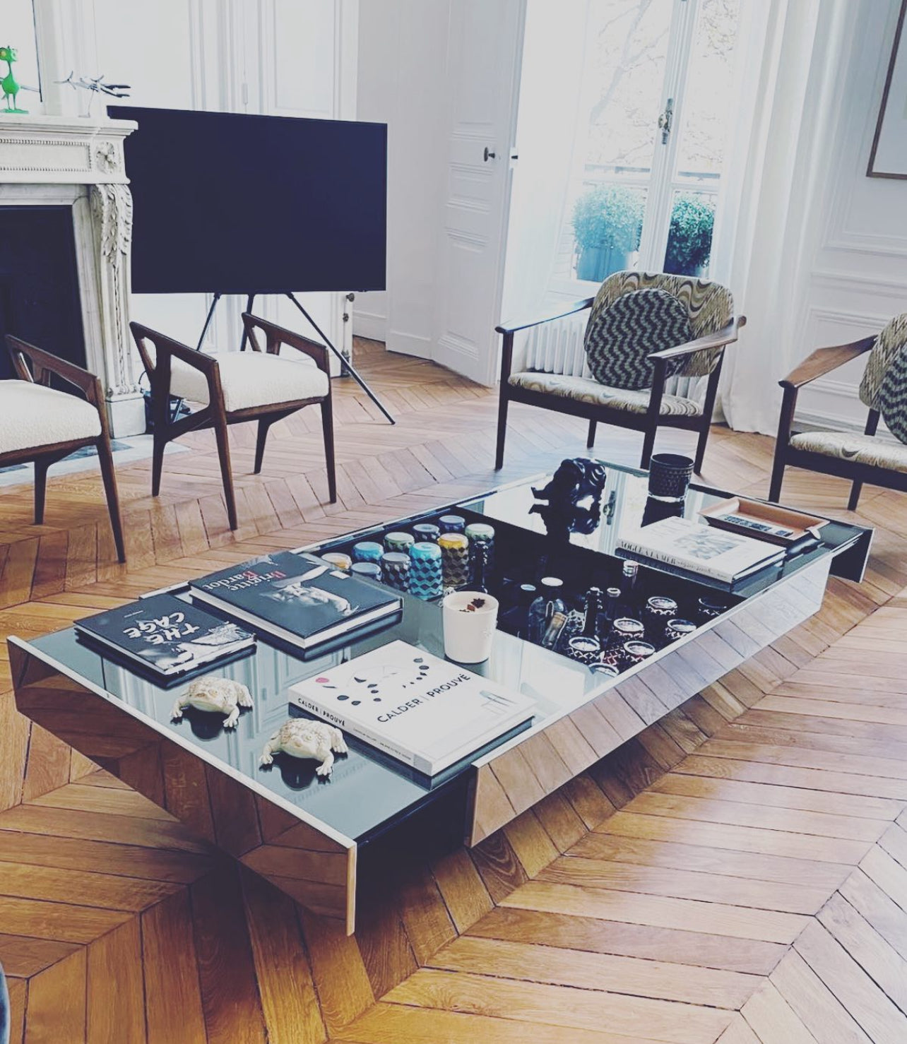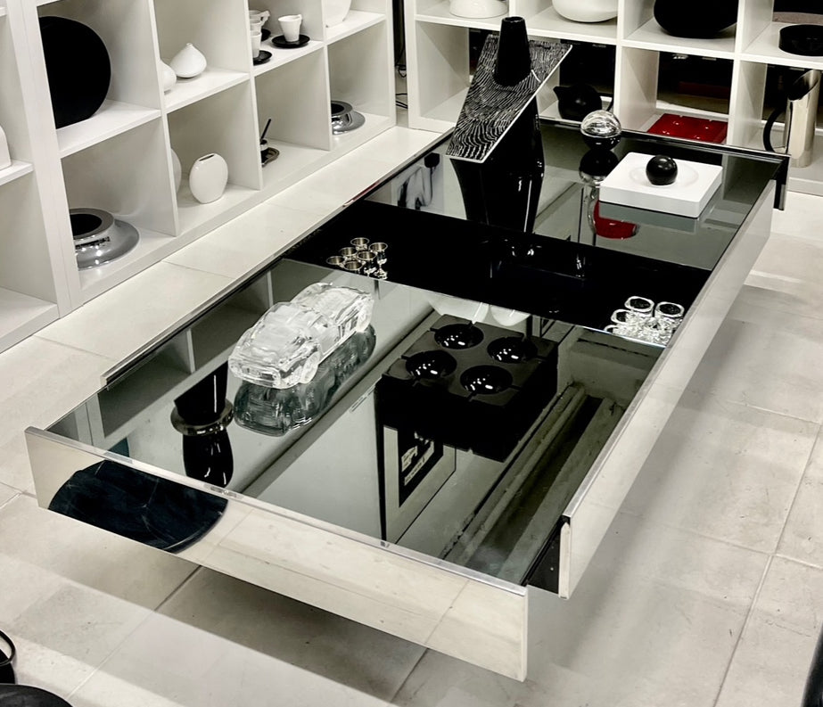 En coulissant, le plateau révèle un compartiment de bar caché, comprenant un espace en miroir pour ranger bouteilles et verres.