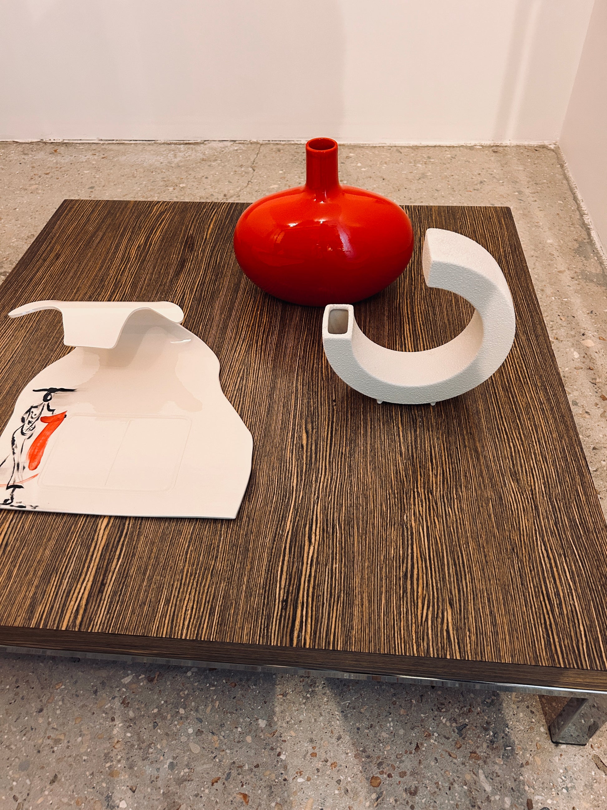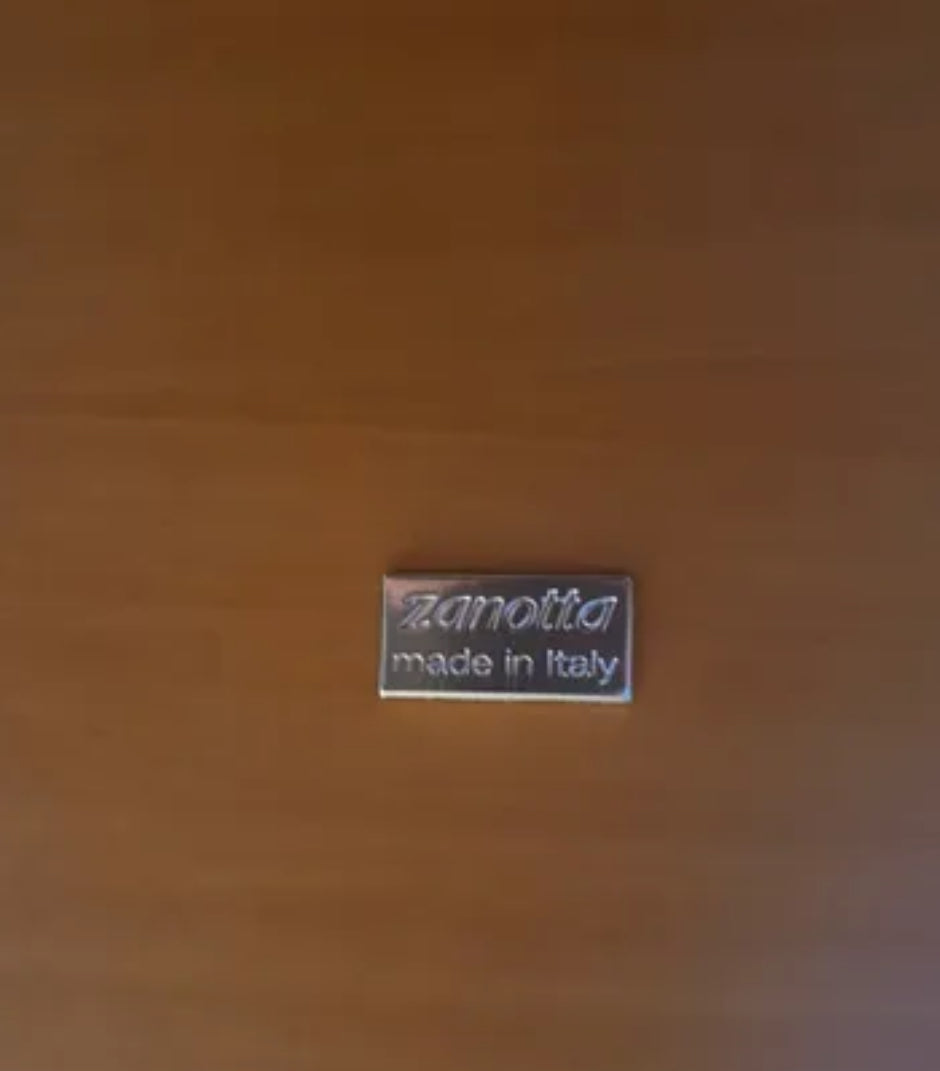 Cette superbe table basse plateau en bois et pieds acier est signée Zanotta.