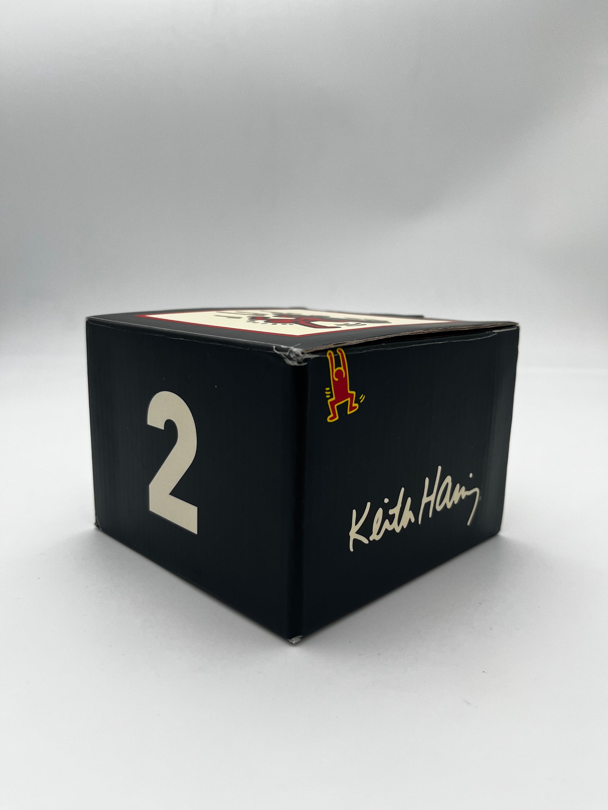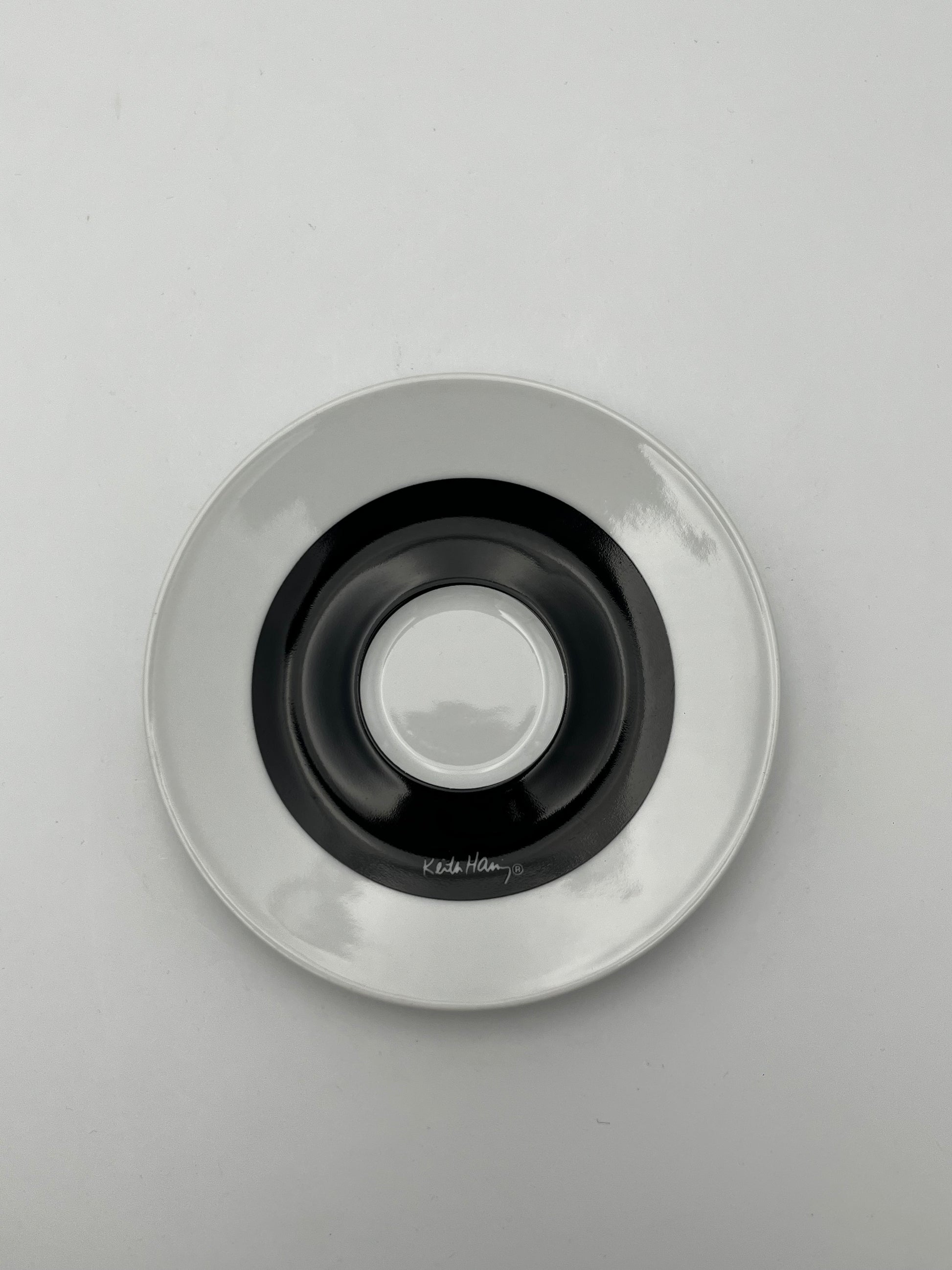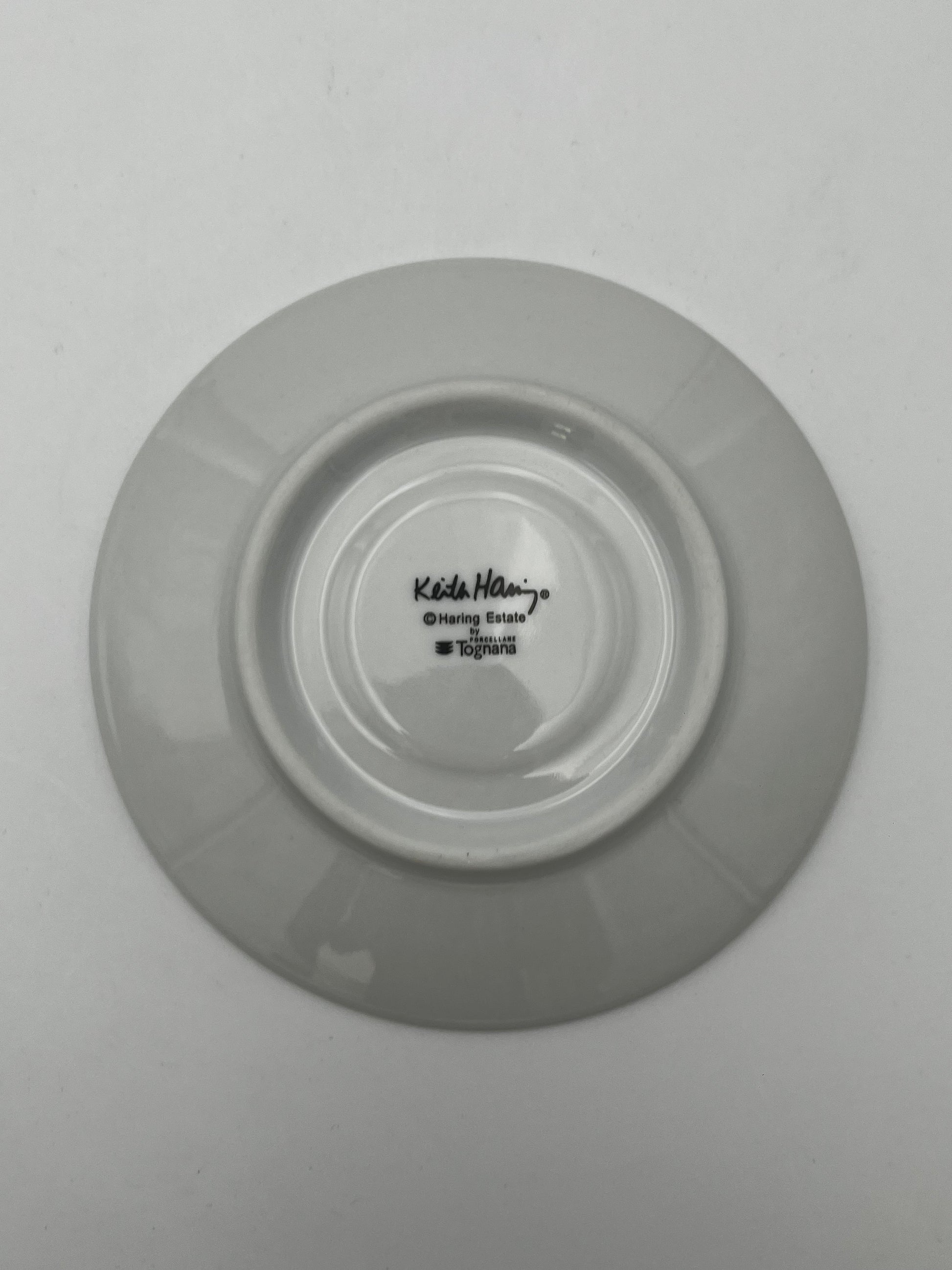 Tasse et soucoupe à café en porcelaine de la marque Tognana, conçue par Keith Haring en 2007. Leur couleur blanche met en valeur les détails street et ludiques, caractéristiques du style emblématique de Haring.